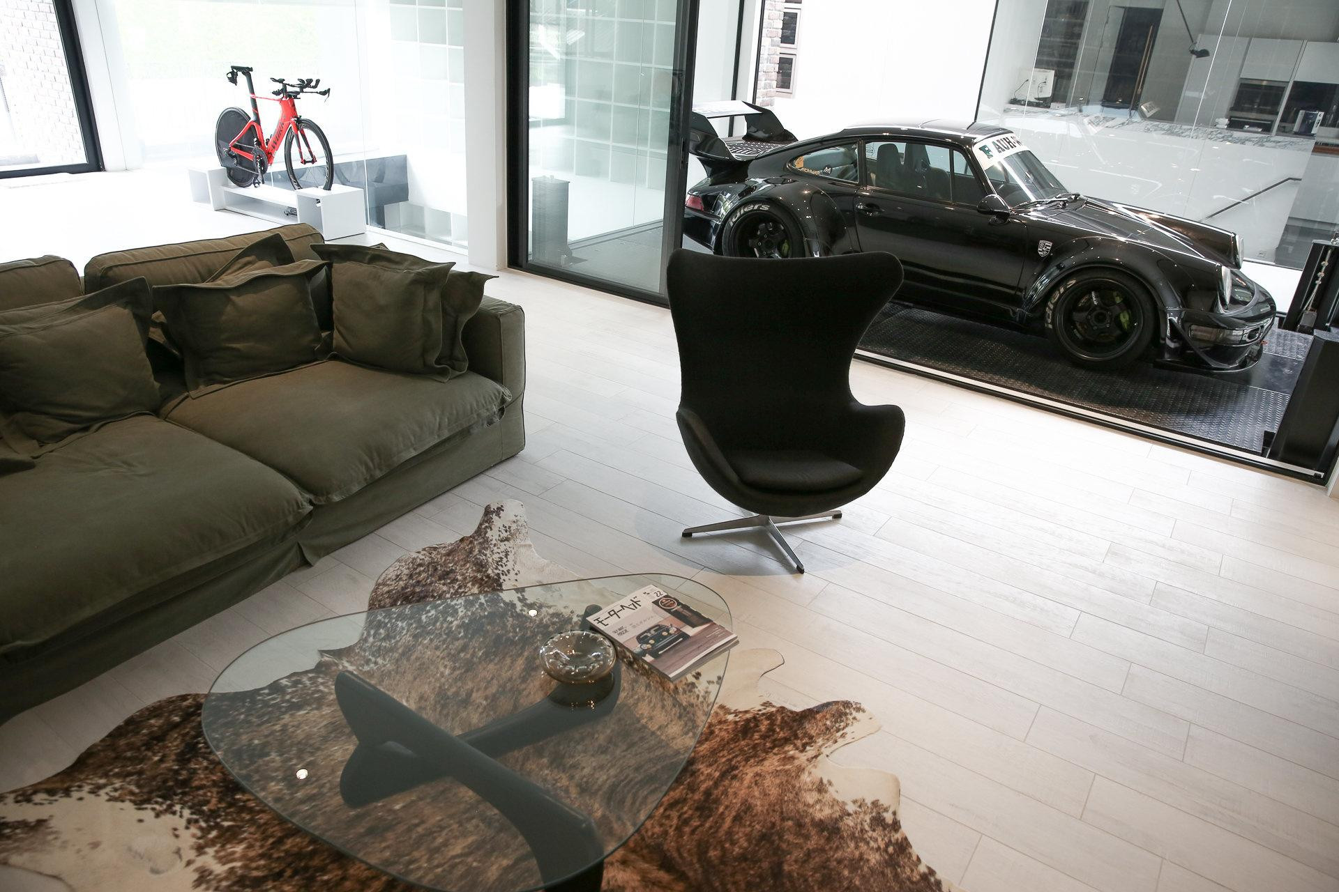 Unatoč hladnim materijalima - staklu, betonu i čeliku - prostor ne djeluje sterilno. Toplinu unose svjetlo, prirodno drvo i minimalistički namještaj izrađen po mjeri. U središtu prizemlja nalazi se veliki stol od tikovine koji služi i kao radna površina, a iza njega je kuhinja, skrivena iza tamnih panela. Sve odiše suptilnim luksuzom i preciznošću, baš kao i automobili koji ga okružuju.