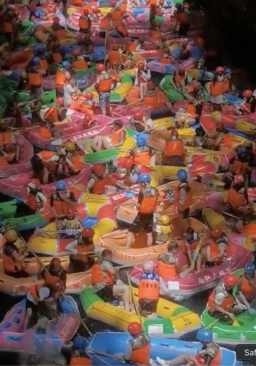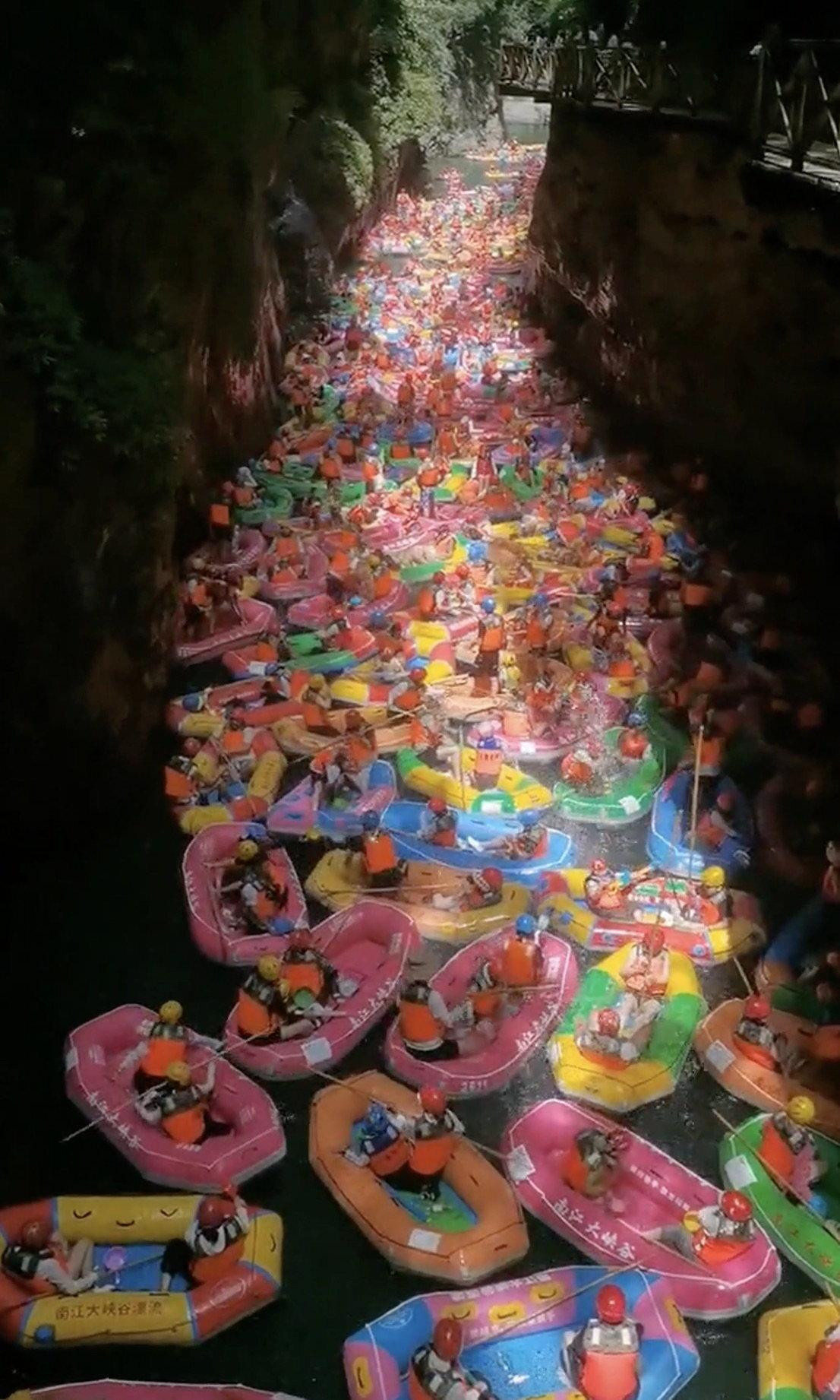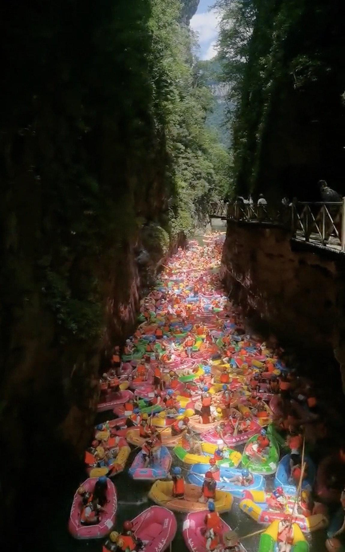 S drugog kraja svijeta dolaze fotografije koje svjedoče da takav ‘sretni svršetak‘ ne čeka sve turiste. Naime, iz kineske provincije Guizhou u svijet su otišle spektakularne, ali i pomalo klaustrofobične scene jednog malo drukčijeg turističkog krkljanca. Ondje se krajem srpnja dogodila nesvakidašnja situacija: više stotina turista ostalo je zaglavljeno u gumenim čamcima usred popularnog raftinga kroz kanjon Nanjiang.