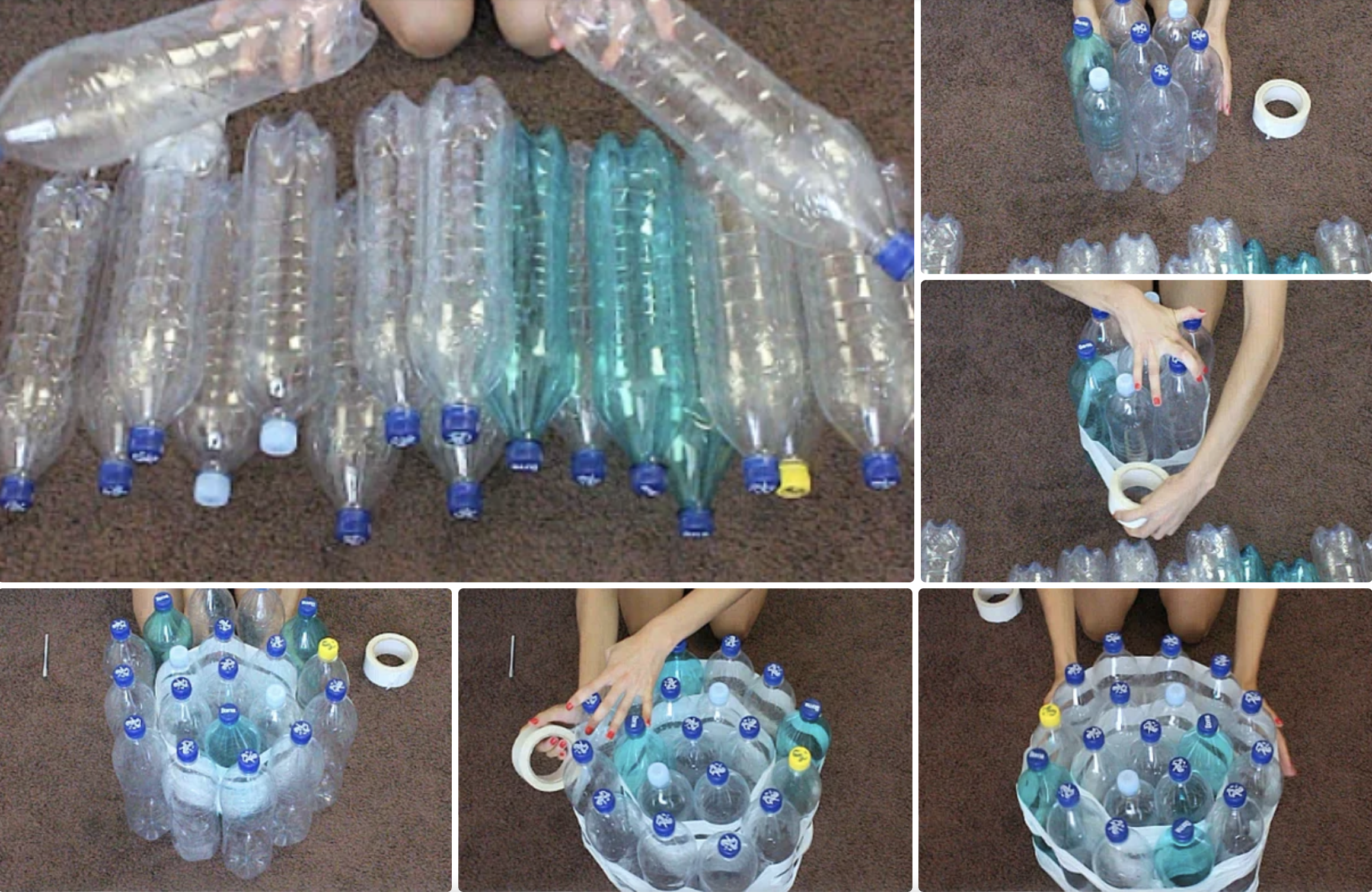 1. Prvo posložite 7 plastičnih boca u krug i učvrstite ljepljivom trakom. Zatim dodajte još 12 boca i sve ih učvrstite trakom.