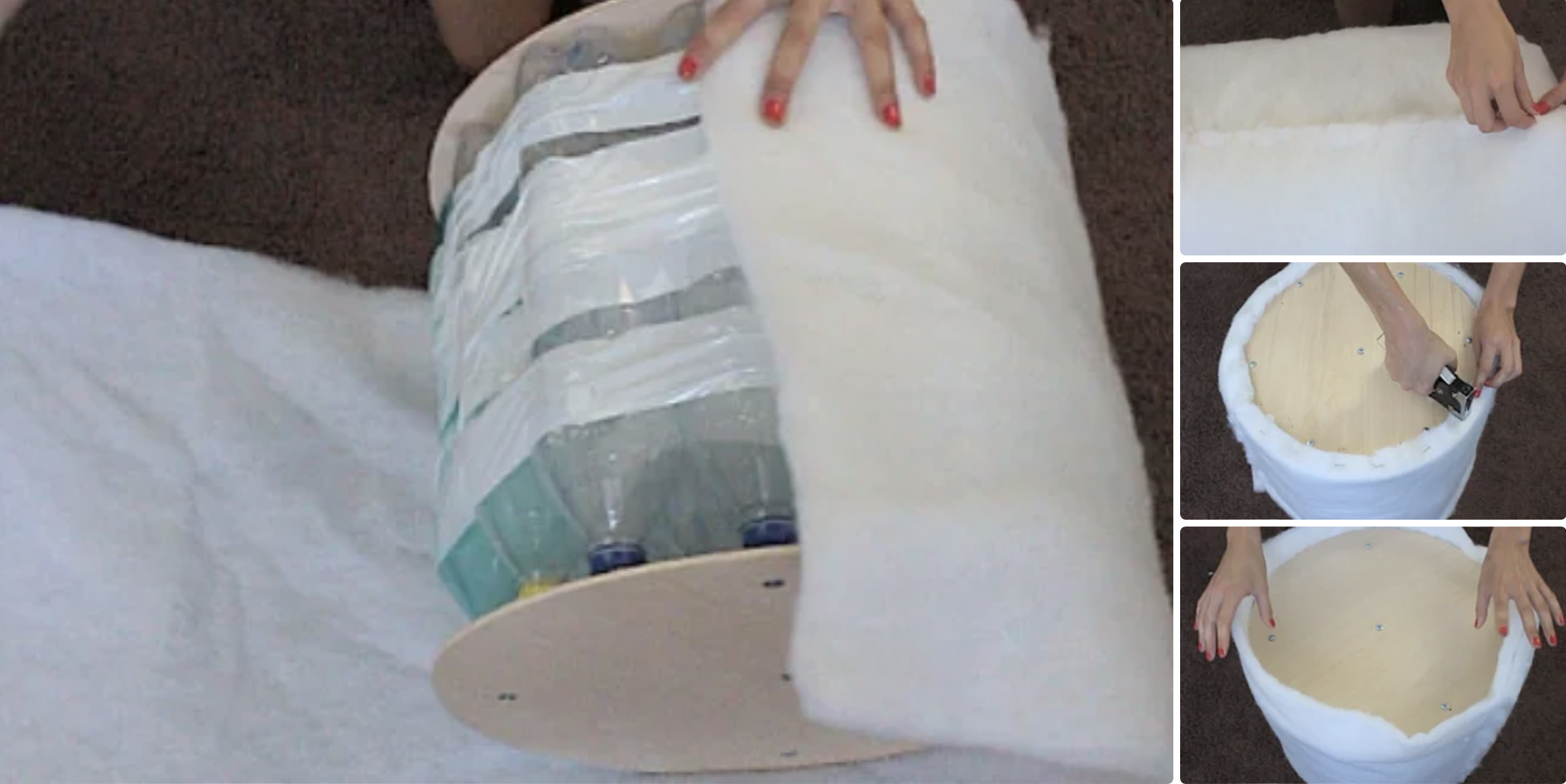 U ovom članku pogledajte kako napraviti praktičan tabure koji će se svidjeti i odraslima i djeci. Proces izrade je toliko jednostavan da ga mogu svladati i osobe s minimalno iskustva. Za izradu vam treba 19 identičnih plastičnih boca od 1,5 ili 2 litre, ljepljiva traka, ljepilo ili vijci, šperploča ili debeli karton, klamerica za tekstil, igla i konac, poliesterska vata i poliesterska tkanina.