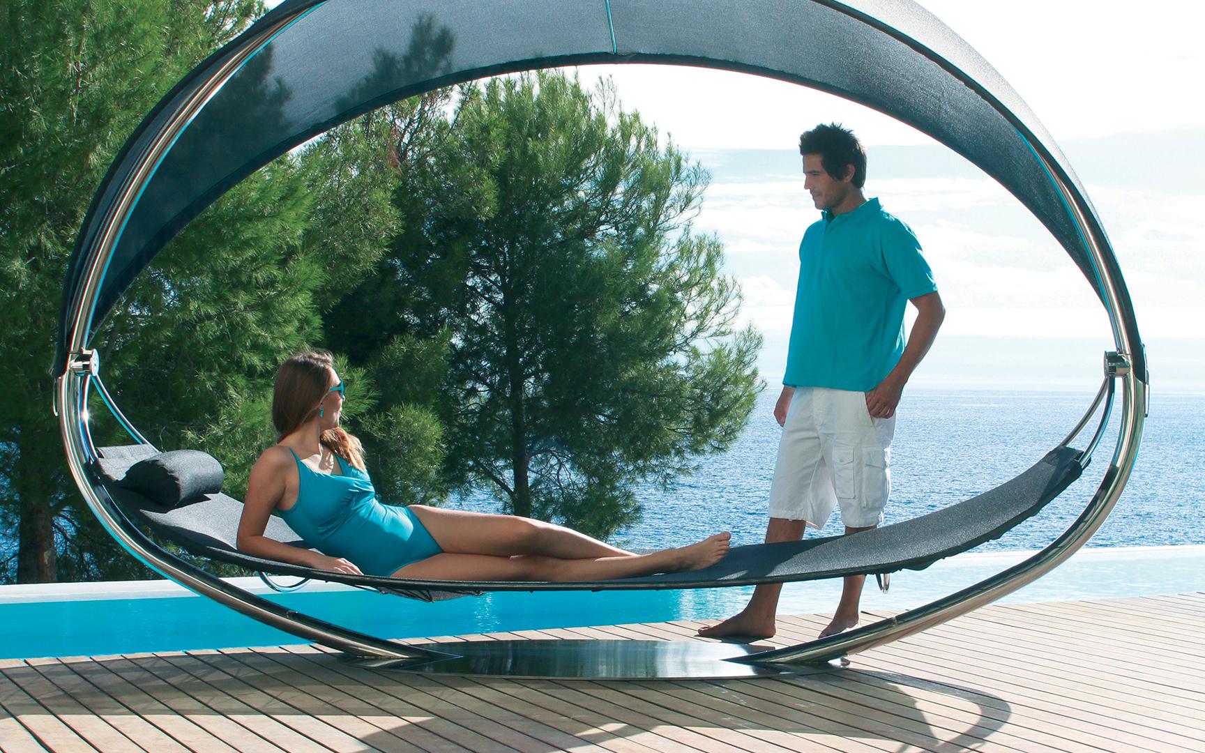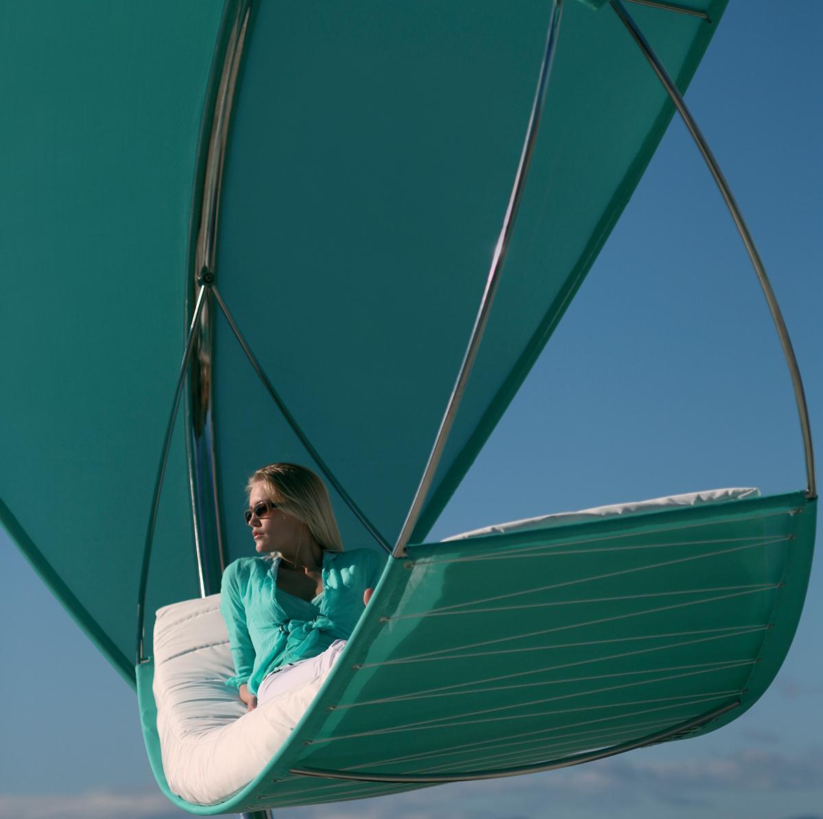 Dragulj njihove dizajnerske kolekcije je ova prekrasna moderna viseća mreža: The Wave. Fizička napetost postaje vizualna napetost u ovoj nevjerojatno lebdećoj lučnoj formi koja se sastoji od jednostavnih zakrivljenih metalnih nosača povezanih potpornom tkaninom i nadstrešnicom iznad.