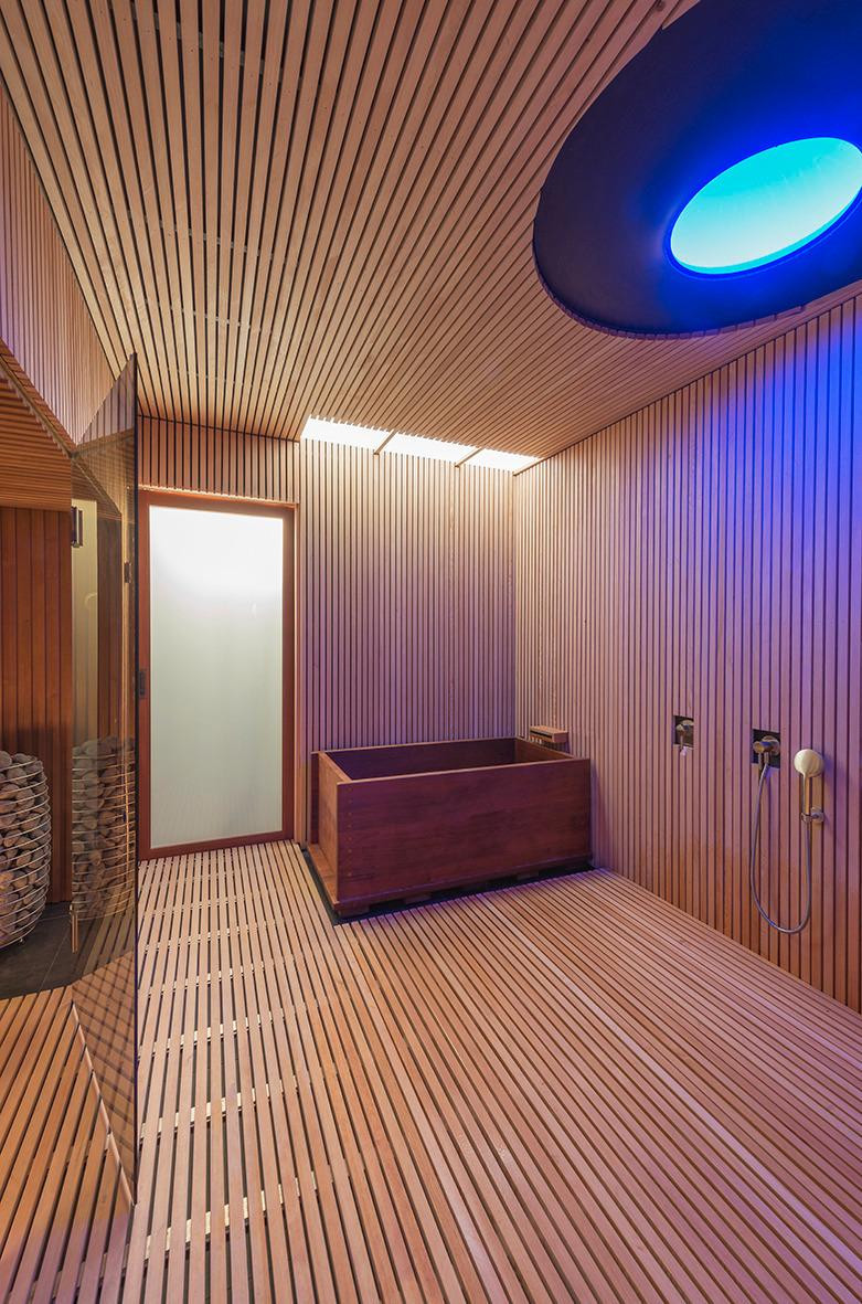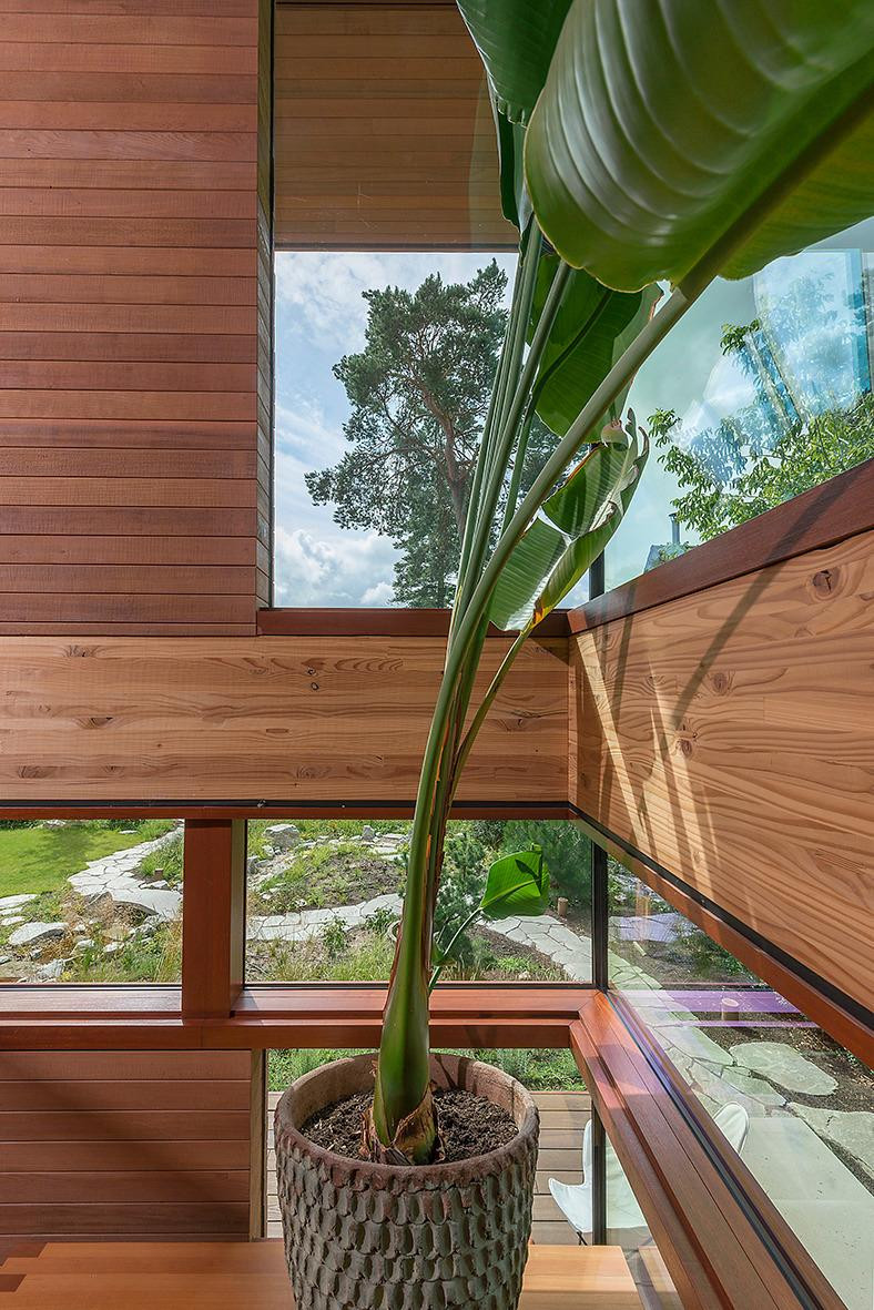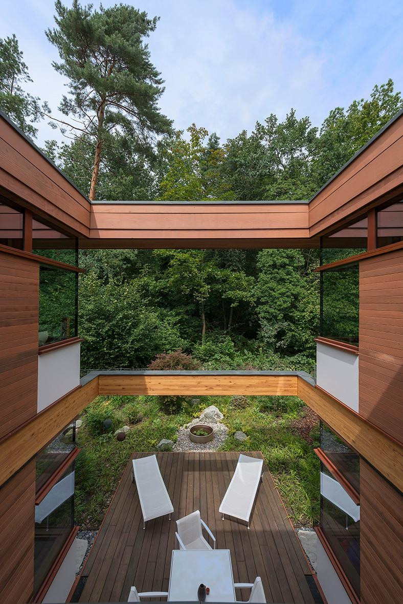 Kuća nudi oko 370 četvornih metara stambenog prostora raspoređenog na dvije etaže. Prostor se otvara kroz atrij, dnevni boravak s dvostranim kaminom, četiri spavaće sobe, dvije kupaonice, saunu, kućno kino i studio. Ono što je uistinu posebno jest osjećaj da se prostori ne završavaju zidovima, već umjesto toga prelaze u terasu, vrt, pa čak i šumu uokolo.