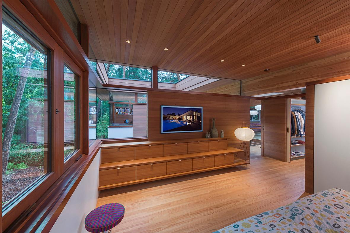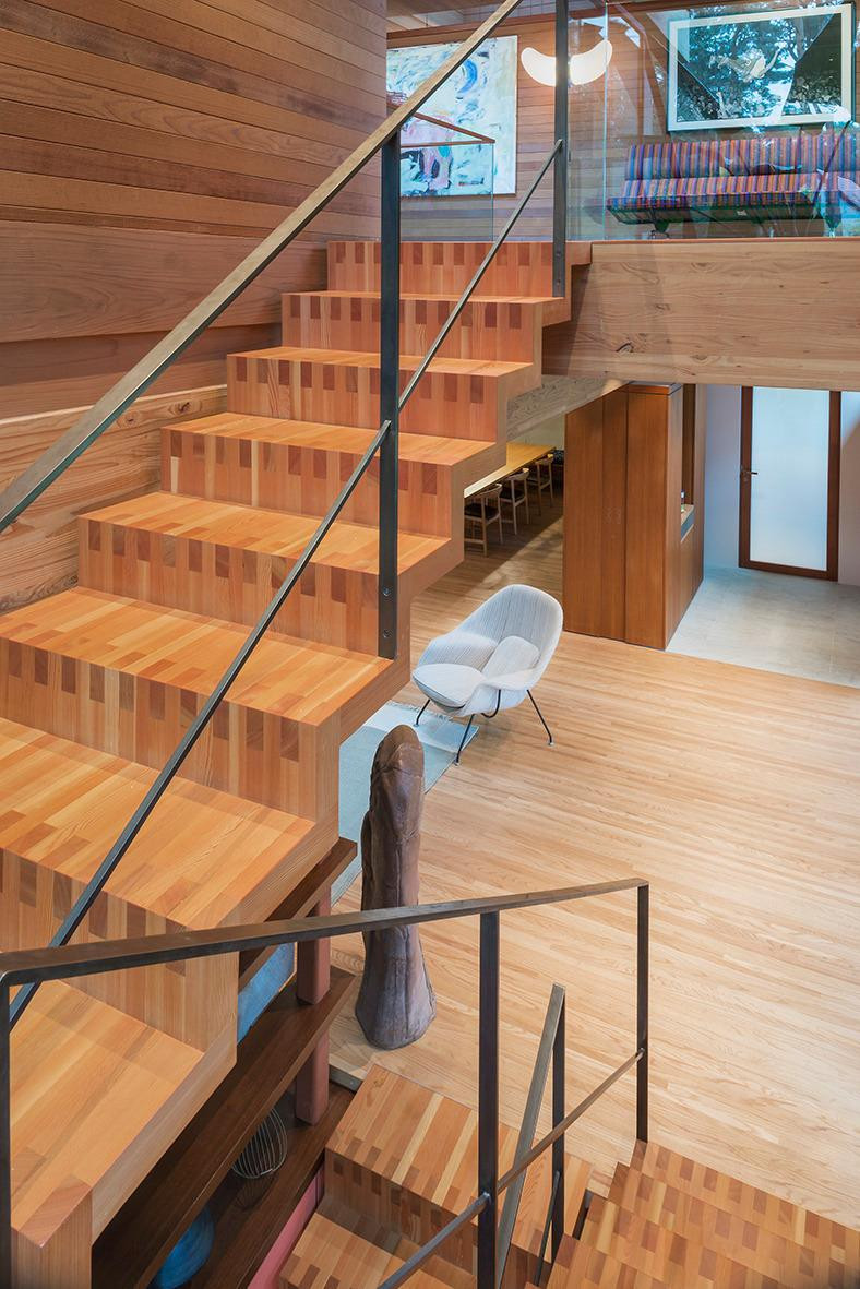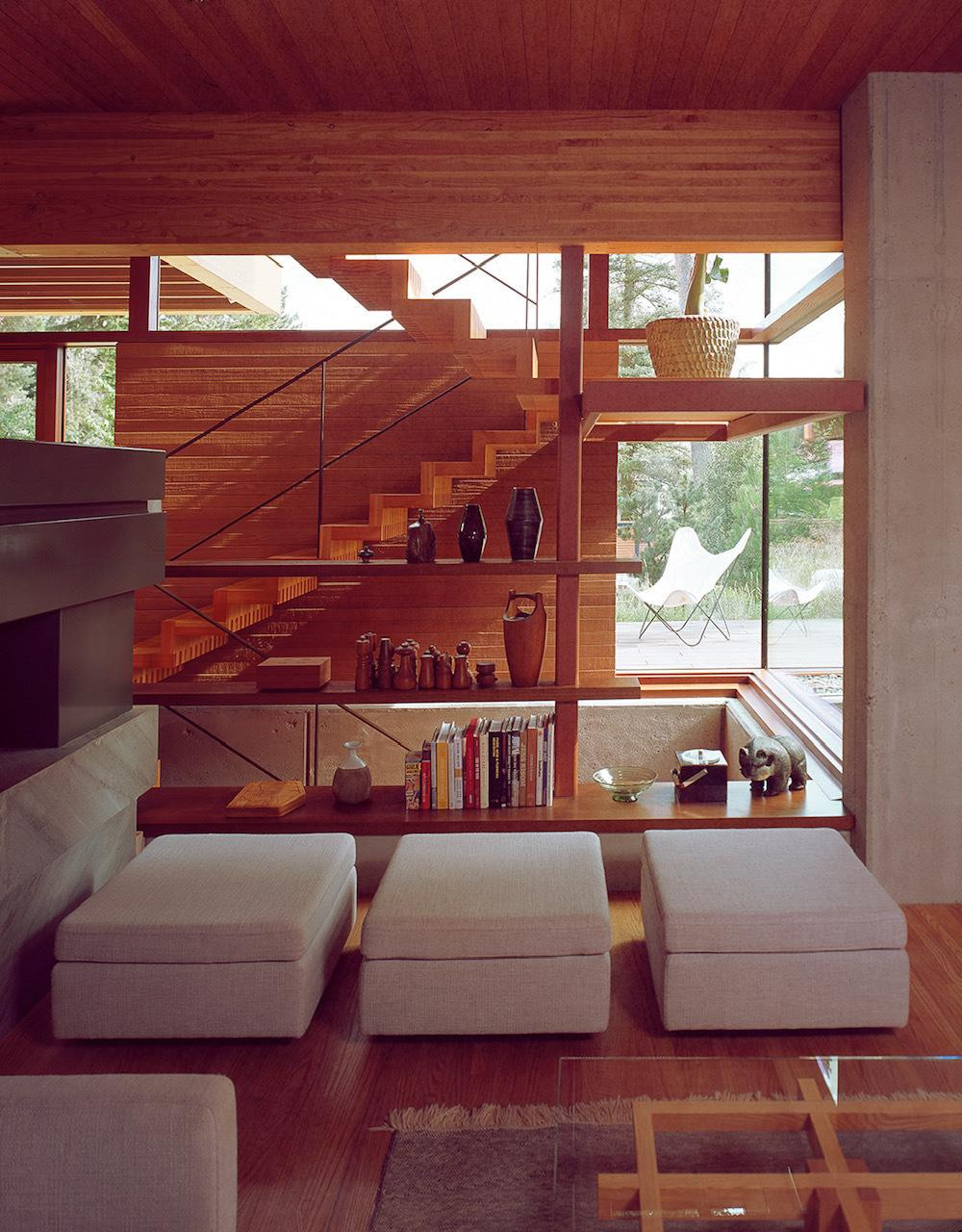 Arhitektonski potpis Raya Kappea jasno se vidi: post-and-beam konstrukcija, prostorna fluidnost, višeslojni prijelazi između unutarnjeg i vanjskog te duboke nadstrešnice koje štite od sunca i kiše. Velike staklene površine upijaju svjetlost i otvaraju kuću prema prirodi, dok toplina drva ublažava modernističku strogoću.