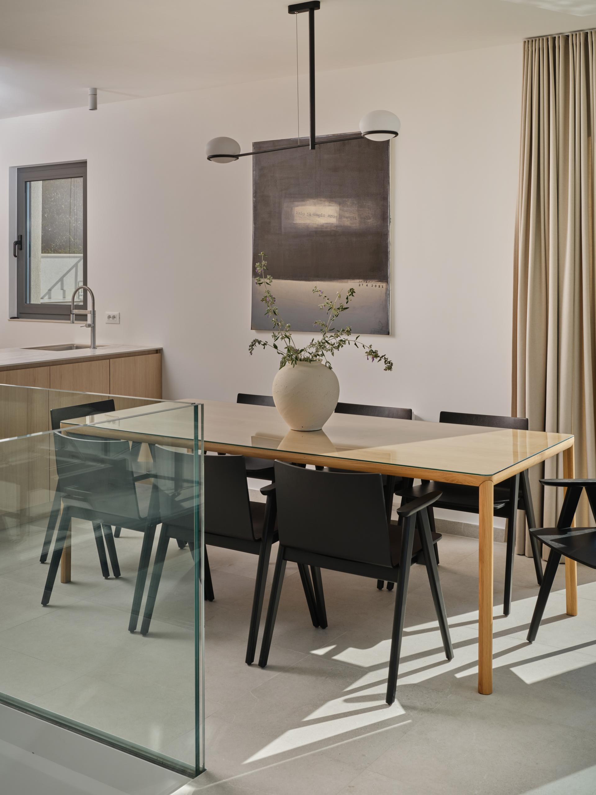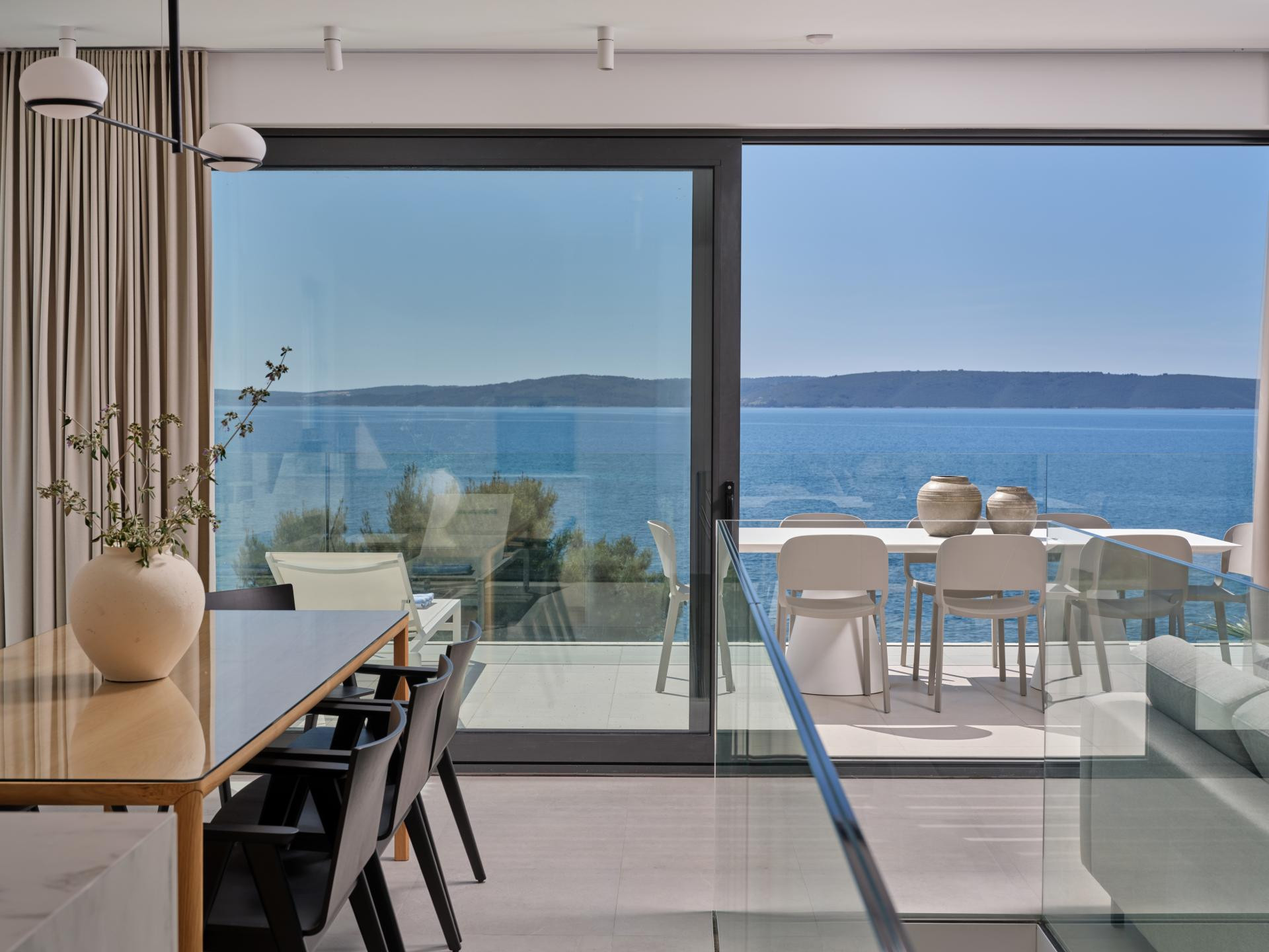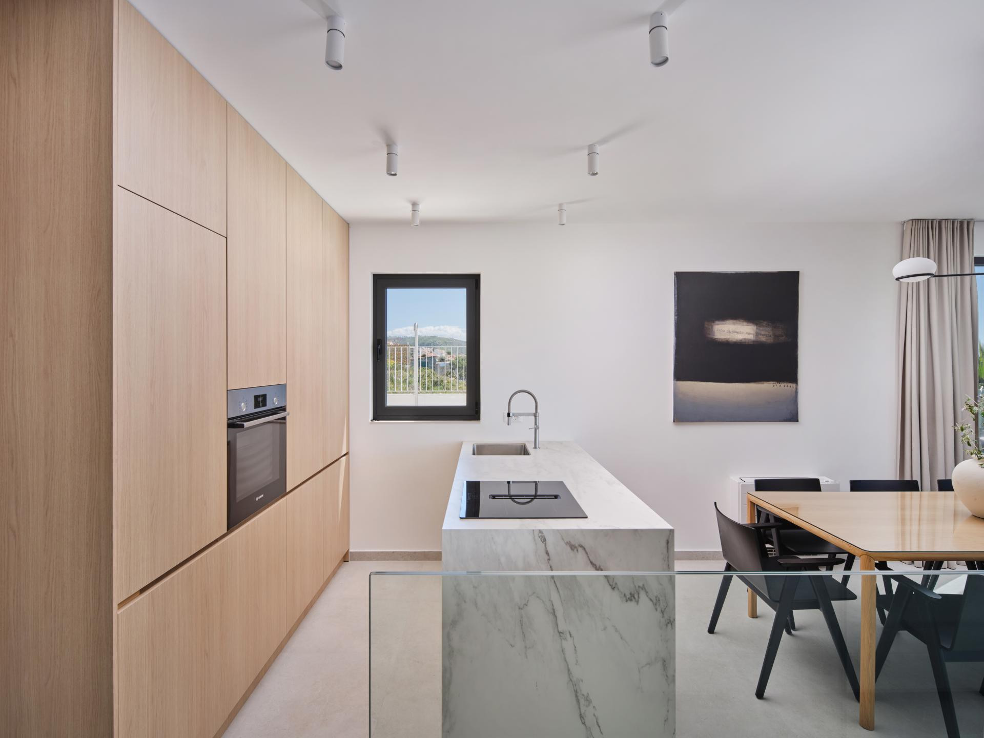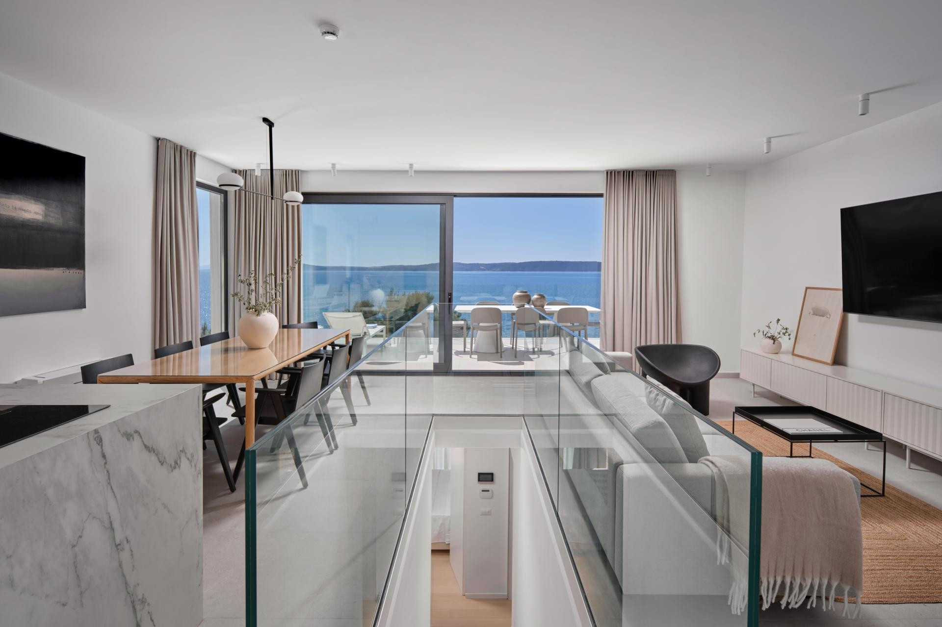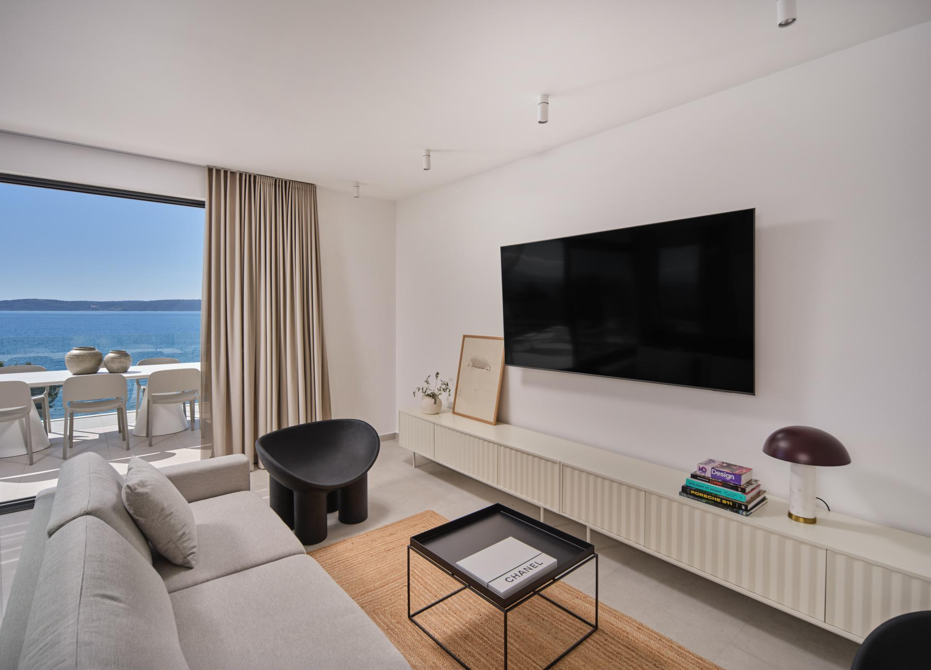 Iako je unutrašnjost uređena u minimalističkom stilu koji je i dalje jedan od vodećih suvremenih pristupa u interijerima, a u ovom primjeru naglašava prirodne materijale i neutralne tonove kako bi se pogled na more zadržao u prvom planu, ona nikako nije bez karaktera. Za takav je ugođaj i estetiku, uz dizajniranje, zaslužan i pažljivo izrađen namještaj po mjeri domaćih majstora. Kreveti i kauč stigli su iz radionice Majcen u Slavonskom Brodu, dok su kuhinja, ormari i stolovi djelo radionice Marangun iz Sinja s kojom Ana surađuje više od deset godina.