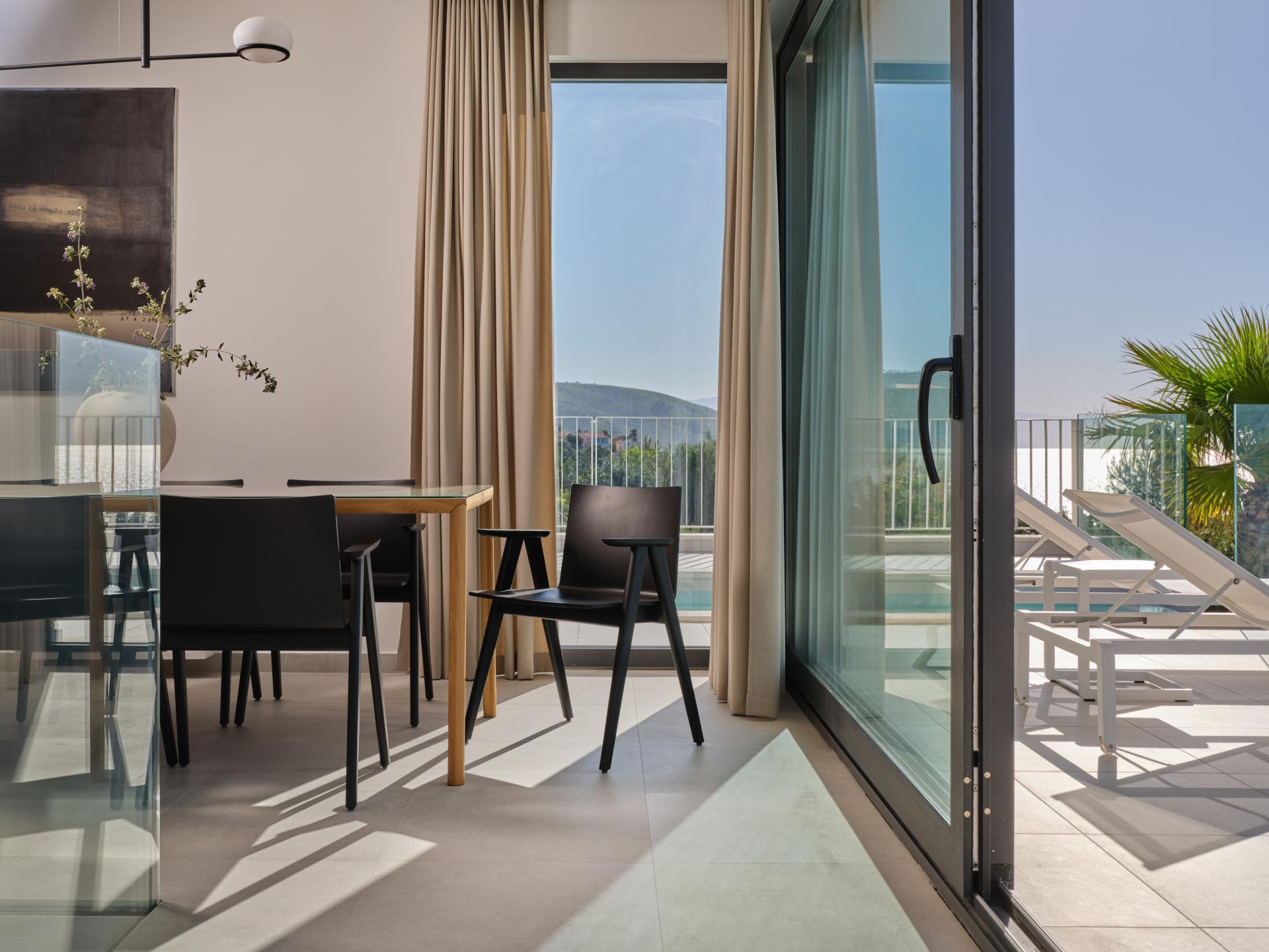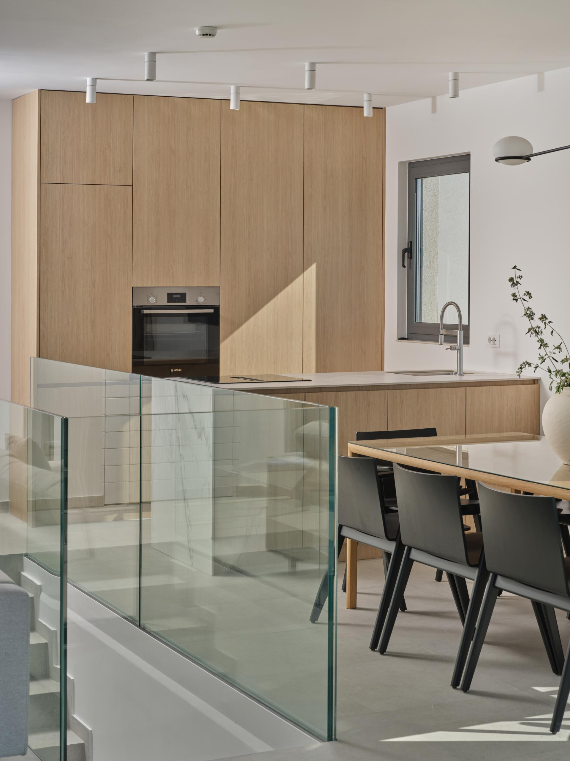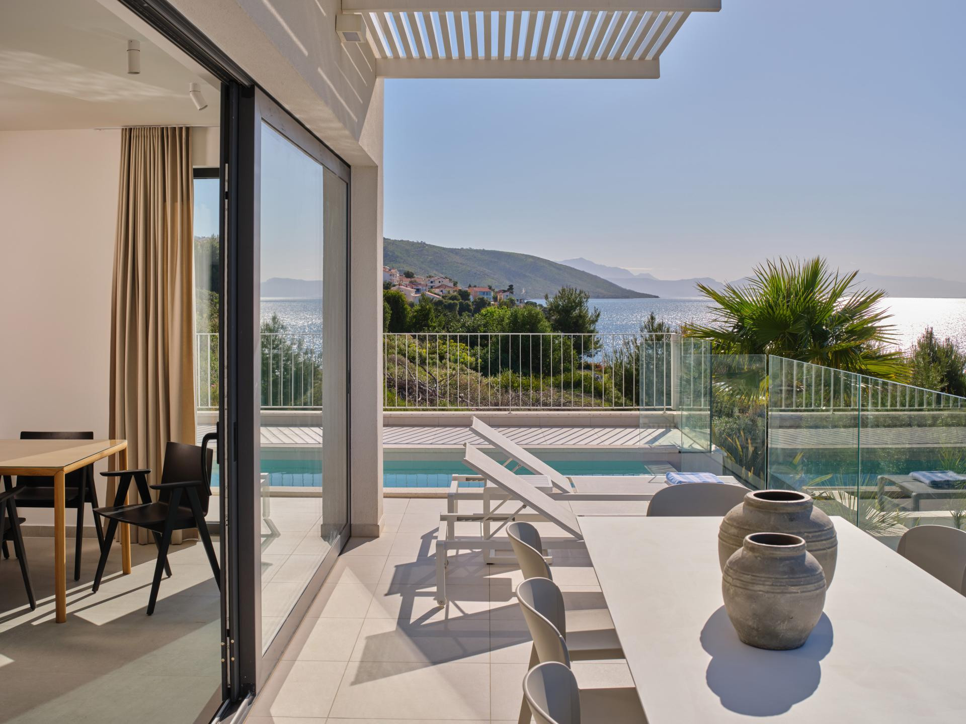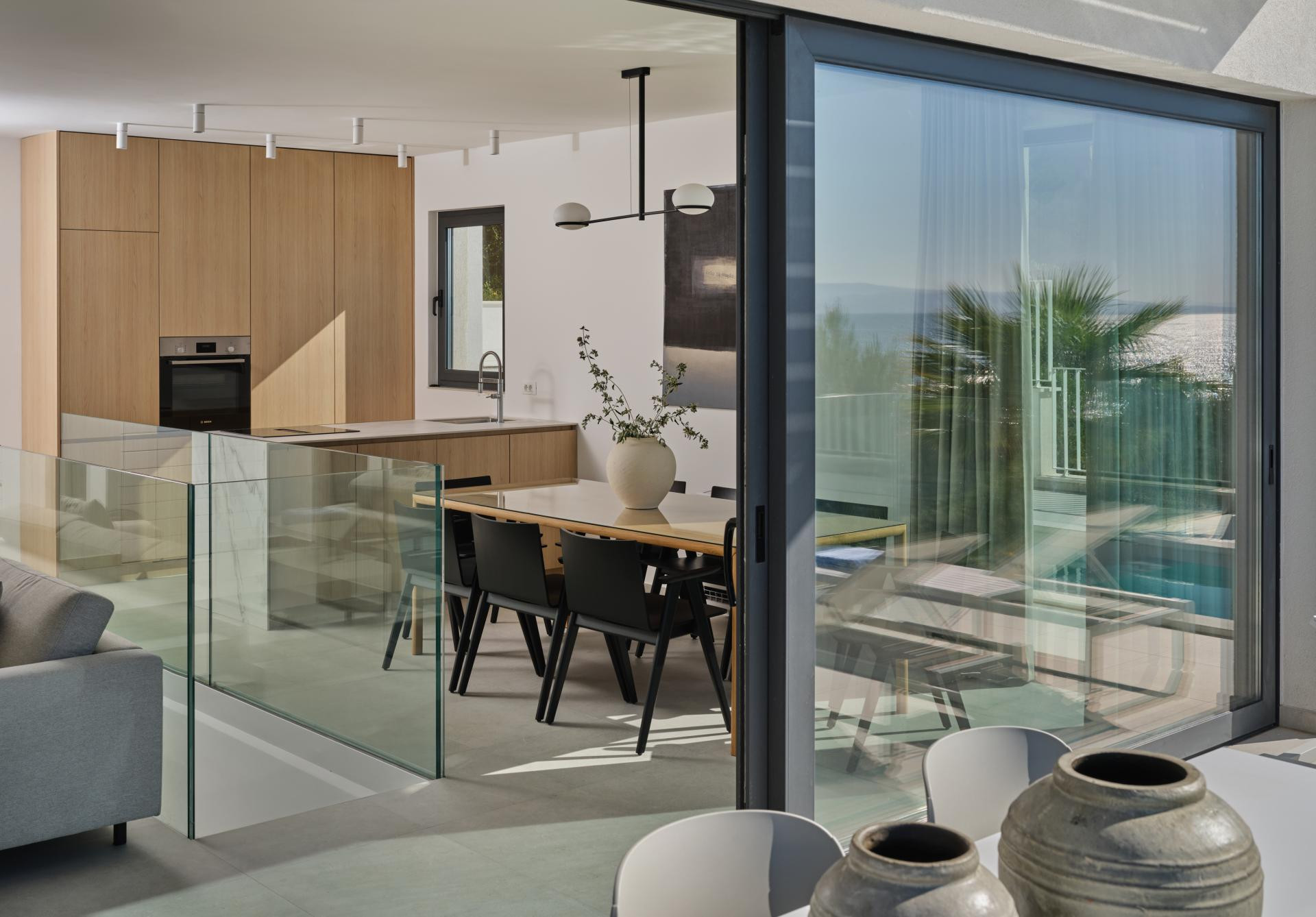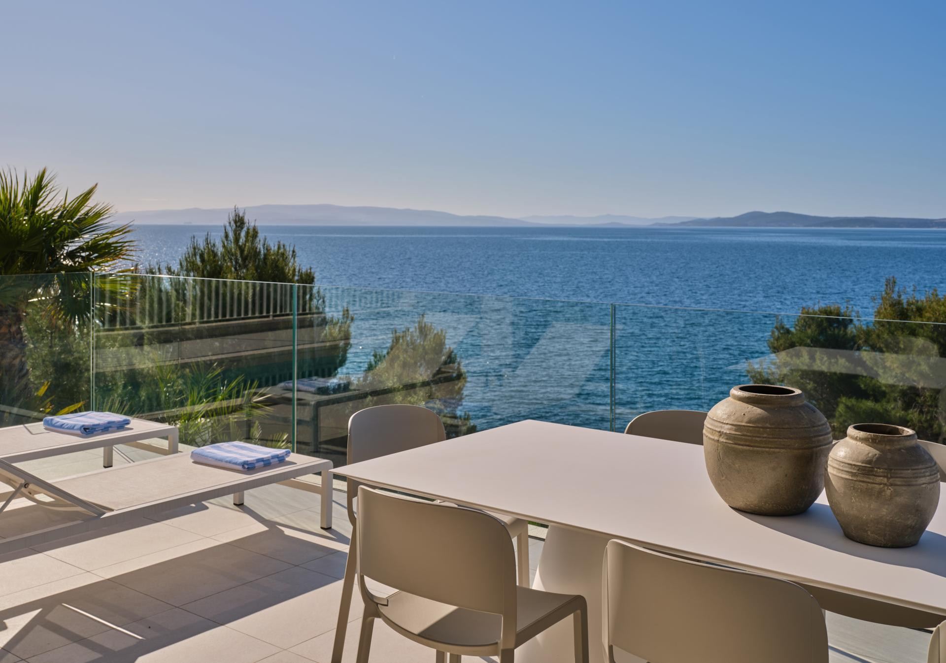 Iako je unutrašnjost uređena u minimalističkom stilu koji je i dalje jedan od vodećih suvremenih pristupa u interijerima, a u ovom primjeru naglašava prirodne materijale i neutralne tonove kako bi se pogled na more zadržao u prvom planu, ona nikako nije bez karaktera. Za takav je ugođaj i estetiku, uz dizajniranje, zaslužan i pažljivo izrađen namještaj po mjeri domaćih majstora. Kreveti i kauč stigli su iz radionice Majcen u Slavonskom Brodu, dok su kuhinja, ormari i stolovi djelo radionice Marangun iz Sinja s kojom Ana surađuje više od deset godina.