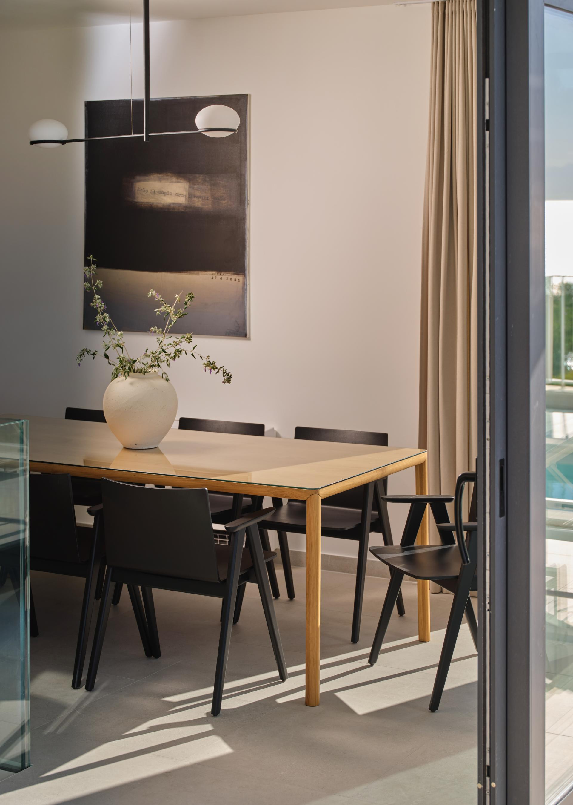 U kući su foteljice Driade Rory Poly, odličan odabir za manje prostore, lounge sjedalice Ferm Living od recikliranog materijala koje pridonose održivosti, hrastov blagovaonski stol Ethnicraft te prepoznatljivi stolci Pedrali. S druge strane, zidove krase umjetnička djela akademske slikarice Roberte Vilić, čiji rukopis prostoru daje jedinstven šarm i toplinu.