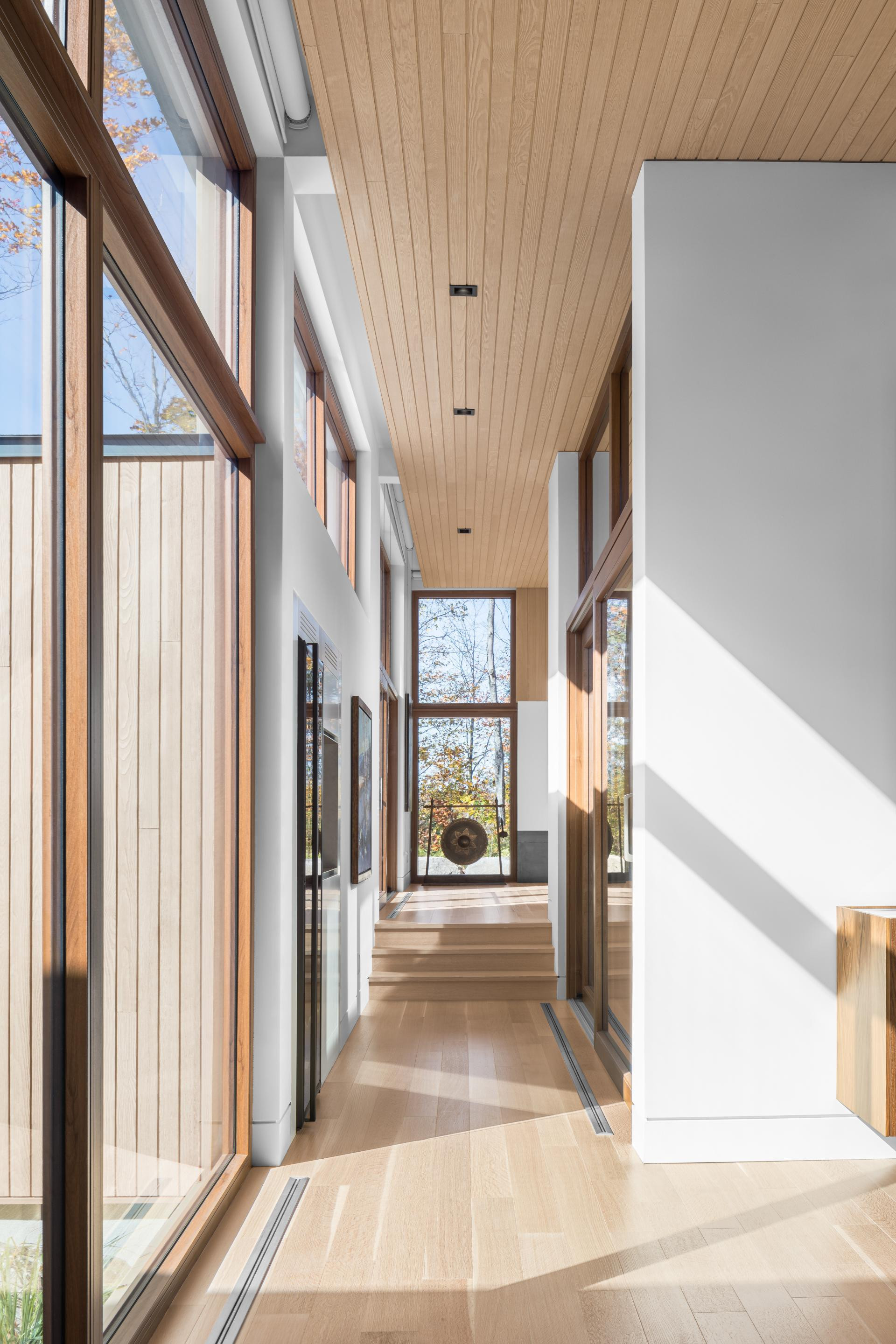Dizajn kuće temelji se na ideji maksimalne povezanosti s prirodom. Ugrađeni su veliki panoramski prozori sa svake strane, čime se prostor otvara prema šumi i svjetlu. Kuća je uska, a prostorije su raspoređene u nizu, što omogućuje ukrštene poglede – s jedne strane otvara se vidik na krajolik, s druge prodire sunčeva svjetlost. Hodnici i putevi kretanja unutar kuće uvijek su paralelni s otvorima, pa pogled prirodno klizi prema van.