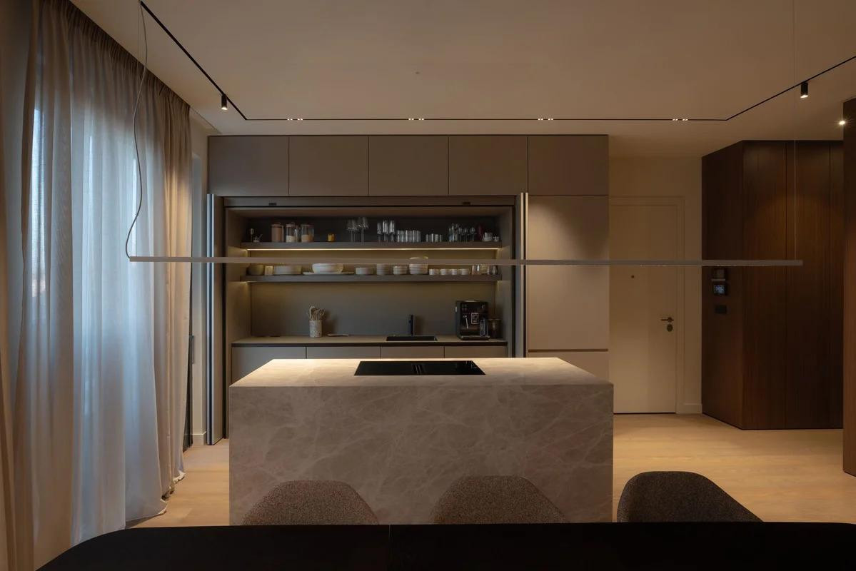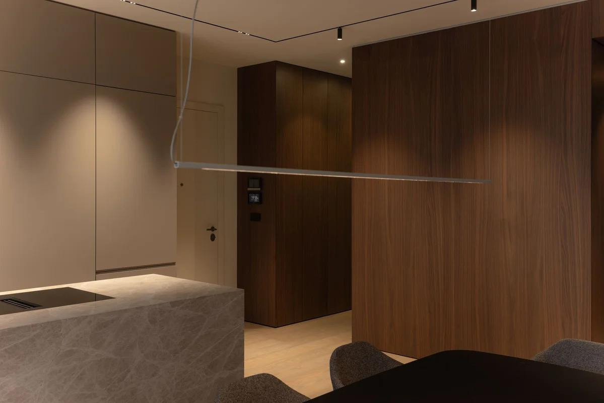 "Rasvjeta je riješena diskretno, s naglaskom na kvalitetu osvjetljenja. Umjesto dekorativnih svjetiljki, pažnju smo usmjerili na stvaranje ugodnih ambijenata kroz različite svjetlosne scenarije", objašnjavaju iz studija, ističući kako se projekt svrstava u luksuzni cjenovni razred, ponajprije zahvaljujući vrhunskim materijalima, izradi po mjeri i pažljivom planiranju svakog detalja.