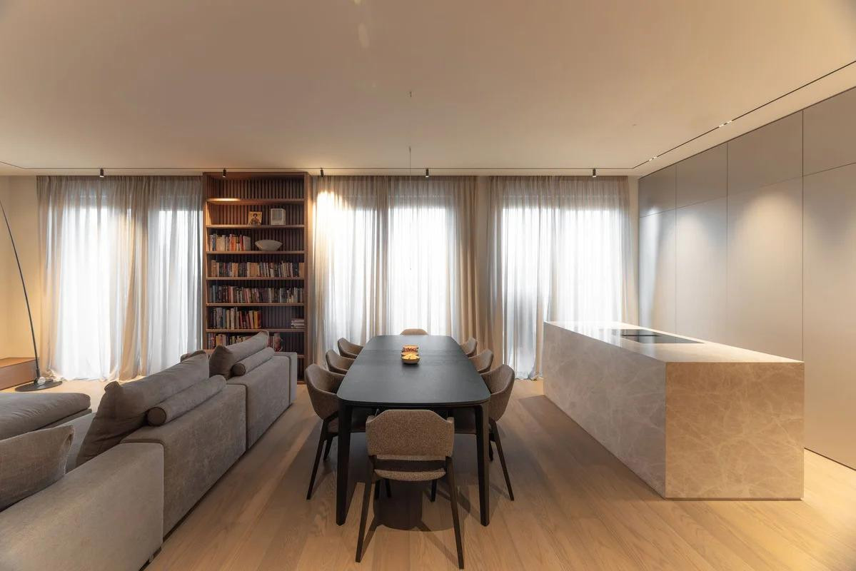 Središnji dio stana čini pak prostrana dnevna zona koja u jedinstvenu, otvorenu cjelinu povezuje kuhinju, blagovaonicu i boravak. Sama kuhinja je posebna priča - iako je integrirana u boravak, projektirana je s mogućnošću zatvaranja, čime se omogućava diskretno skrivanje kuhinje u slučaju nenajavljenih gostiju ili ako vas same nered ‘bode u oči‘. Uz mogućnost zatvaranja kuhinje prostor se vizualno pročišćava i stvara se dojam lakoće i reda u trenu.