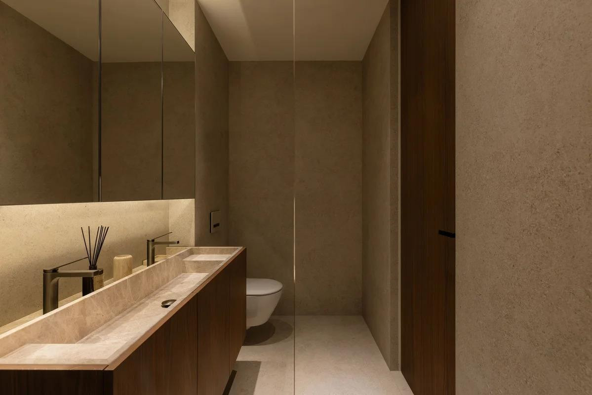 "Kupaonica u glavnoj spavaćoj sobi projektirana je kao privatna spa zona, s pomno biranim materijalima i ambijentalnim osvjetljenjem", dodaju iz studija Fluid.
