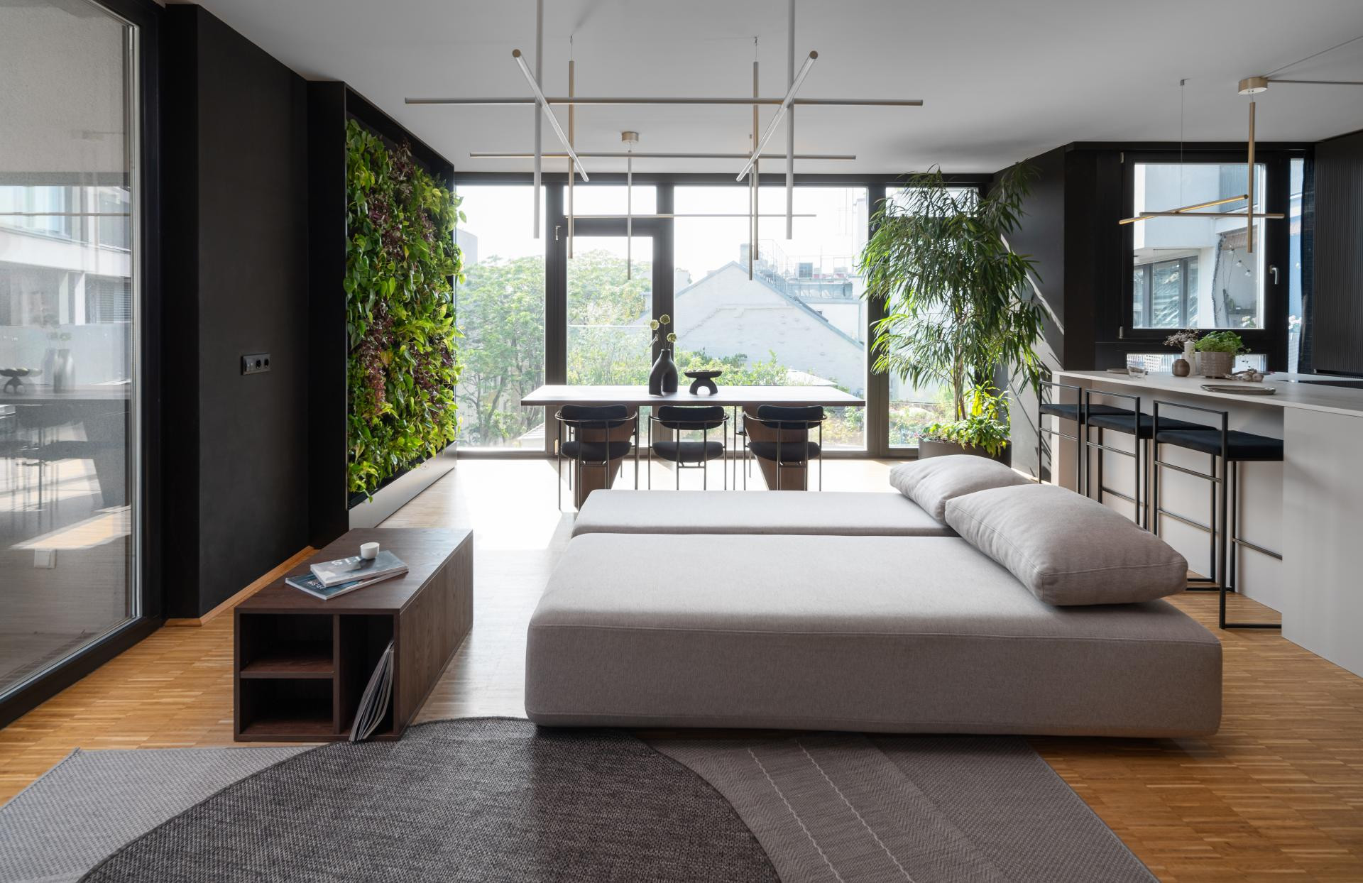- Rad na ovom prostoru bio je užitak, zahvaljujući izvrsnom tlocrtu i otvorenosti koja stan ispunjava prirodnim svjetlom. Dojam koji prevladava kad se uđe u stan jest preplavljenost prostora suncem, što daje čak pomalo tropski ugođaj. Točno je ta svjetlost bila temeljni impuls za cjelokupni koncept, spoj s prirodom, i stoga je zelenilu i panoramskoj staklenoj stijeni s pogledom dodijeljena glavna uloga, dok su svi ostali elementi promišljeno kreirani kako bi ih naglasili i nenametljivo podržali. Prostor karakteriziraju jednostavne linije i neutralna paleta boja, koja ostavlja dovoljno prostora za isticanje biljaka i suptilne boje urbanog krajolika bečkog Margaretena - priča Helena i nastavlja kako srce ovog dnevnog prostora čini zeleni zid od šest četvornih metara, koji čini više od 90 živih biljaka pa stvara pravi mali urbani vrt unutar stana.