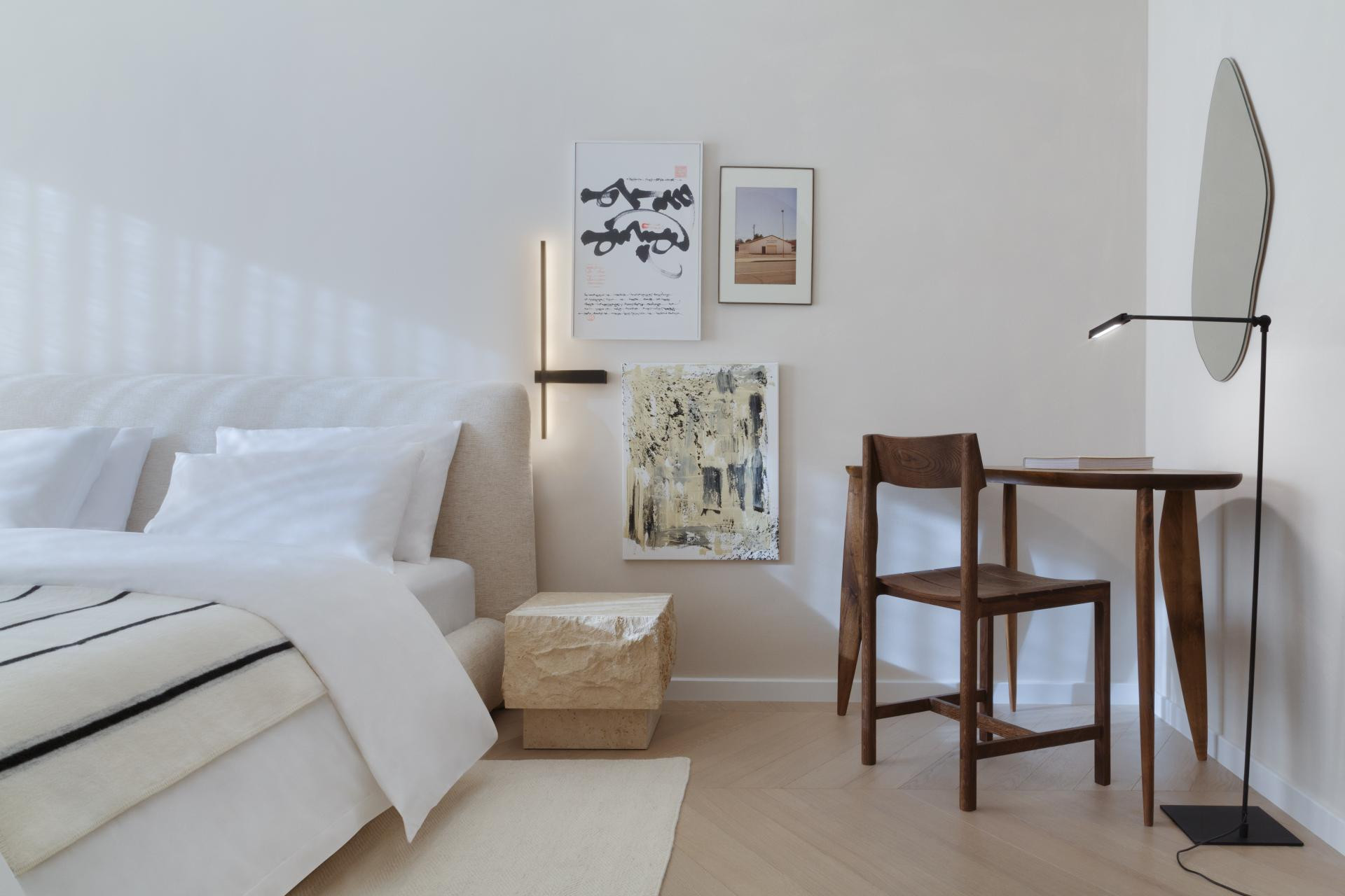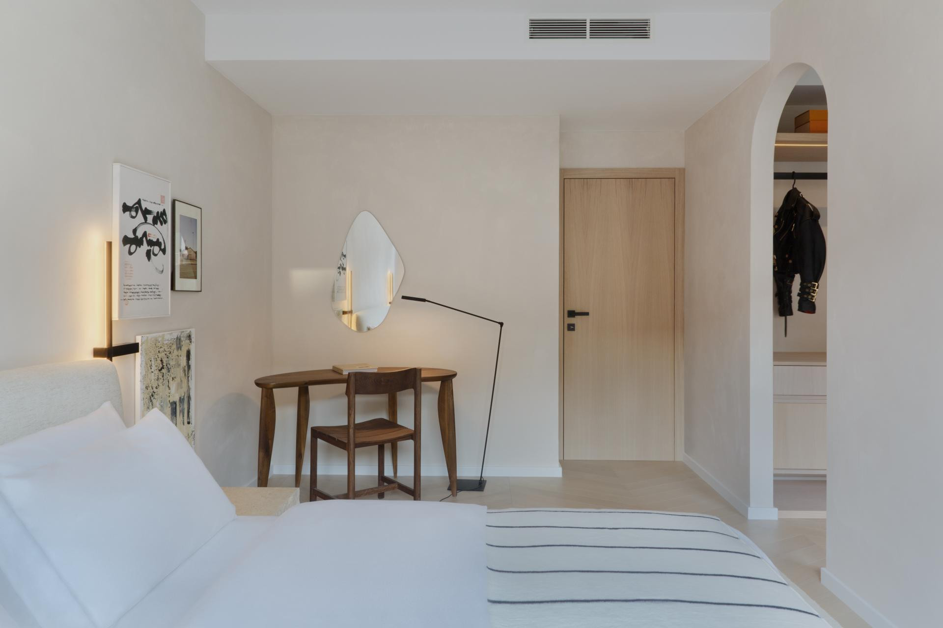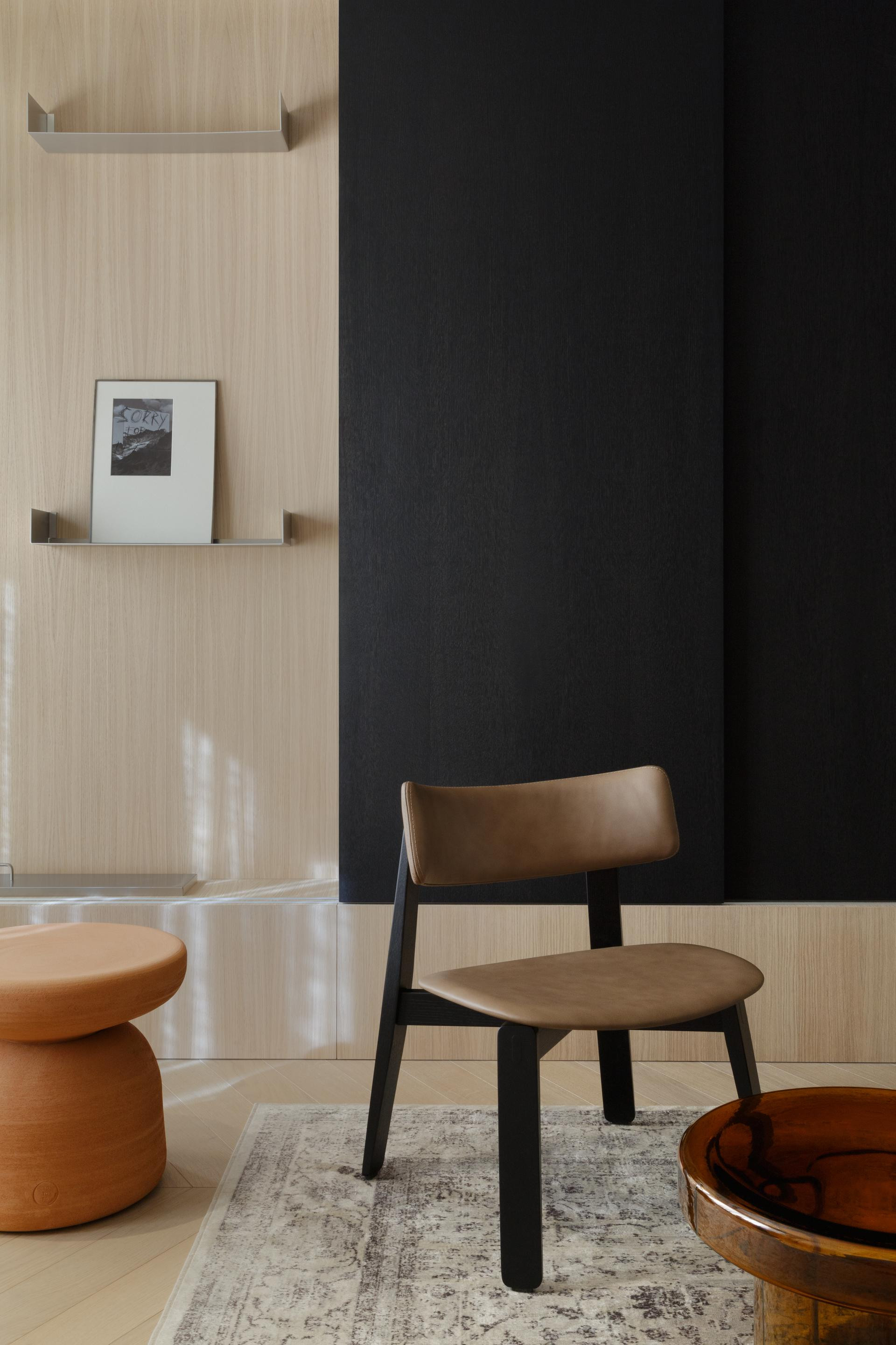 Specifični su detalji kombinacija svijetlog parketa s podnim grijanjem i zidovi oslikani tehnikom lime wash, što je spoj koji daje prostorima meki, mediteranski i pomalo rustikalan karakter. Prevladavaju bež, bijela i crna. Glavni komadi su iz Trike, s brendovima kao što su Gazzda, Minotti, Kave i Ferm Living. U toaletu je keramika Marazzi, a prostor odiše taktilnošću i teksturama koje govore, ali ne vrište.