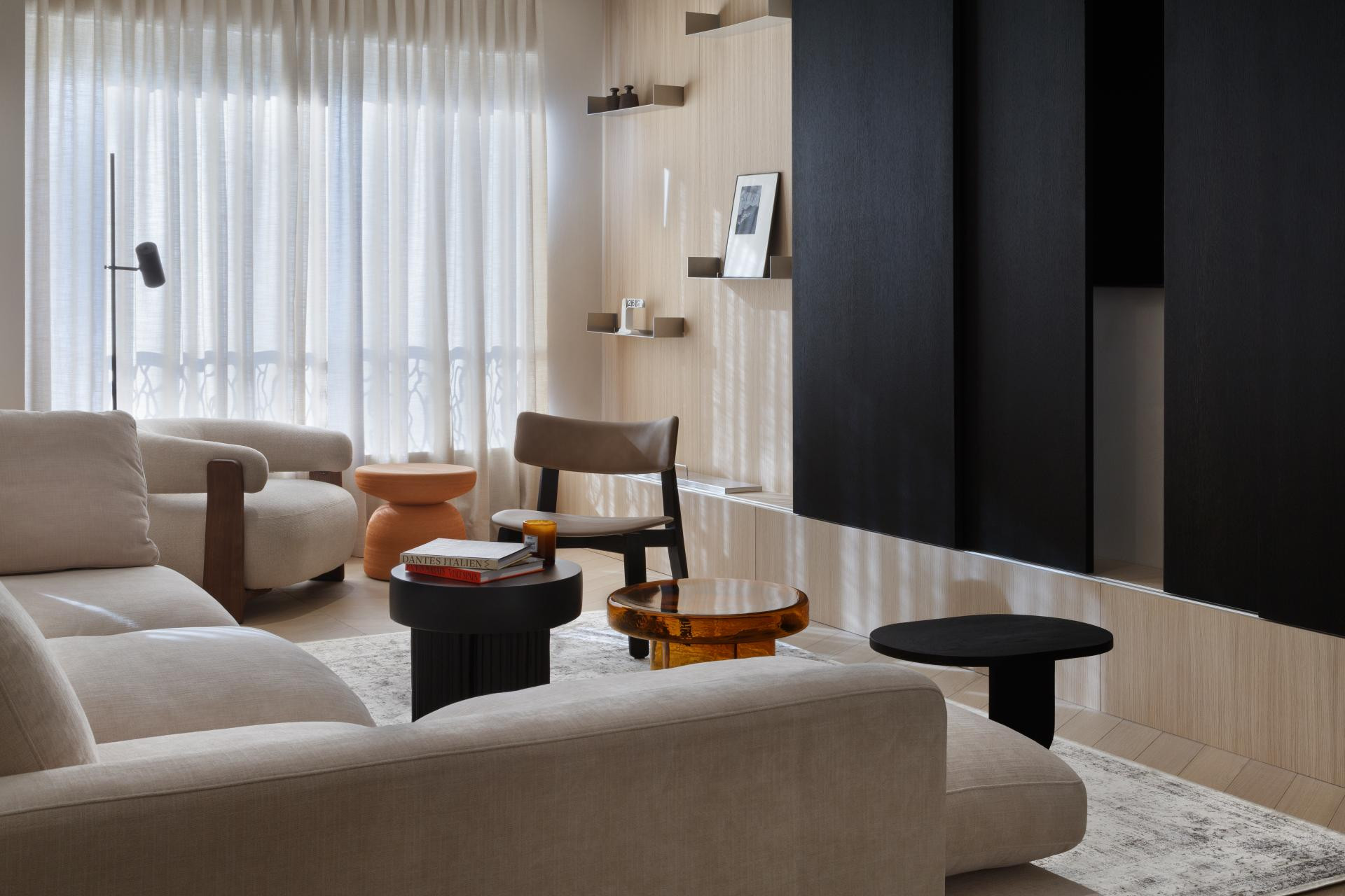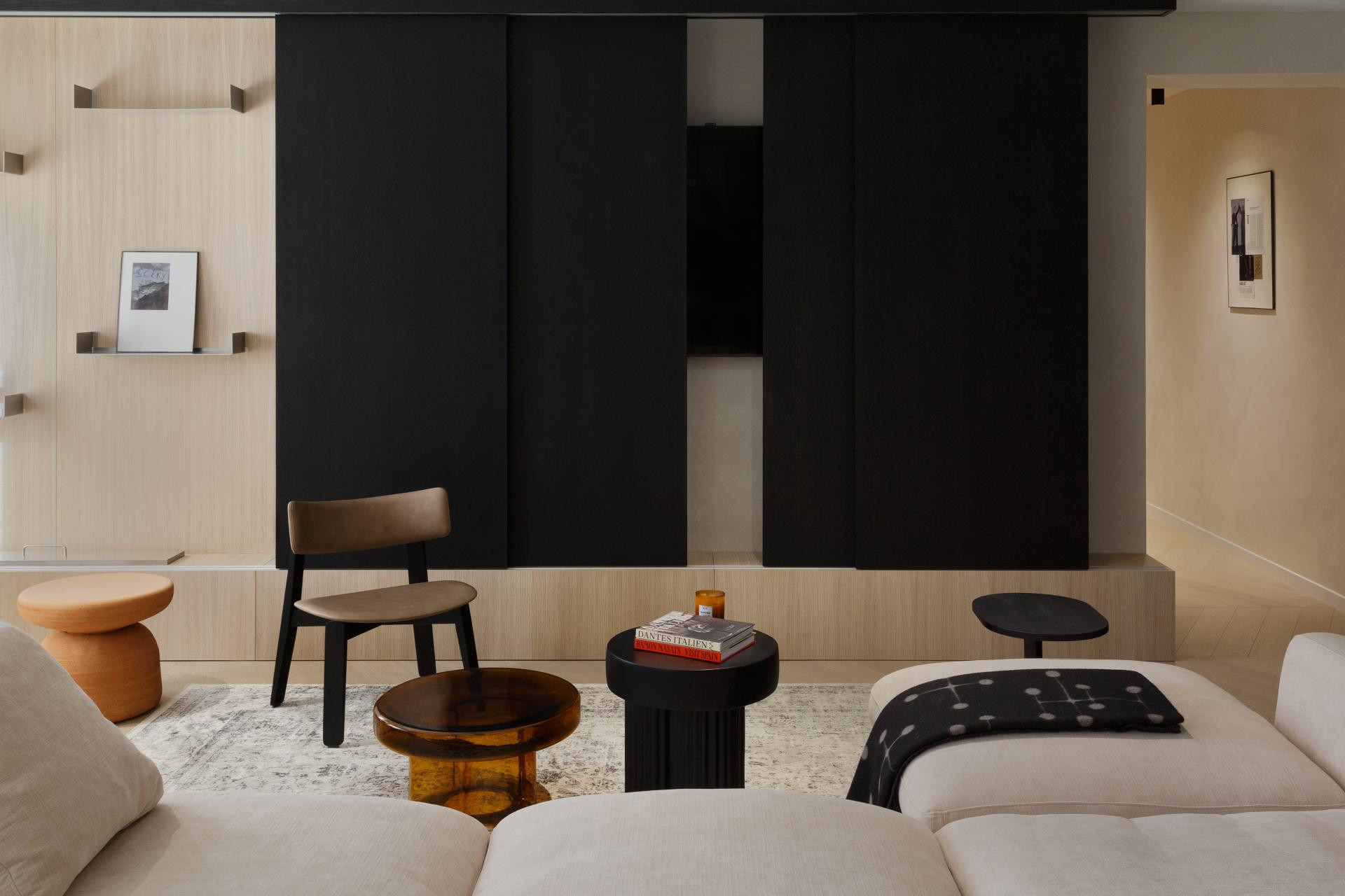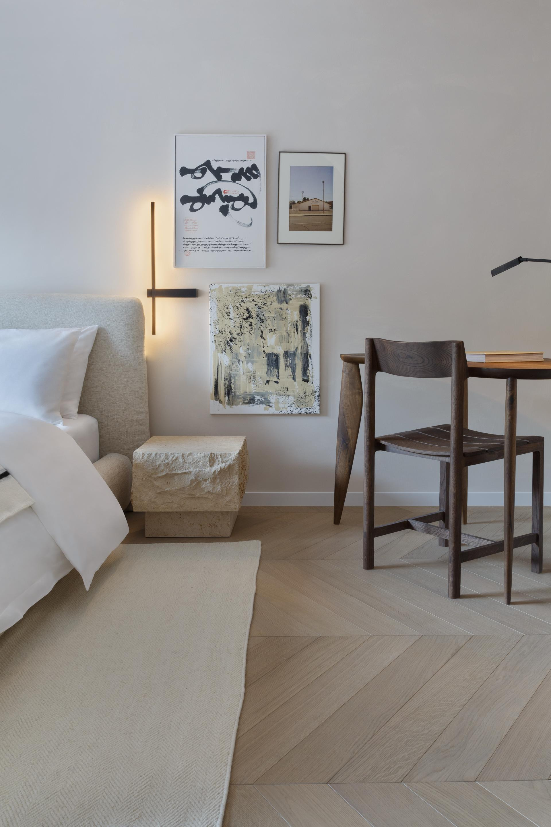 Specifični su detalji kombinacija svijetlog parketa s podnim grijanjem i zidovi oslikani tehnikom lime wash, što je spoj koji daje prostorima meki, mediteranski i pomalo rustikalan karakter. Prevladavaju bež, bijela i crna. Glavni komadi su iz Trike, s brendovima kao što su Gazzda, Minotti, Kave i Ferm Living. U toaletu je keramika Marazzi, a prostor odiše taktilnošću i teksturama koje govore, ali ne vrište.