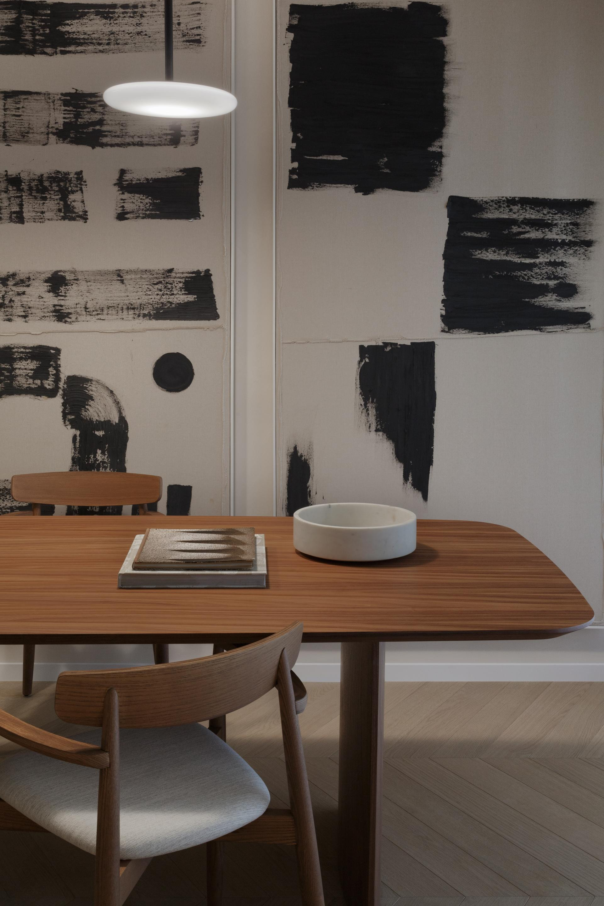 Slike na zidovima su djelo Stjepanovih ruku, a svaka je nastala za točno određeni feeling stana. Detalji su pažljivo birani kako bi pratili stil i energiju prostora. Integrirane niše za postolja s vremenom će vlasnica ispuniti vlastitim kolekcijama. U svemu postoji ta fina doza otvorenosti, kao poziv na suživot s prostorom.
