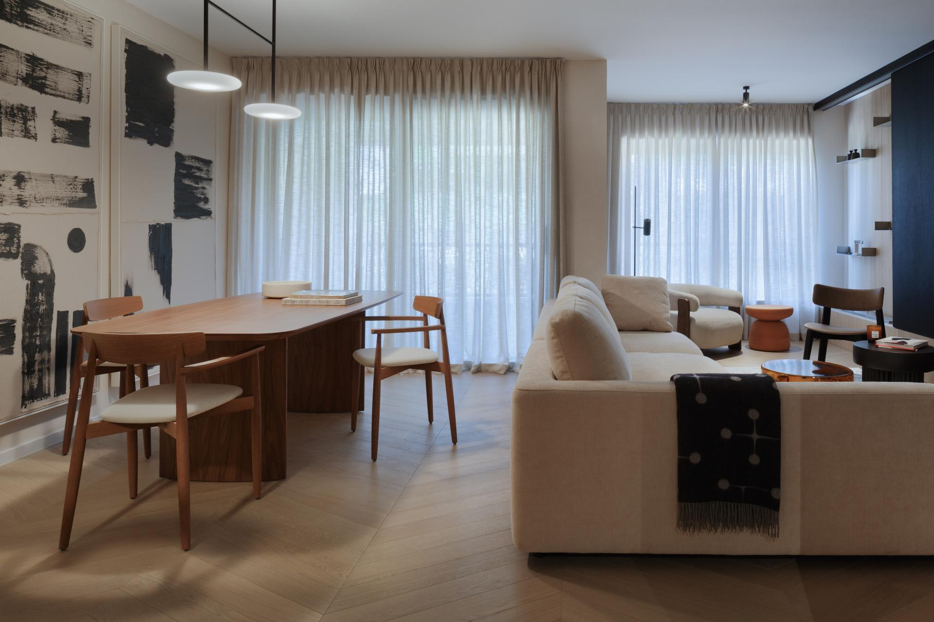 - Ulazi se u pretprostor koji s lijeve strane skriva kuhinju iza rebrastih kliznih vrata, poluprozračnih, što im daje fluidnost. S desne strane je zid s ogledalima i skrivenim vratima za gostinjski toalet. U nastavku je blagovaonica, pa dnevni boravak. Hodnik vas dalje vodi prema master sobi i kupaonici. Portal bez vrata vodi iz spavaće sobe izravno u walk-in ormar, što je otvoreno, ali elegantno rješenje - ističe Stjepan Čagalj i nastavlja kako stan ima puno zanimljivih arhitektonskih i dizajnerskih elemenata.