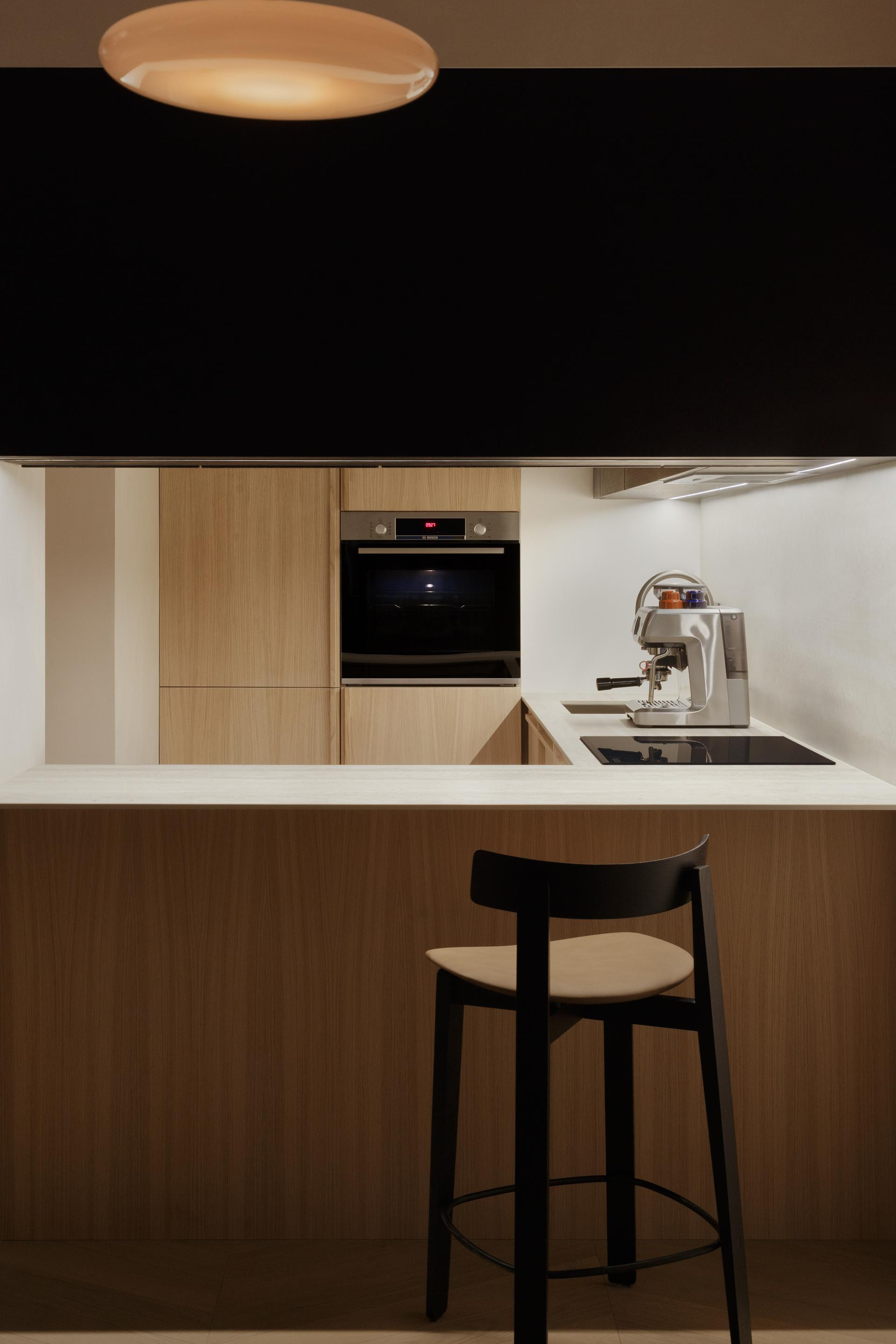 Primjerice, kuhinja je inspirirana japanskim kioskom pa dok se sjedi za šankom, djeluje kao mala kapsula u prostoru. U dnevnom boravku su skriveni kamin i TV iza pokretnih panela, a prostor se mijenja ovisno o funkciji. Hodnički ormari skrivaju se iza zidova jer su obloženi MDF pločama s metalnim obrubima, obojenima u istu boju kao zid. U ulaznom dijelu ogledala su proširila prostor, a niša u nosećem stupu koristi se za postolje umjetnina, što je, saznajemo, Stjepanov omiljeni detalj u ovom prostoru.
