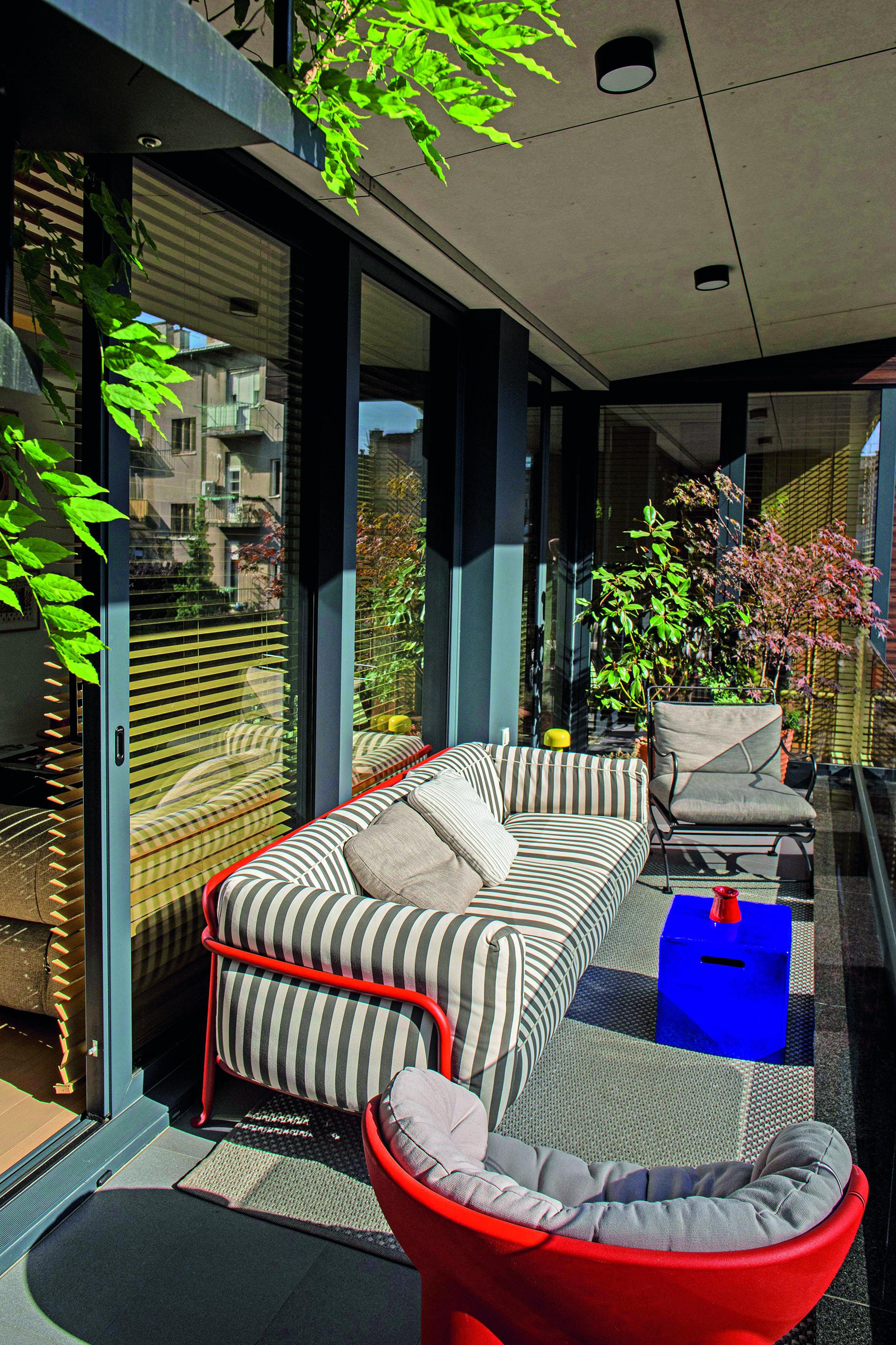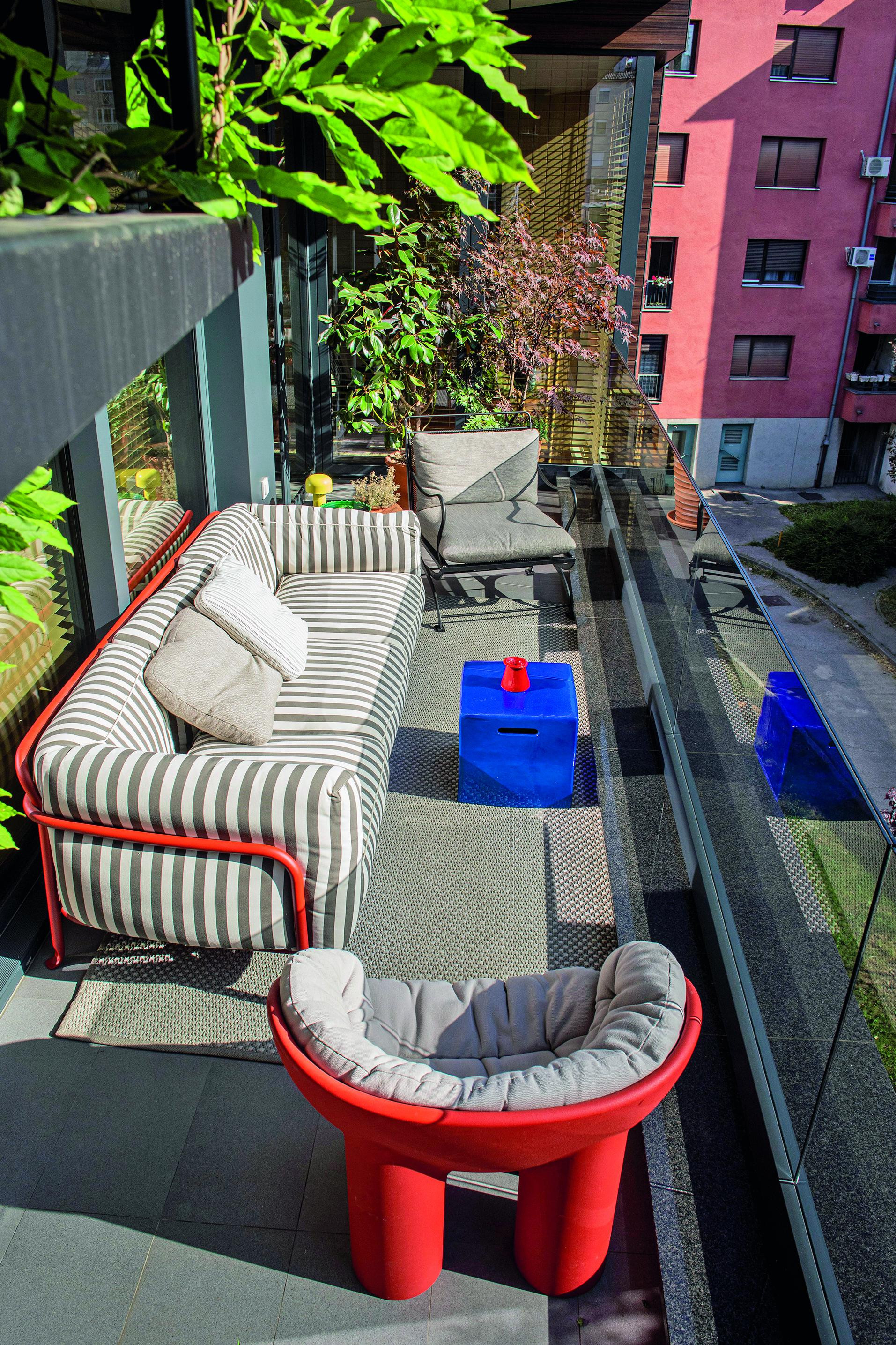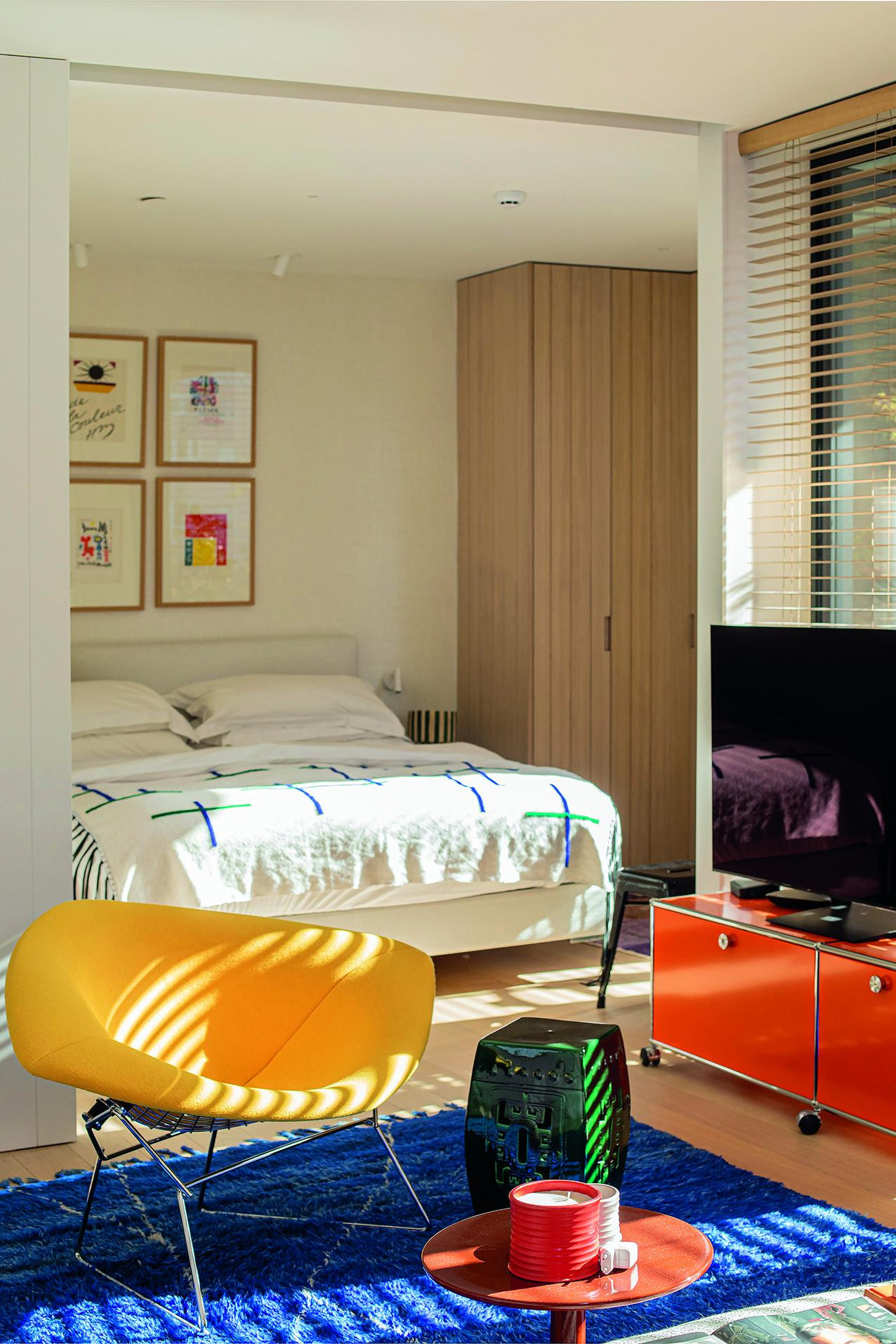 Stan se sastoji od povezanog ulaznog hodnika, dnevne sobe i kuhinje te je potpuno otvoren prema terasi koja postaje produženi dnevni boravak. Jedine dvije male izdvojene prostorije su kupaonica i praonica rublja. Ponajprije je želio postići ugodnu i opuštenu atmosferu, a kako je njegov prošli stan bio monokoloran, ovaj je put unio jak kolorit kako bi prostoru dao dinamičnost.