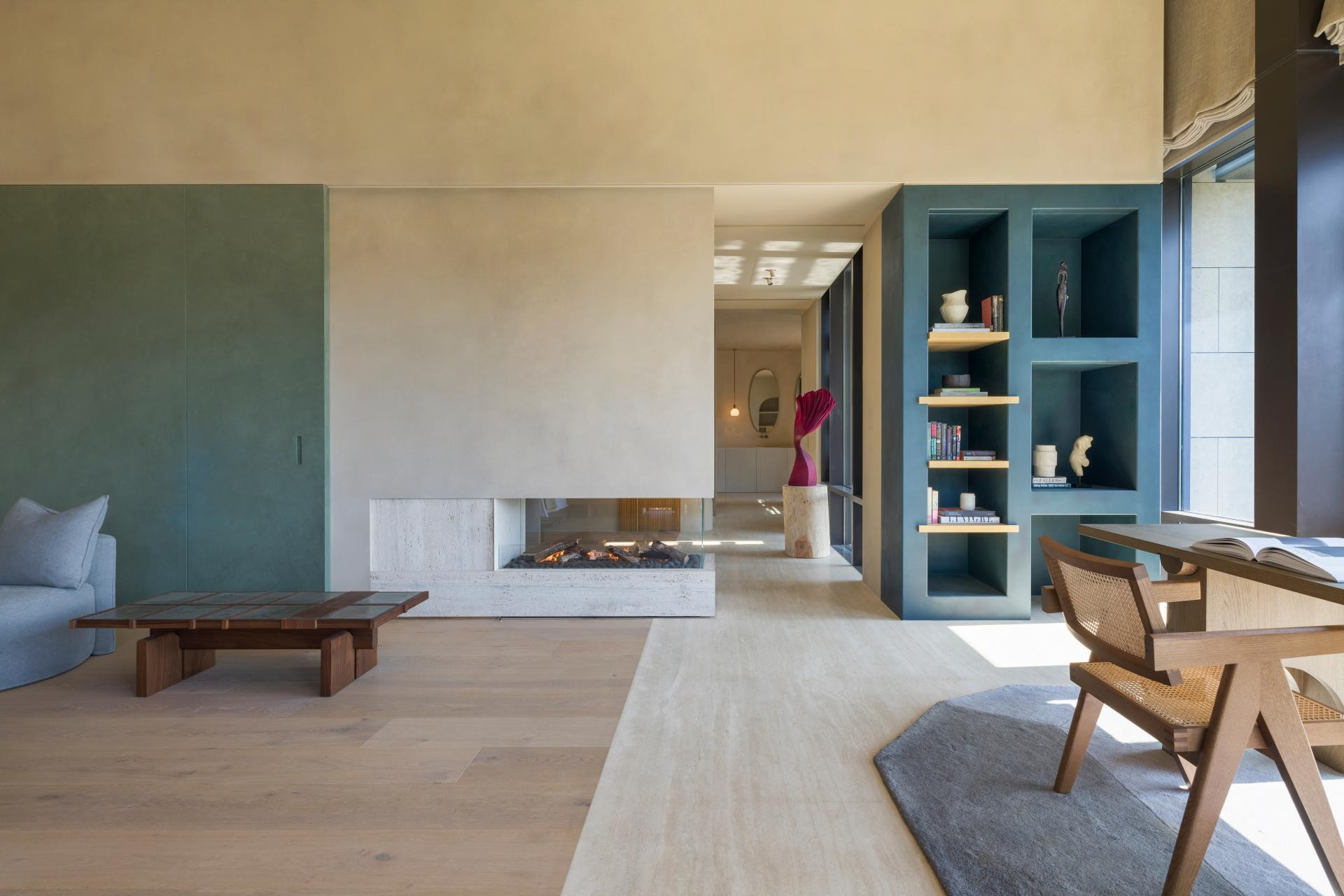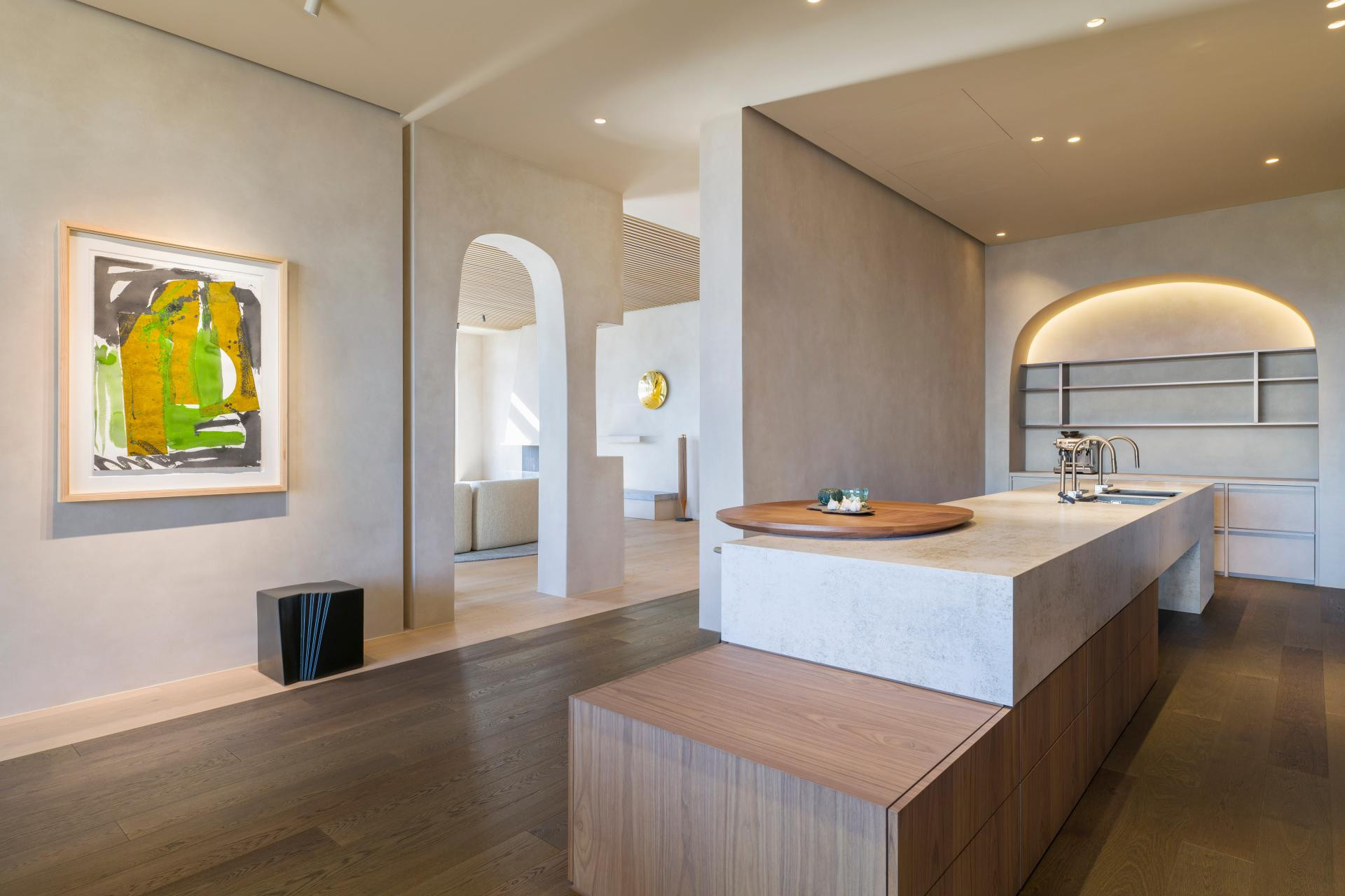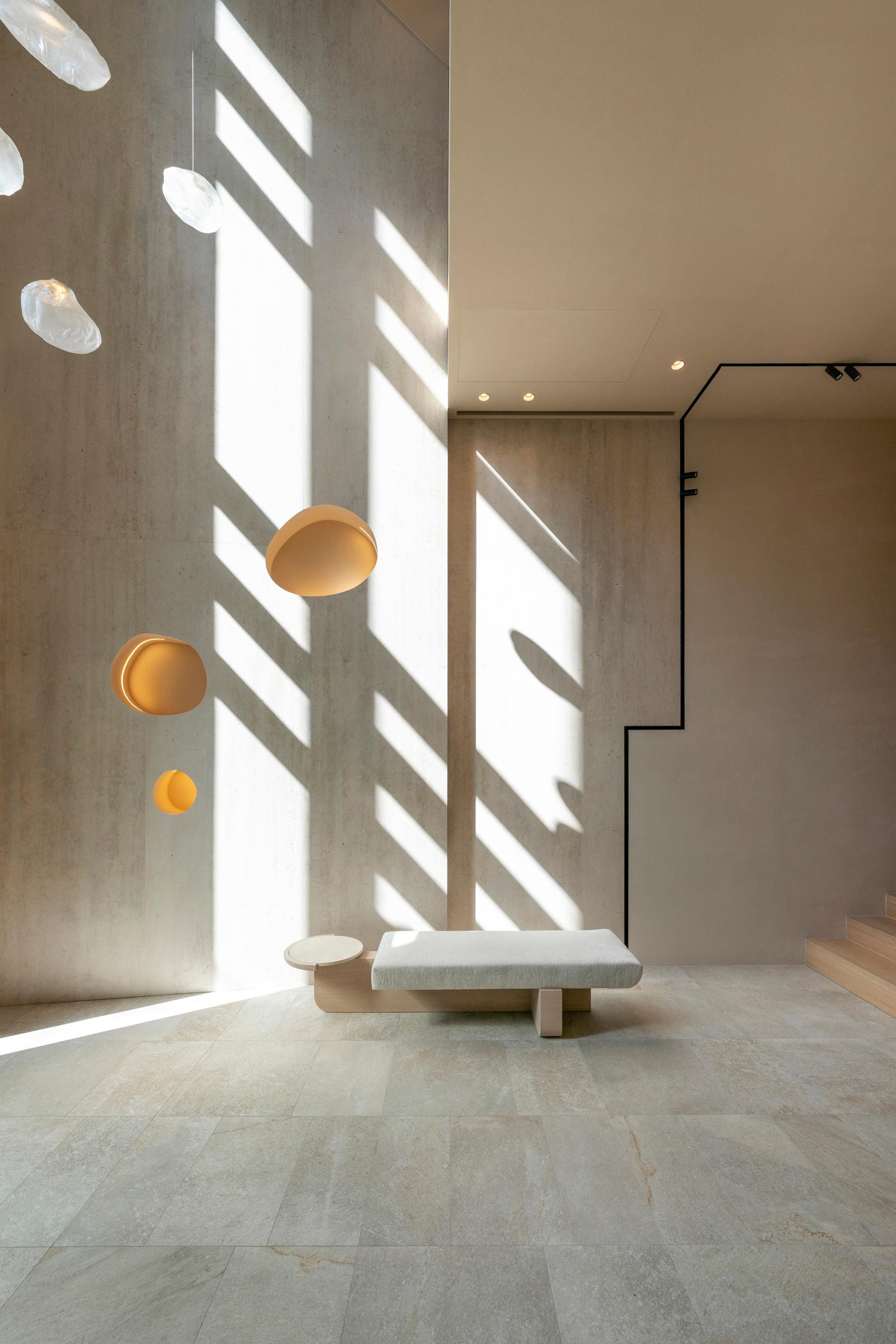 Materijalnost prostora pažljivo je promišljena. Zidovi su obrađeni žbukom u tonovima minerala, stvarajući suptilne igre svjetla i sjene. Podovi od prirodne tikovine prizemljuju prostor i unose toplinu, dok ručno izrađeni komadi namještaja dodaju taktilnost i osobni pečat. Elementi od stakla, metala i tkanine u kontrapunktu su s organskim teksturama, gradeći atmosferu suzdržanog luksuza.