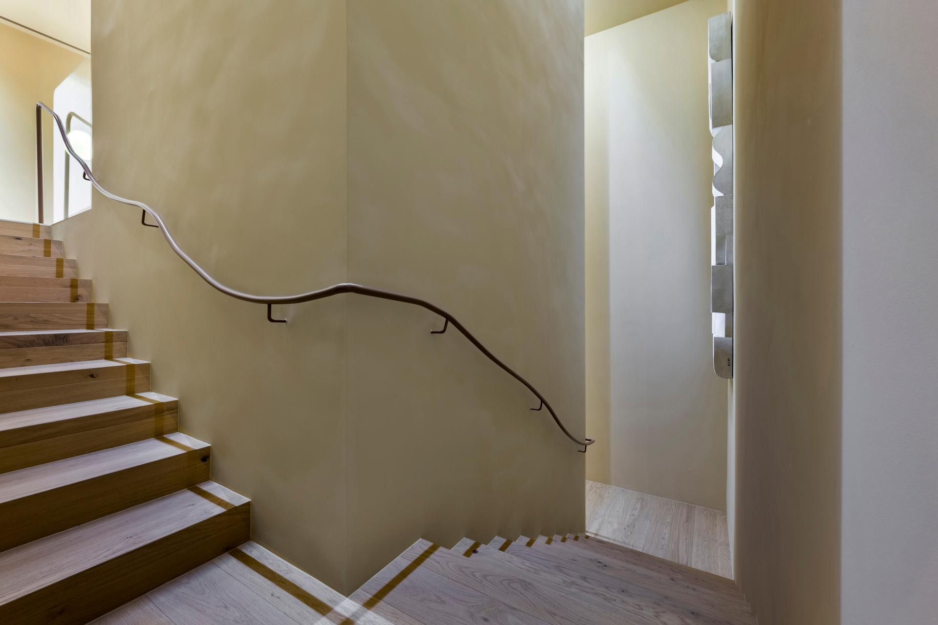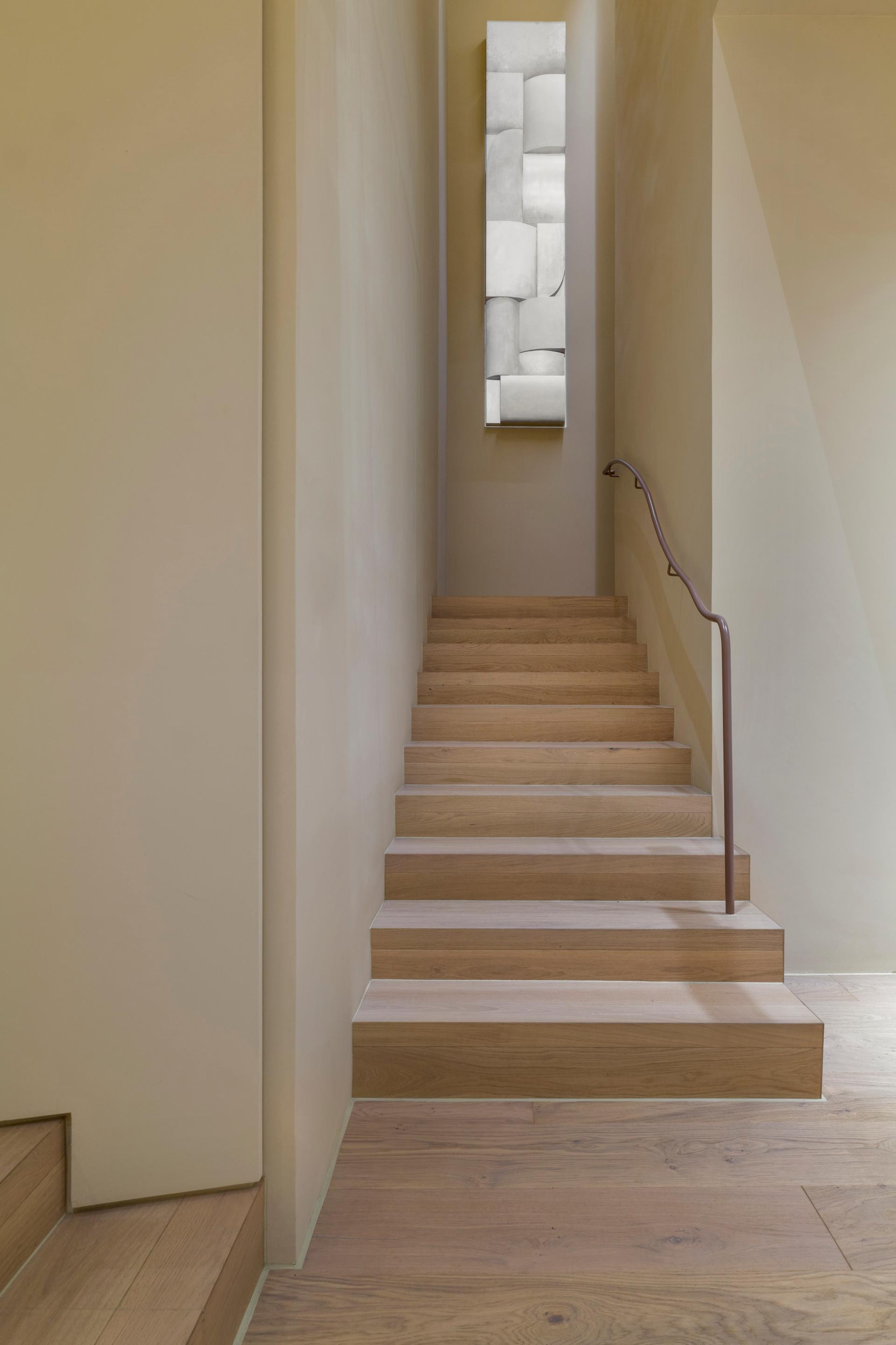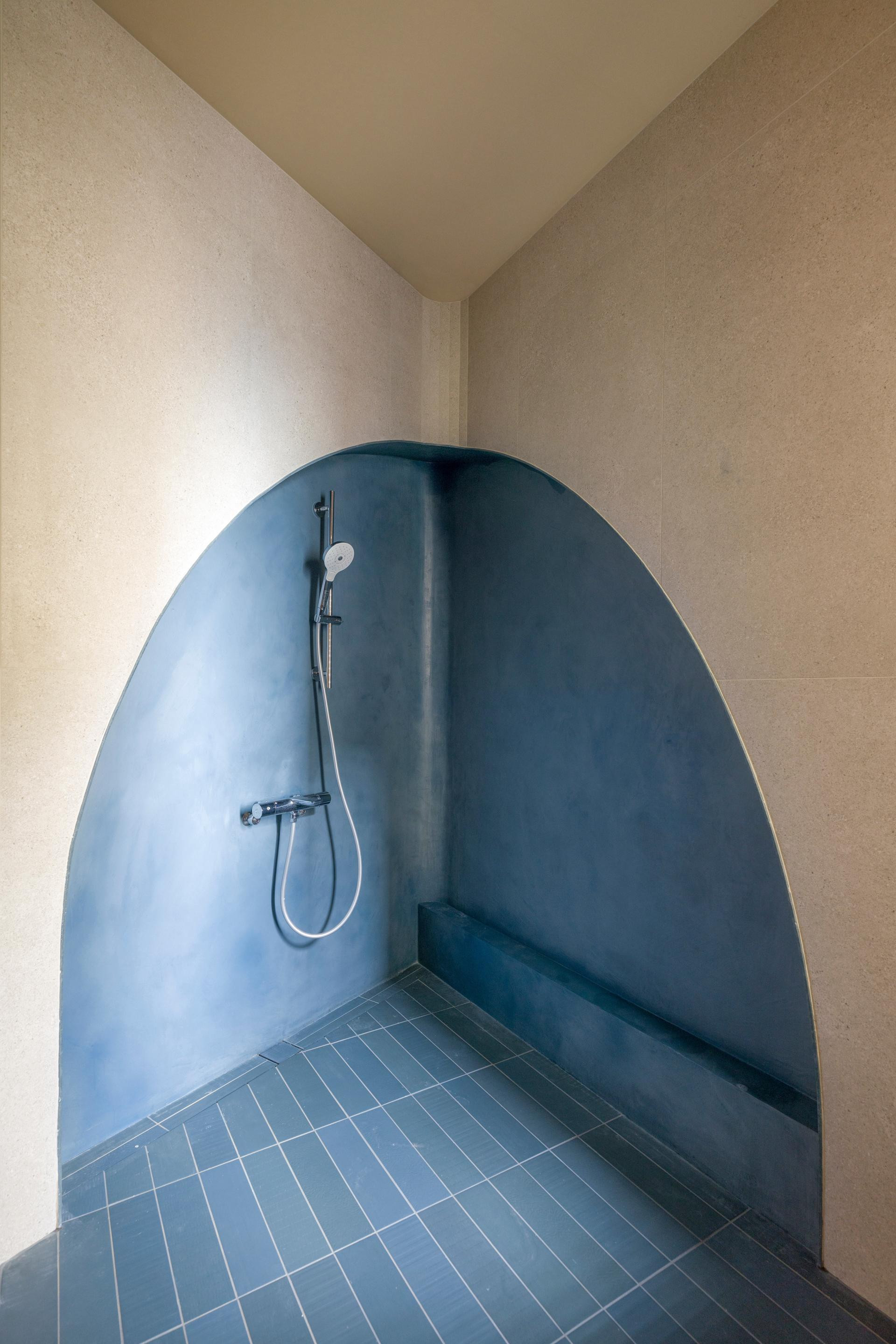 Materijalnost prostora pažljivo je promišljena. Zidovi su obrađeni žbukom u tonovima minerala, stvarajući suptilne igre svjetla i sjene. Podovi od prirodne tikovine prizemljuju prostor i unose toplinu, dok ručno izrađeni komadi namještaja dodaju taktilnost i osobni pečat. Elementi od stakla, metala i tkanine u kontrapunktu su s organskim teksturama, gradeći atmosferu suzdržanog luksuza.