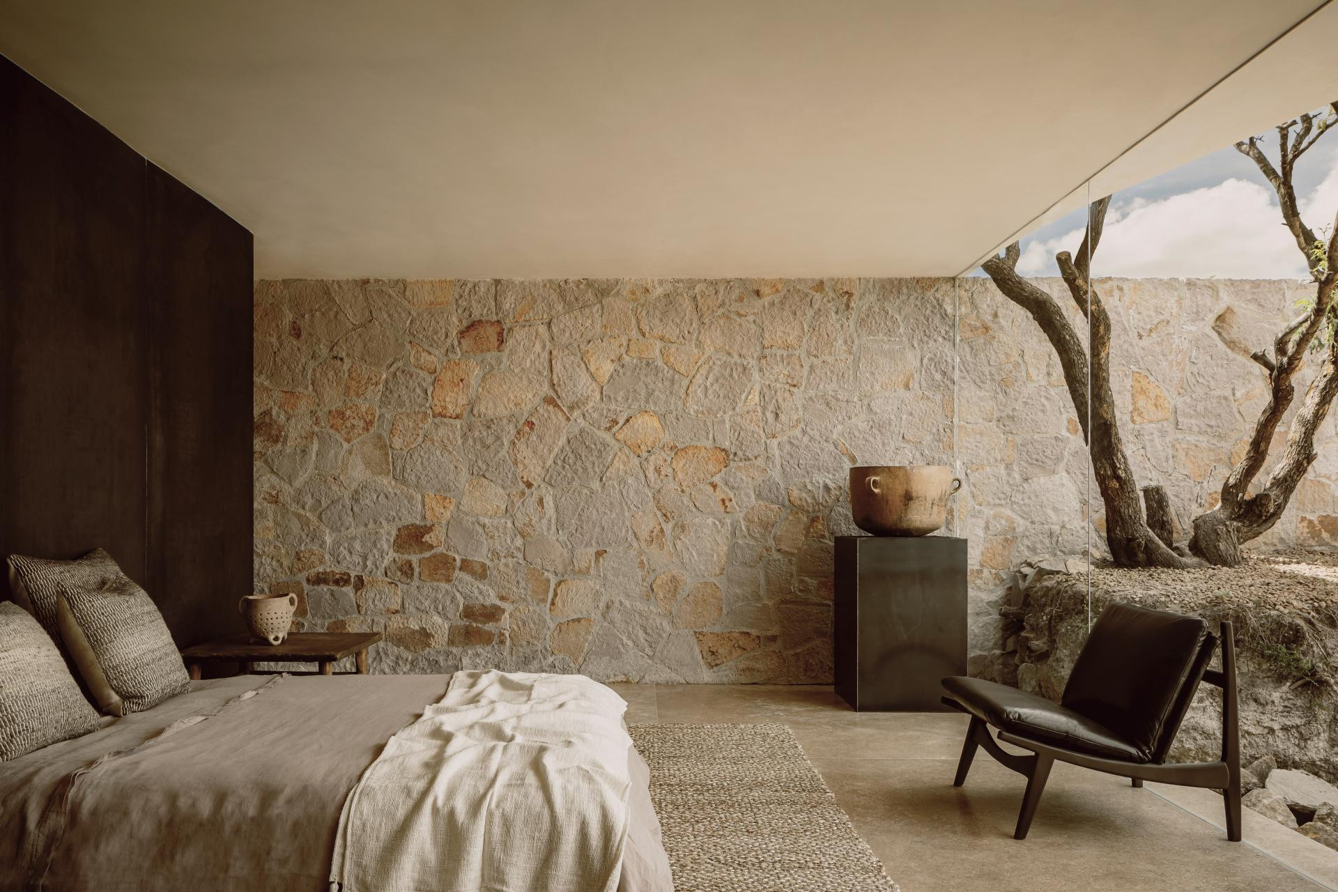 Eksterijer je gotovo monokromatski, tonovi zemlje i kamena stapaju se s pejzažem planine u pozadini. Nema jarkih boja, nema suvišnih ukrasa. Zidovi su grubi, ostavljeni da stare i da ih preoblikuju sunce, kiša i vrijeme. Ulaz skriva dugi kameni zid koji nježno zakrivljuje pogled i usmjerava ga prema horizontu. Unutrašnjost je jednako jednostavna i iskrena – prirodni kamen i beton, svjetlo koje se prelijeva kroz pažljivo pozicionirane otvore i stvara dramatične sjene na glatkim površinama. Sve je podređeno osjećaju smirenosti, bez potrebe za luksuzom ili pokazivanjem.