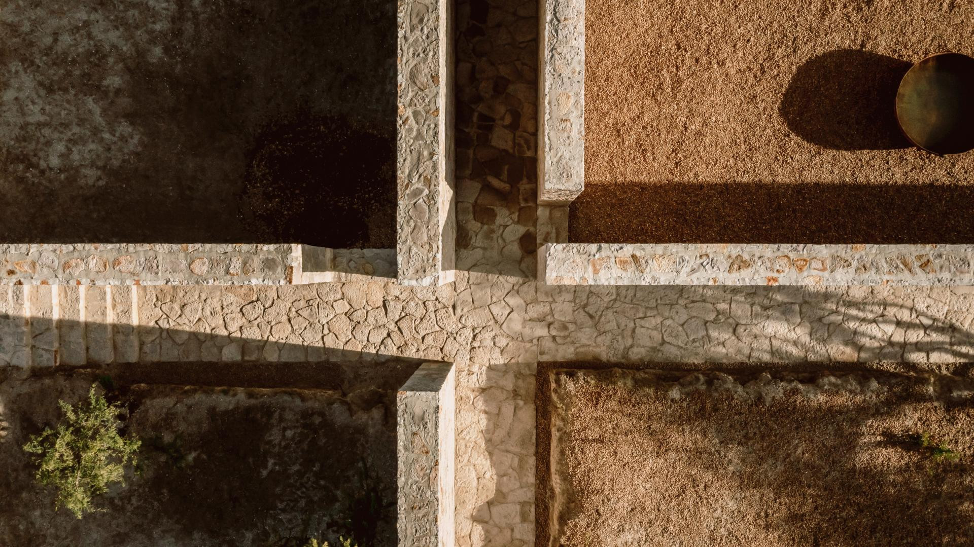 Kuća se nalazi na parceli od gotovo hektara, a sama građevina zauzima svega 195 četvornih metara. HW Studio se svjesno odlučio na arhitekturu razmaka, a ne gustoće. Kompleks je oblikovan poput križa, četiri su kvadranta međusobno odvojena kamenim stazama koje ne samo da određuju tlocrt, već i ritam svakodnevnog života.