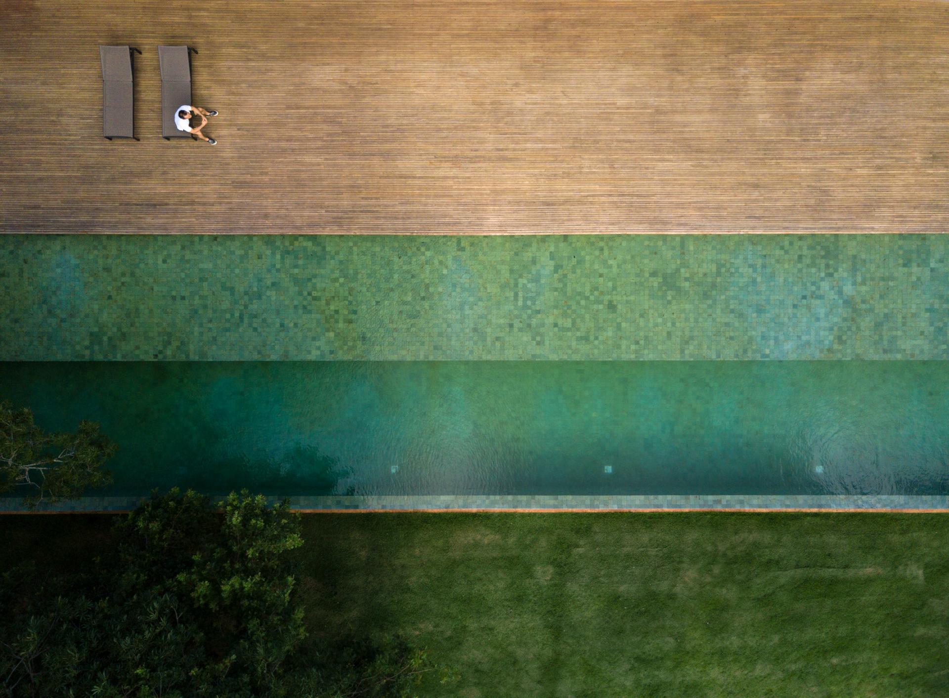 Na južnom kraju rezidencije, nekoliko koraka vodi od dnevne sobe do bazena. Interijeri imaju jednostavnu paletu materijala koja uključuje drvo i beton.