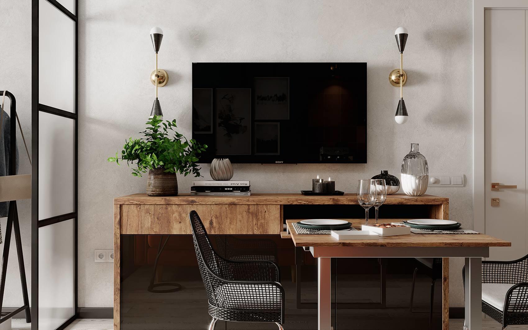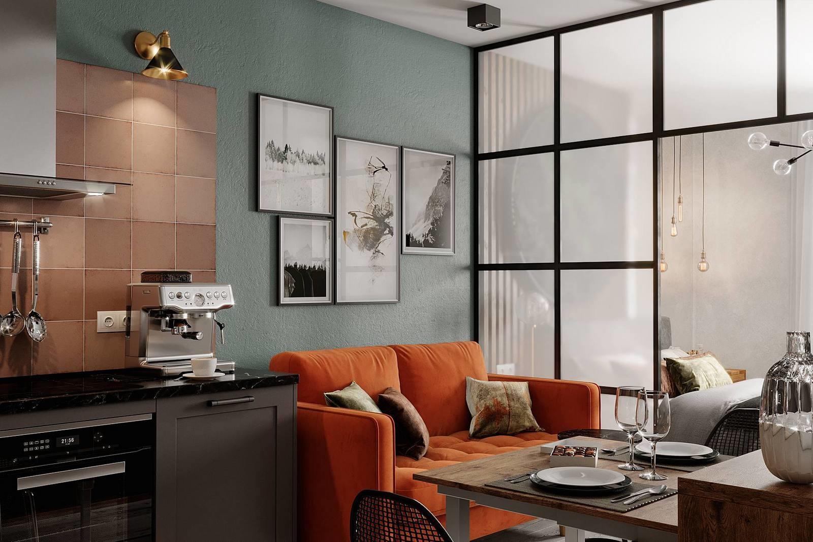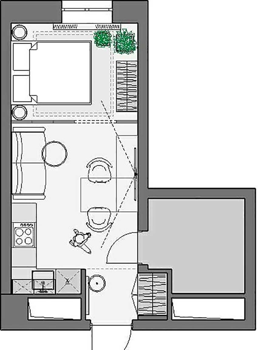 U dugu i usku sobu dizajnerica interijera Natalya Solntseva uspjela je funkcionalno i estetski smjestiti kuhinju, blagovaonicu, dnevni boravak i spavaću zonu. Spavaći dio je odvojila od dnevne zone staklenom pregradom, koja se pokazala kao savršeno rješenje za vizualno i funkcionalno odvajanje zona,