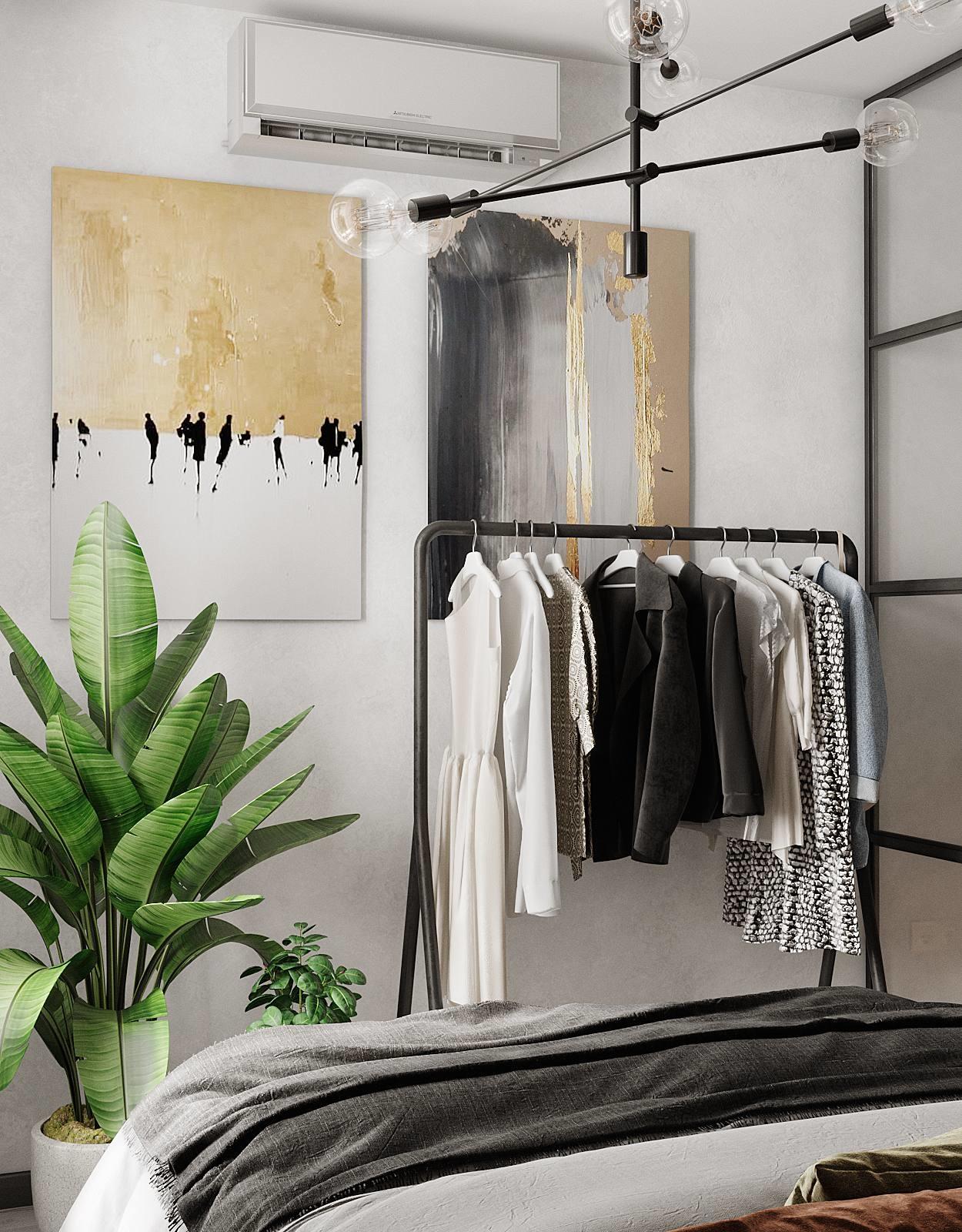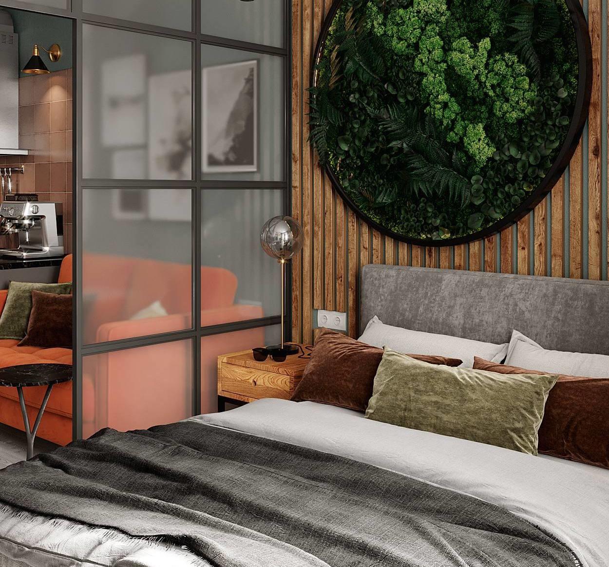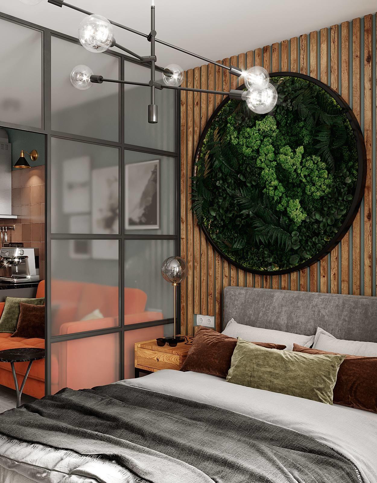 U spavaćoj sobi zid iza kreveta dobio jer pozadinu sačinjenu od drvenih letvica i veliku sliku zelenih biljaka u crnom okruglom okviru kao za ogledalo. Ovaj iznimno atraktivan element uređenja unosi djelić prirode u ovaj mali prostor uređen neutralnom paletom boja.