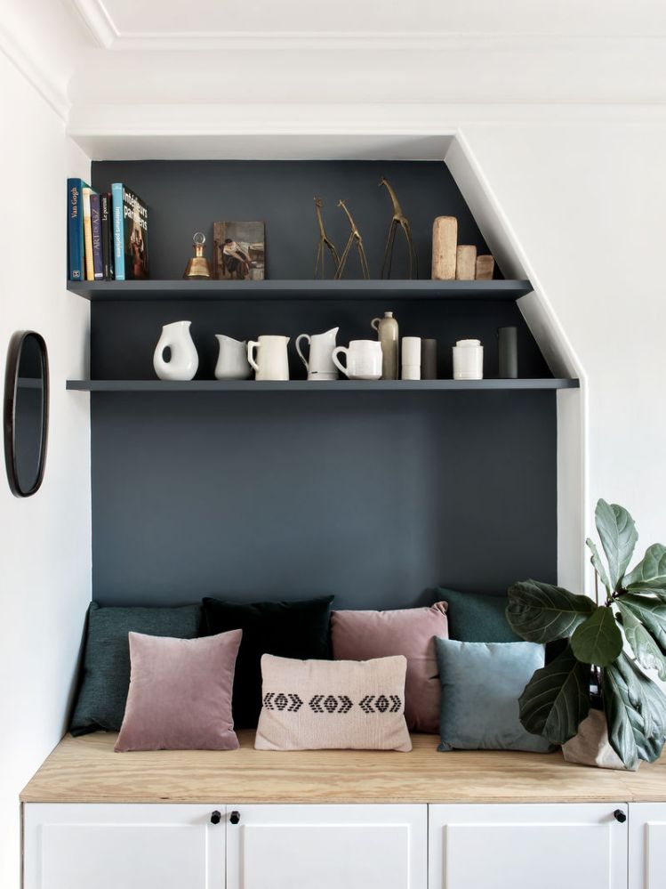 Iako u interijeru pretežno prevladava bijela boja kao glavna podloga, dizajnerica se poslužila i nekim tamnijim ukrasima i elementima kako bi došla do vizualnog kontrasta, kako na simpatičnoj klupi za sjedenje u blagovaonici, tako i s detaljima poput zanimljivih ogledala na zidu ili crnih stolaca karakterističnog retro dizajna.