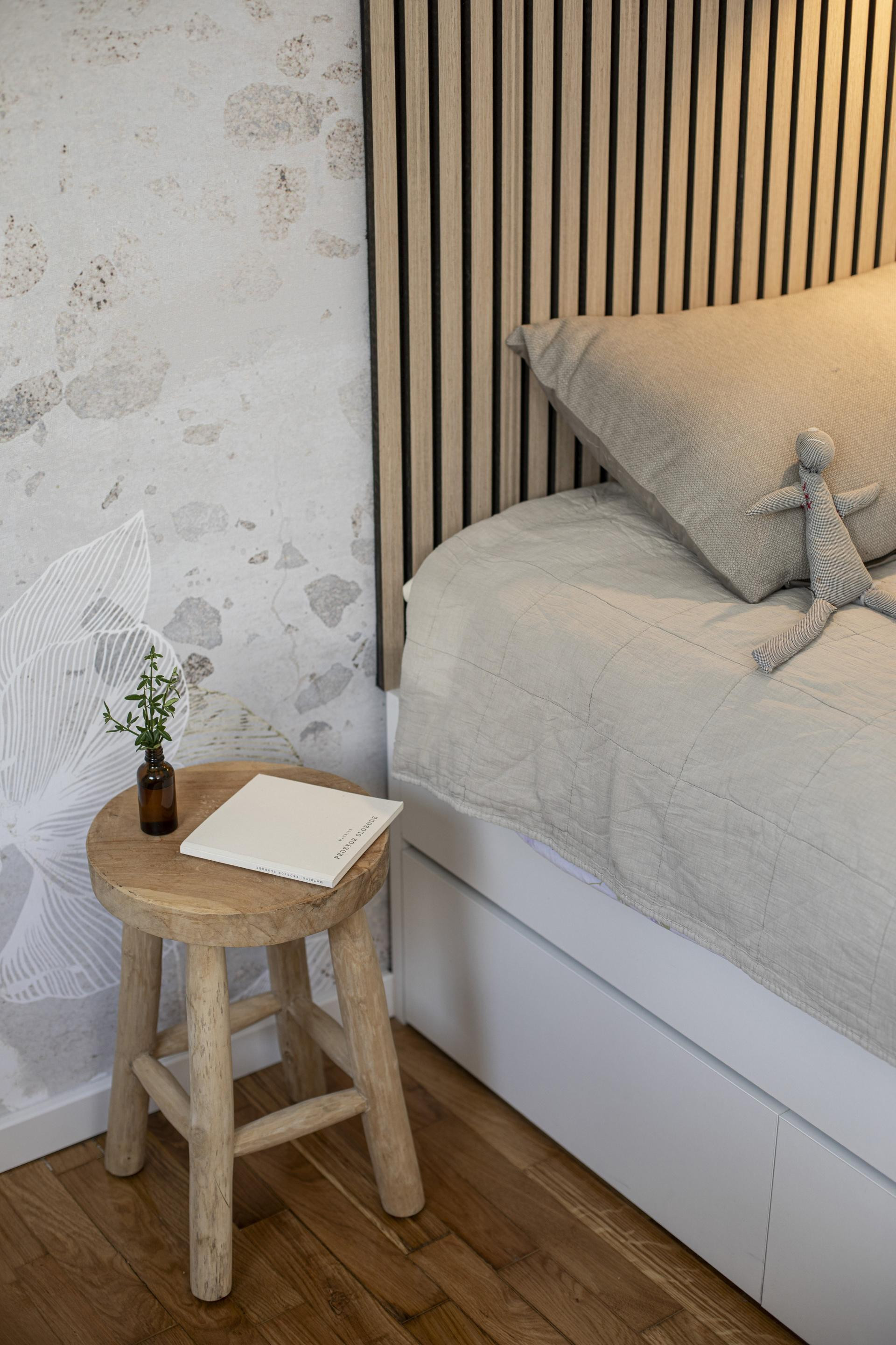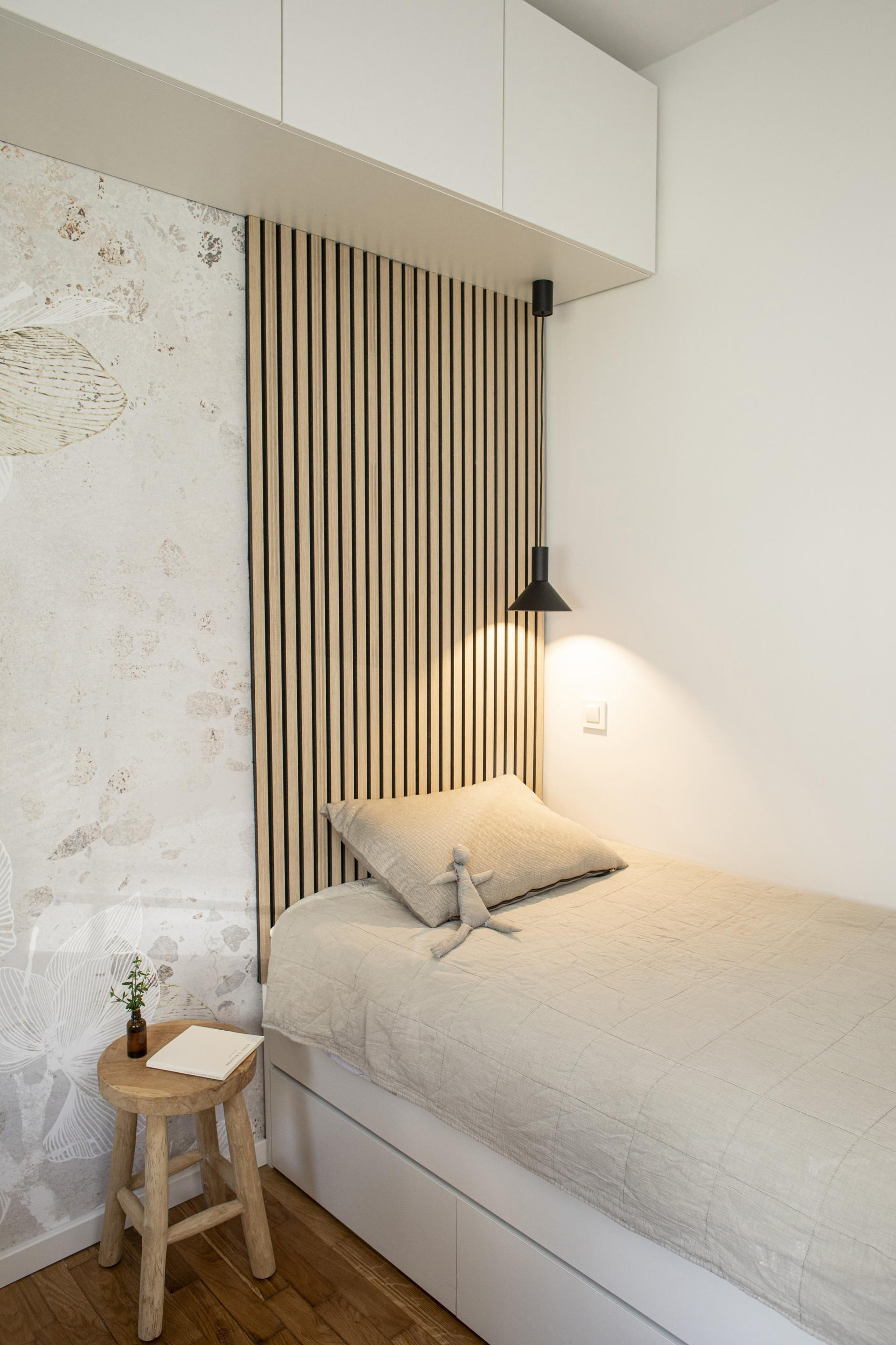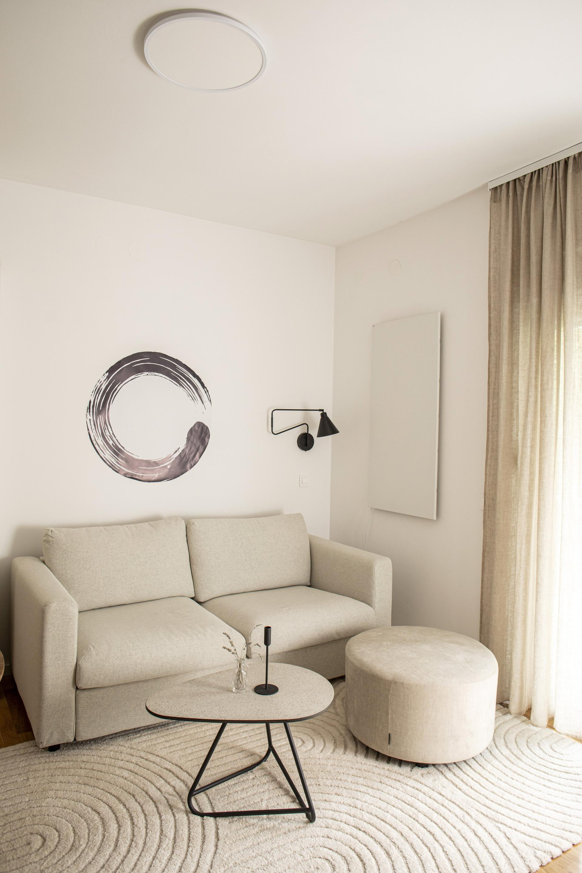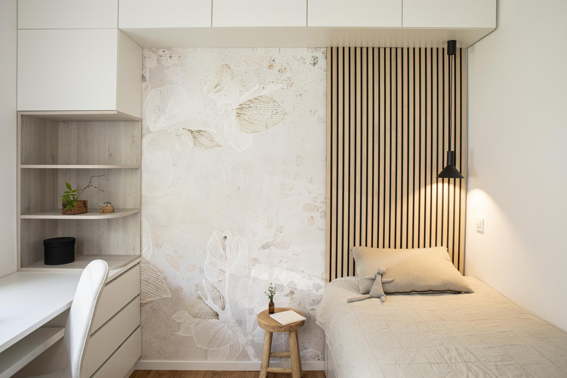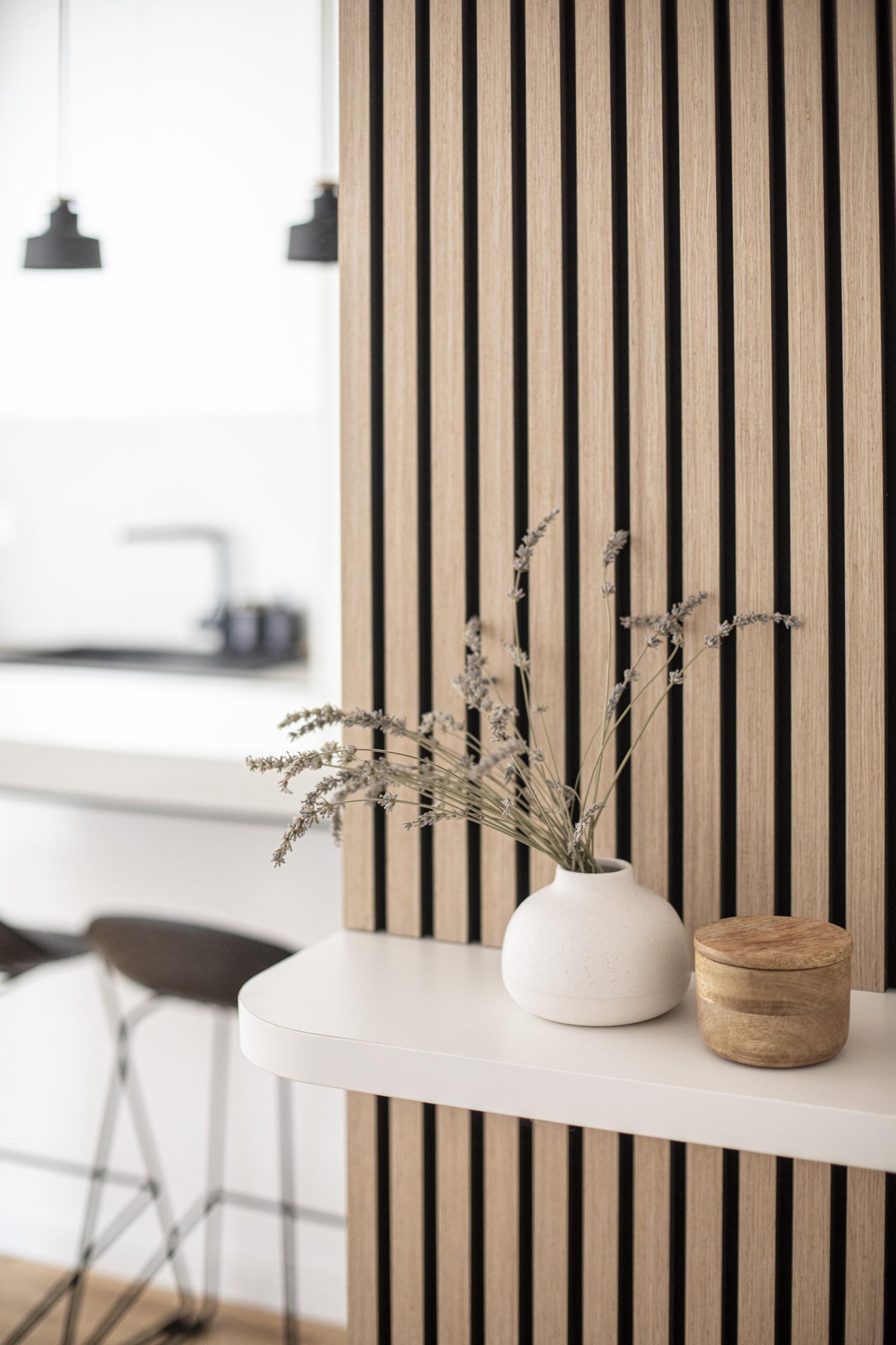 Prostor obiluje drvom, prirodnim tkaninama, kao što su lan i pamuk, te ratanom. Prevladavaju neutralni tonovi obogaćeni bogatim teksturama te decentnim kontrastima u crnoj boji. Dominantnoj bjelini kontriraju lijepi ukrasni i funkcionalni detalji na ulazu u stan i u spavaćoj sobi - akustični zidni paneli, napravljeni od drvenih letvica na filcu i mjerom prilagođeni prostoru.