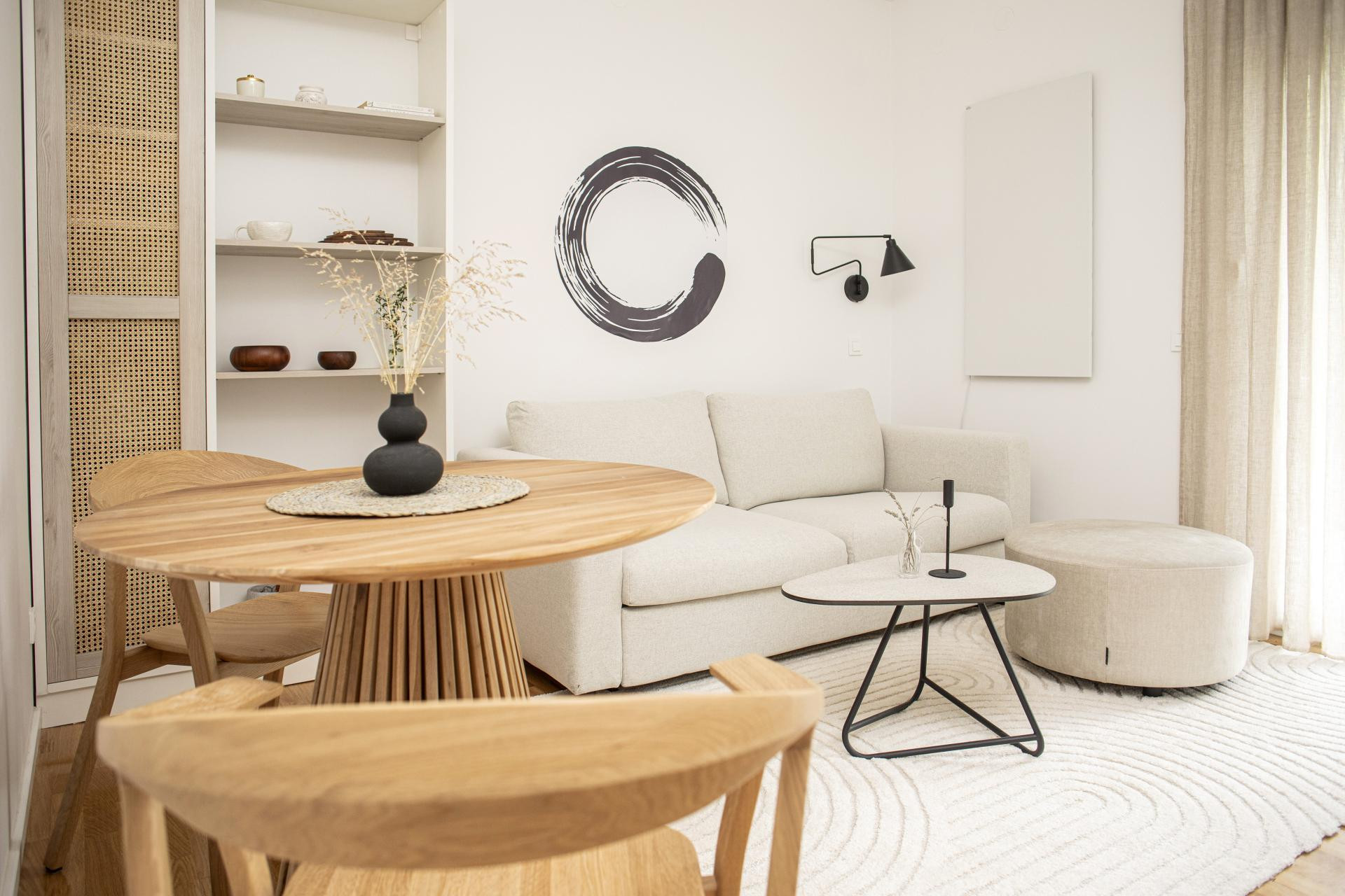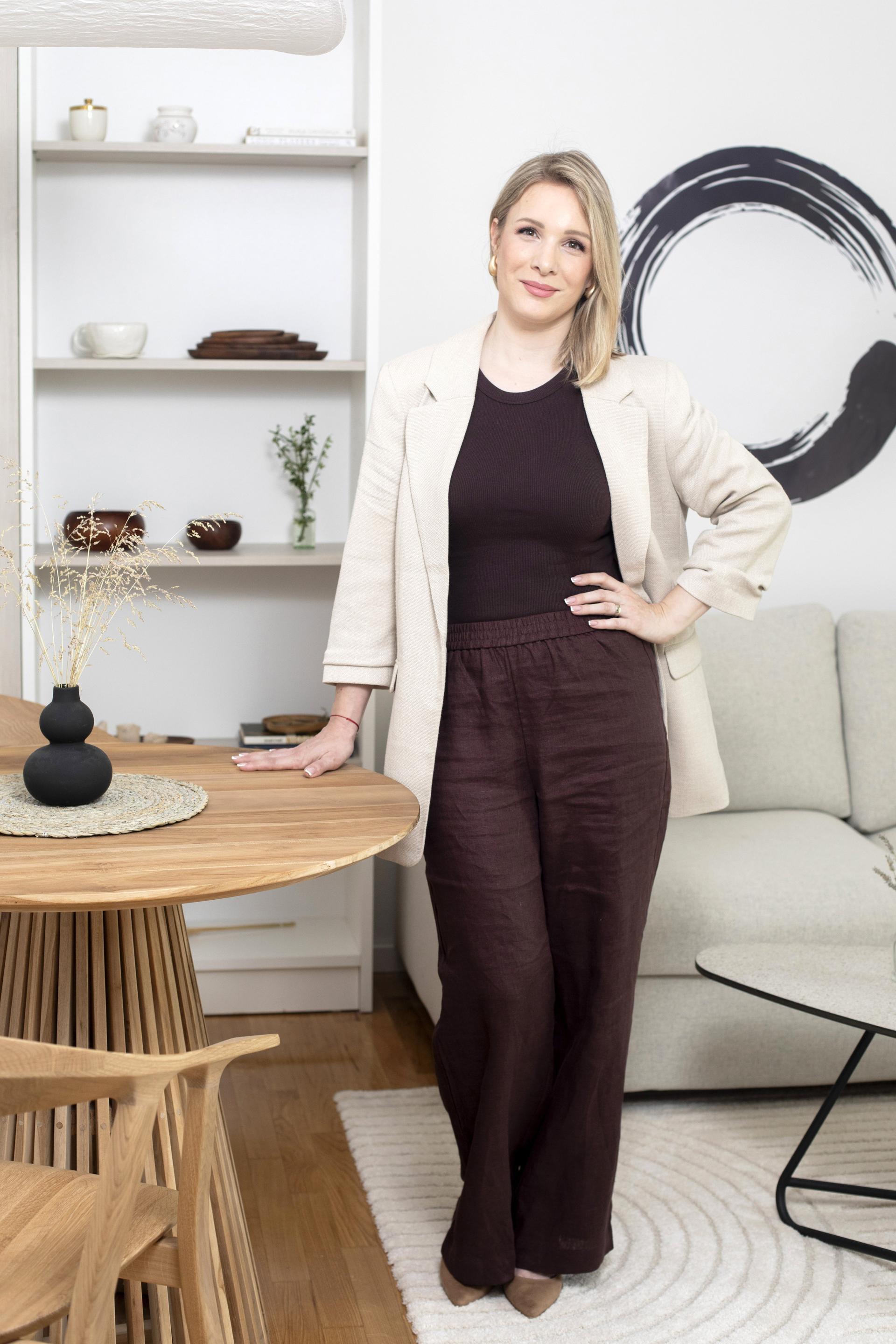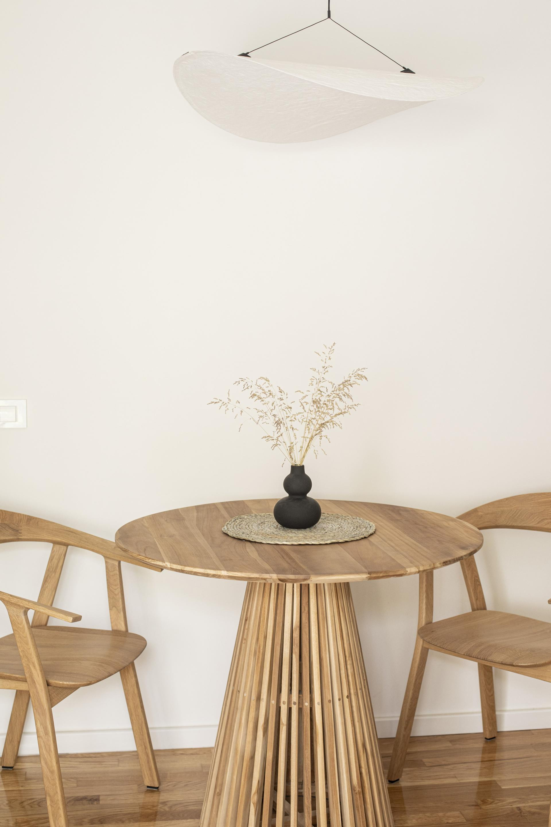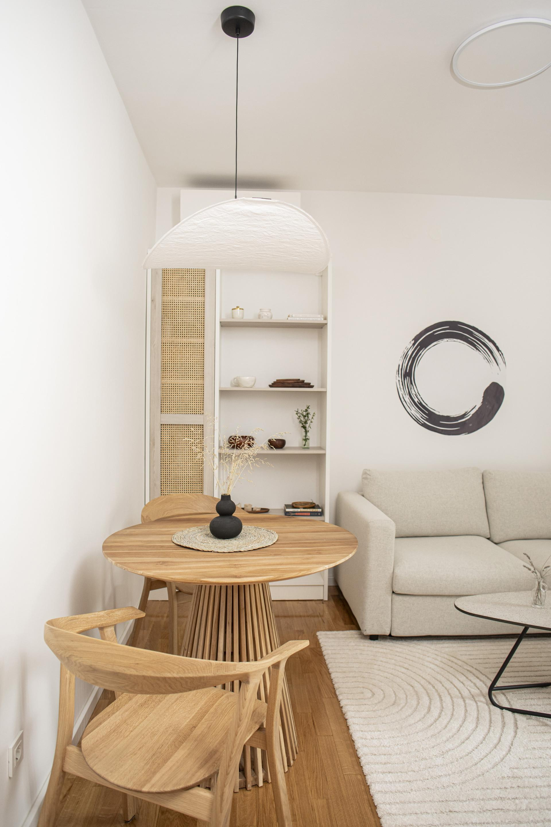 Dva najupečatljivija komada u prostoru su prekrasni drveni Rhomb stolci iz Prostorije i Tense visilica koja se, kaže dizajnerica, savršeno uklapa u japandi stil uređenja.