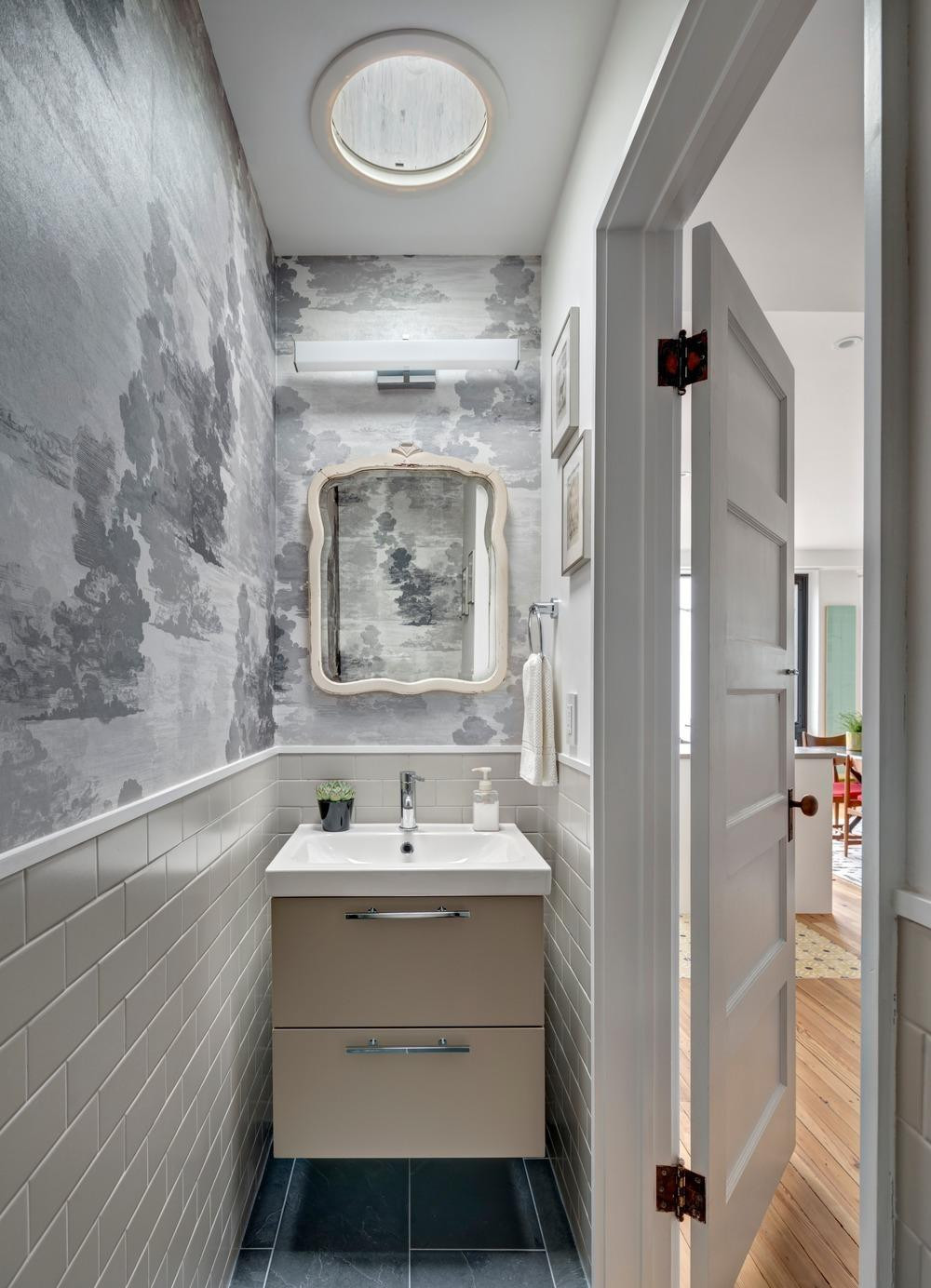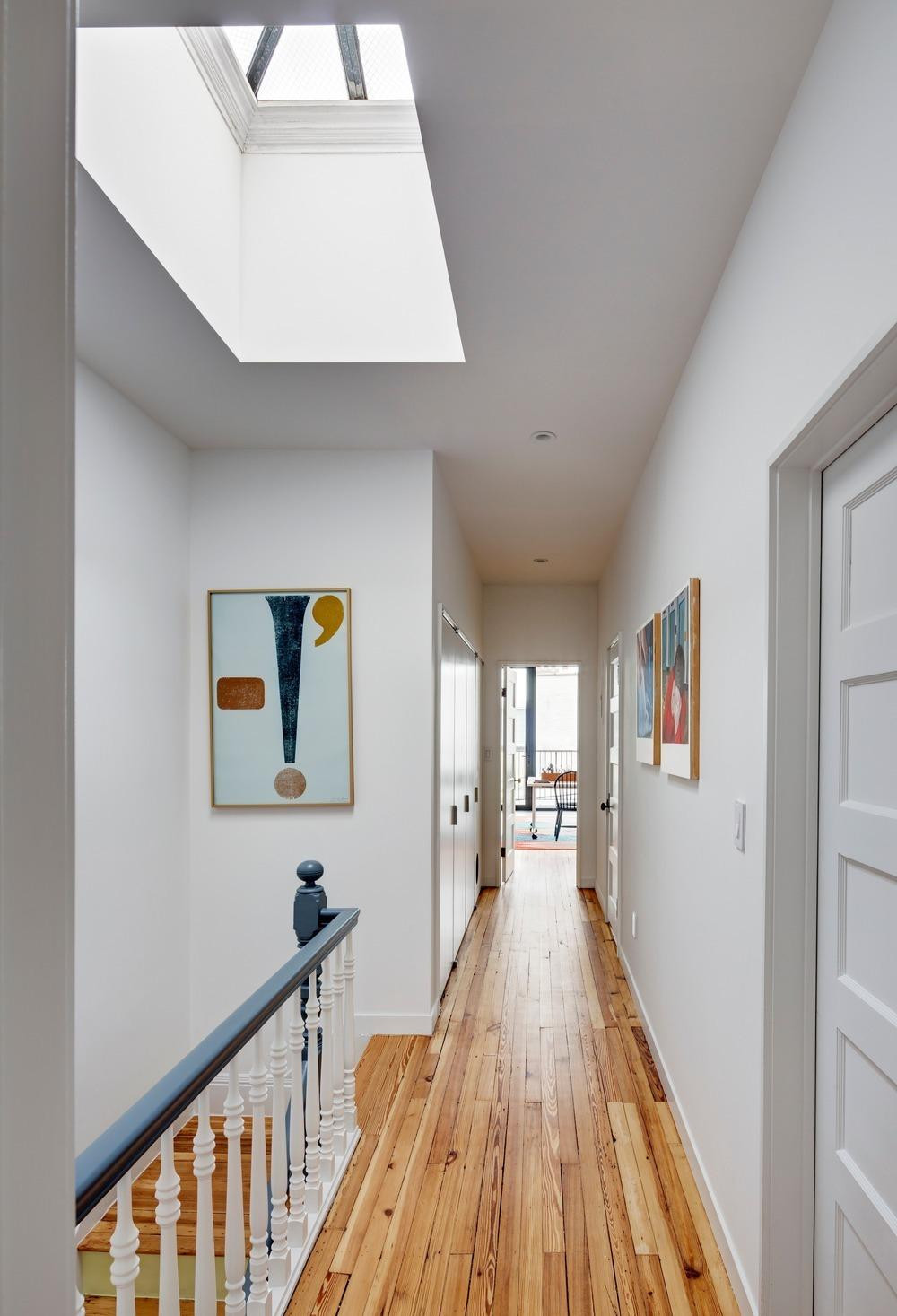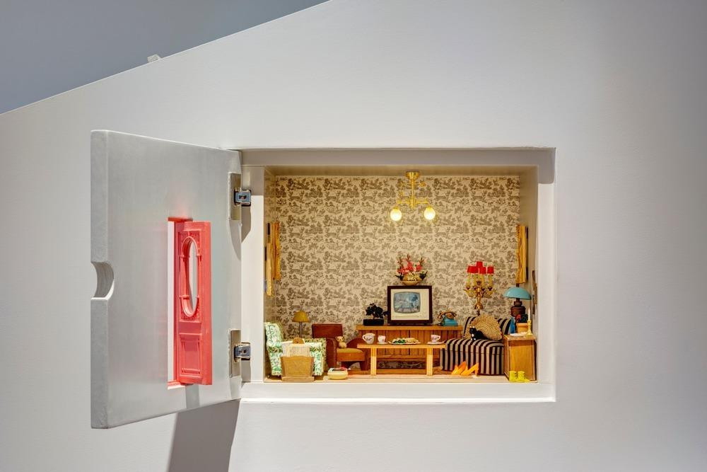 Poseban detalj u zidu s policama je diorama dnevnog boravka skrivena iza minijaturnih vrata, koju je vlasnica sama dizajnirala. Ova vrata obojana su identično ulaznim vratima kuće, čime se postiže duhovita vizualna igra. U nišama su izložene i neobične skulpture ruku te Rubikove kocke presvučene motivima oblaka – također vlasničini radovi. Niše su dodatno naglašene jarkom nijansom “Melon Popsicle” iz Benjamin Moore palete. Prirodno svjetlo u prostor donosi krovni prozor koji propušta svjetlost čak do razine prizemlja, kroz drugi kat.