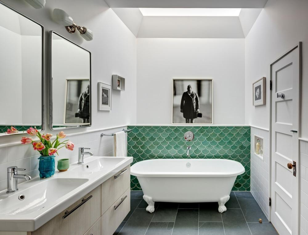 Gdje god je bilo moguće, korišteni su reciklirani materijali. Originalna drvena vrata s urezima, kvake i ostala stolarija ponovno su upotrijebljeni, a borove podne obloge su restaurirane. U zid s policama integrirana je i drvena jedinica za pohranu. Postojeće stubište, ulazna vrata i predulaz dodatno su naglašeni živim bojama, koje ističu siluete i detalje originalnog drvenog interijera.