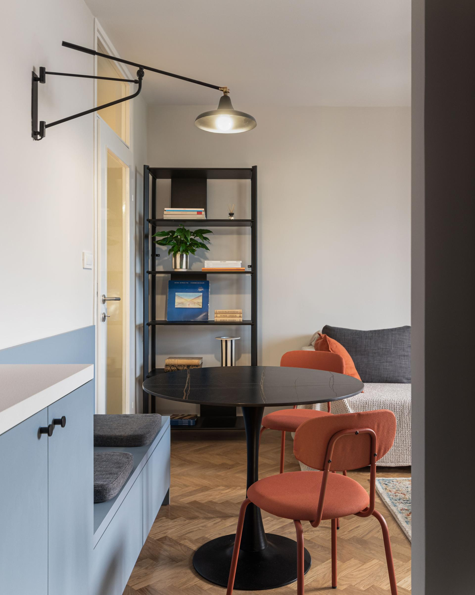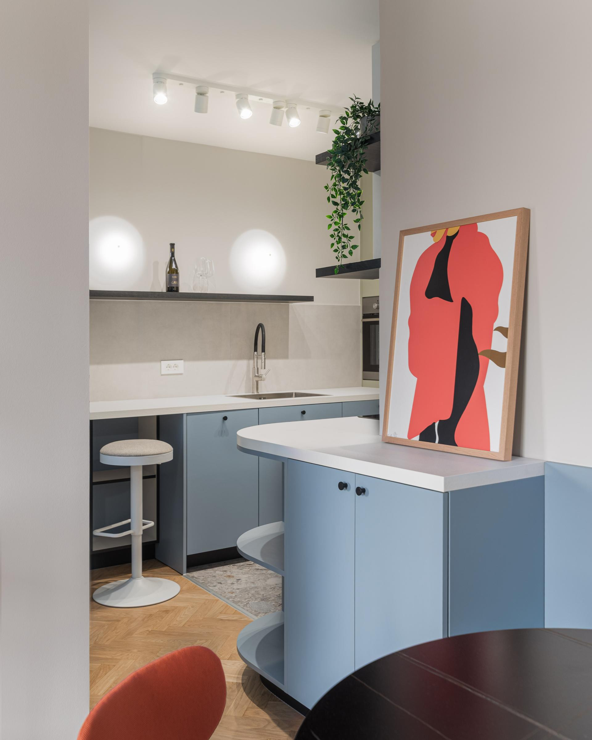S obzirom na to da mali stanovi mogu podnijeti boje, arhitektice su se namjerno poigrale različitim nijansama kako bi unijele toplinu i razigranost. Cilj im je bio da se bilo tko tko u njemu boravi osjeća kao kod kuće, ali da stan ipak ostane dovoljno neutralan da svatko može unijeti vlastiti osobni pečat.