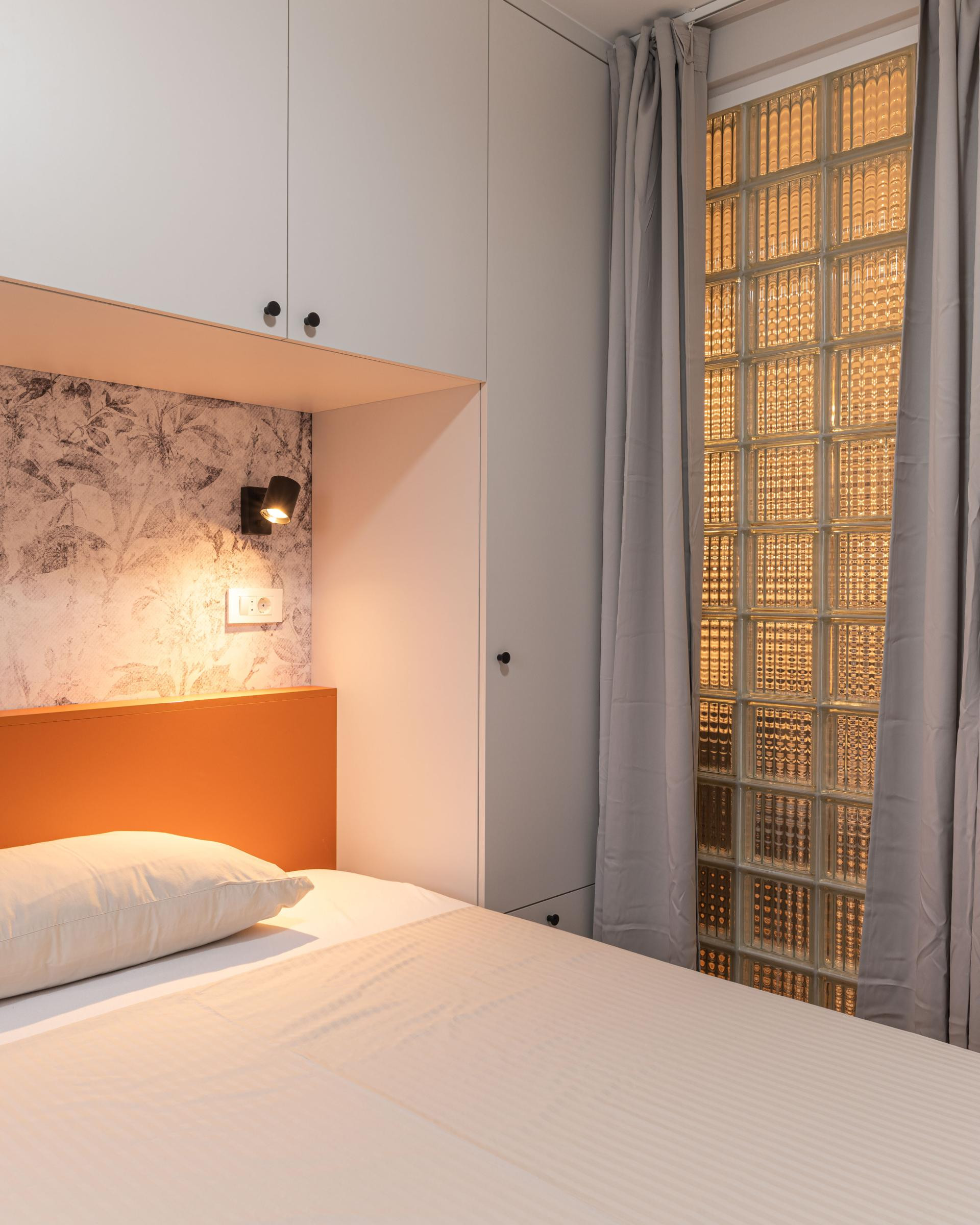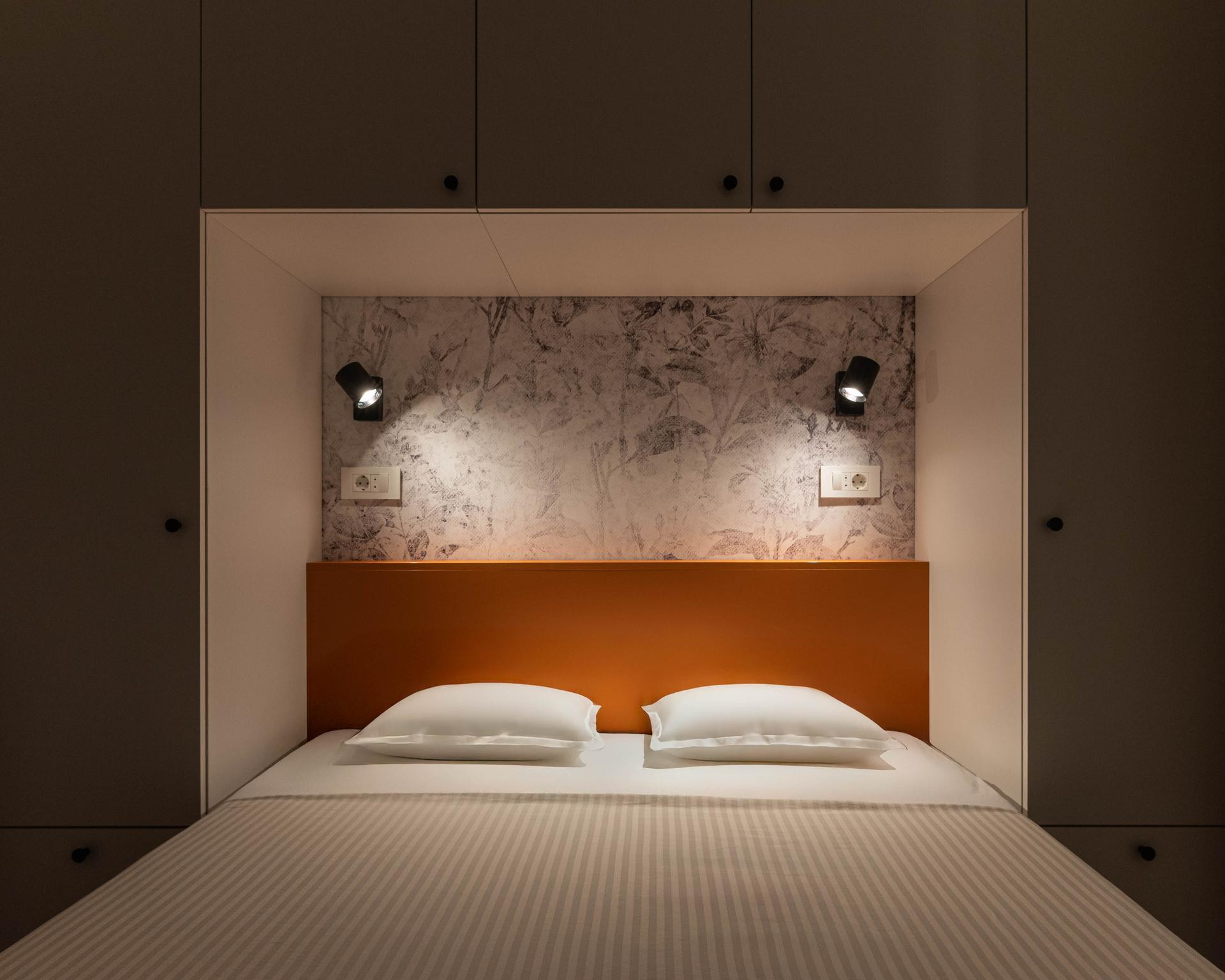 Kako je spavaća soba vrlo malena, a ipak namijenjena za dvije osobe, arhitektice su morale promišljeno smjestiti bračni krevet i ormar. Najlogičnije rješenje bilo je postaviti krevet po sredini s debljim uzglavljem koje služi kao noćni ormarić, a s obje strane smjestiti ormare do stropa, povezane mostom u sredini, što je rješenje poznato iz starijih interijera.