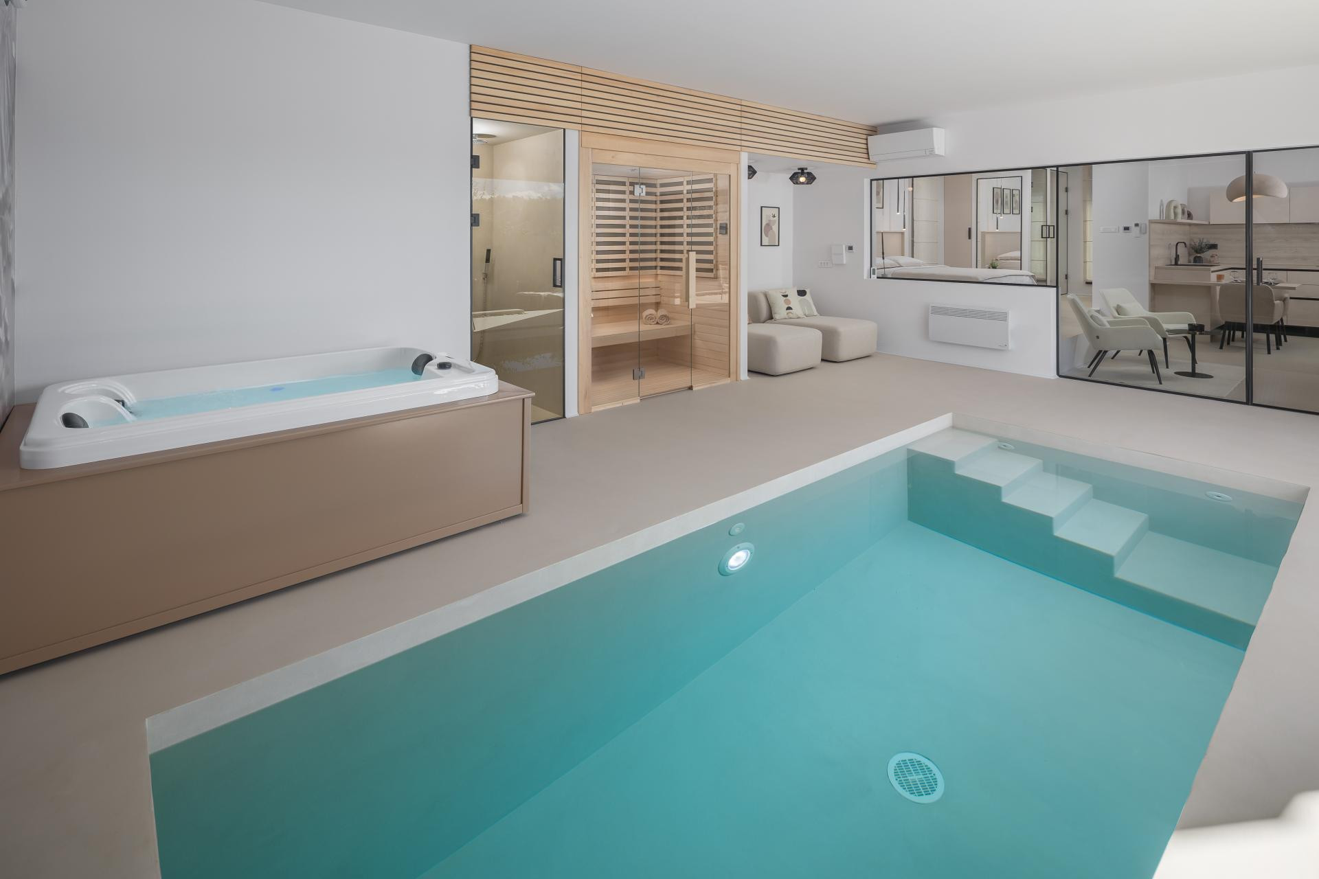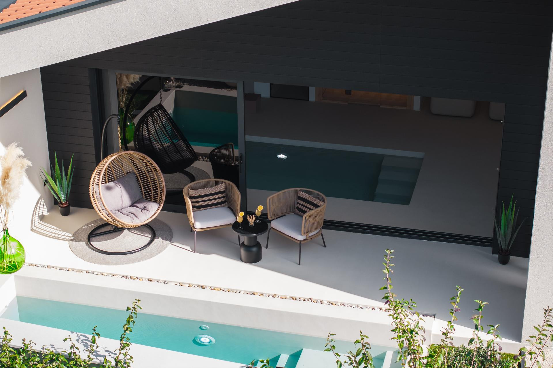 Iz zone wellnessa izlazi se izravno na terasu s vanjskim grijanim bazenom, ležaljkama i kutkom za opuštanje