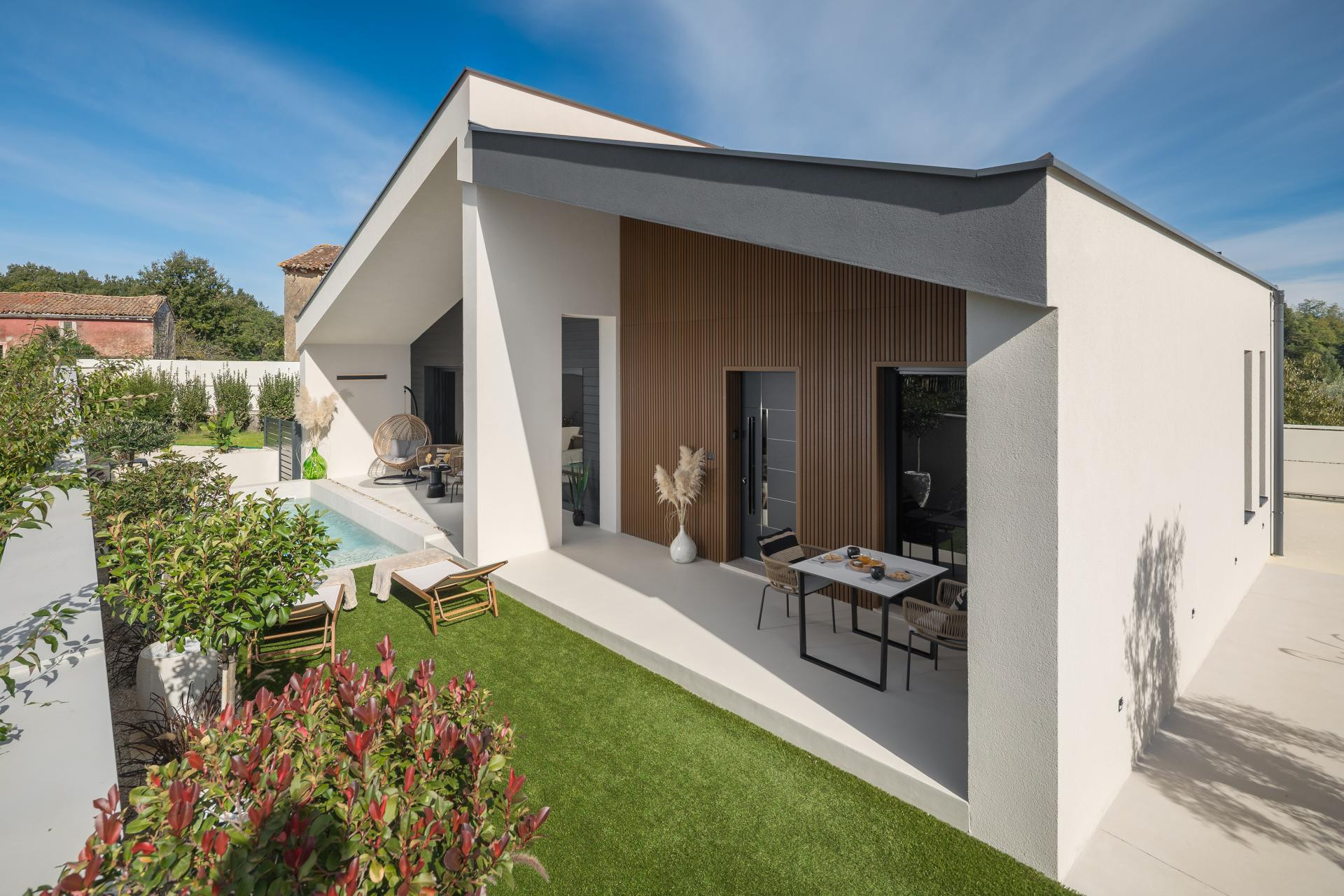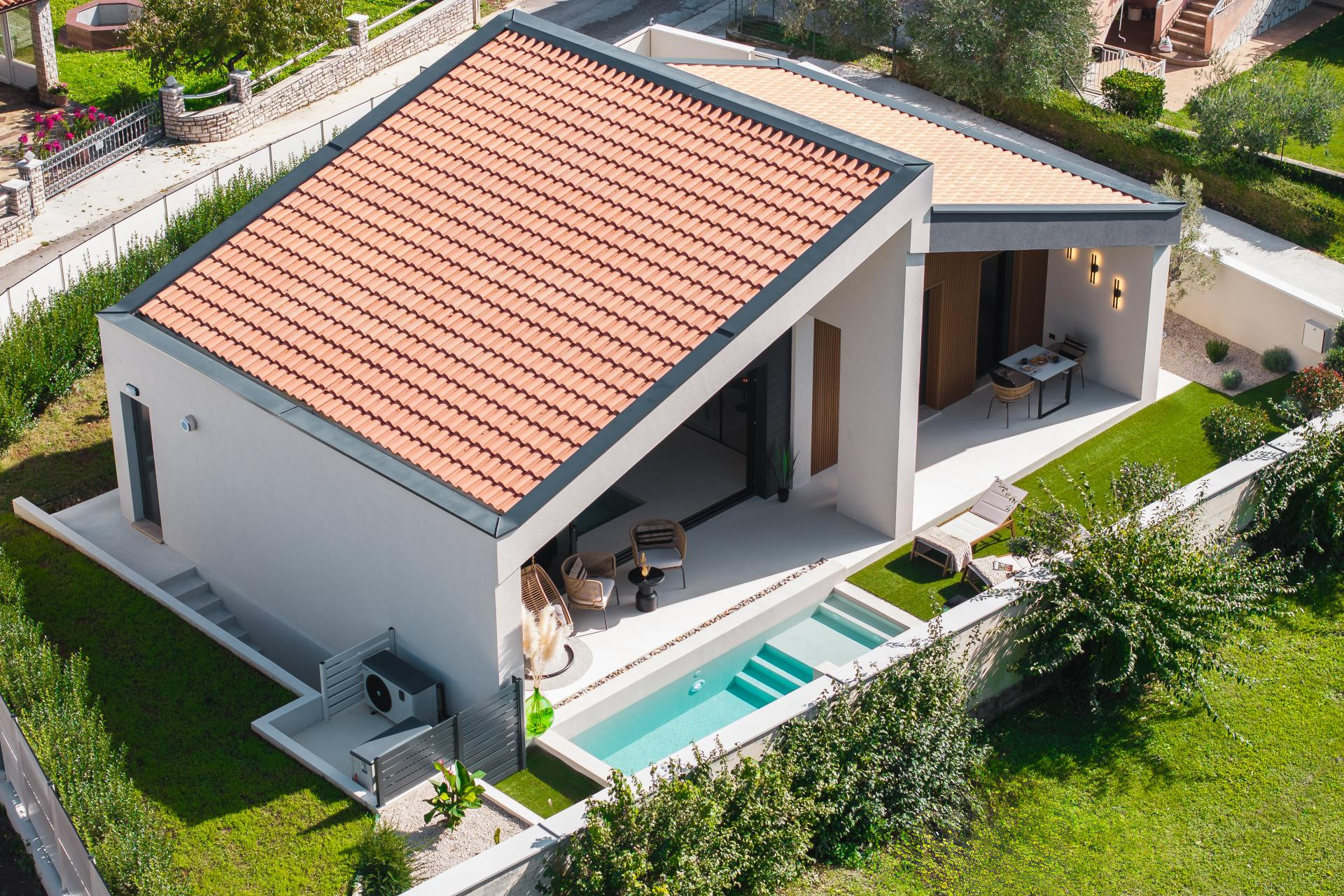 Kuća je zidana te pažljivo oblikovana na način da maksimalno iskoristi svaki metar manje parcele, a pritom zadrži dojam prostranosti i privatnosti. Eksterijer je suvremen i profinjen, s toplim tonovima i detaljima od drva i mikrocementa, koji stvaraju prirodan i luksuzan dojam.