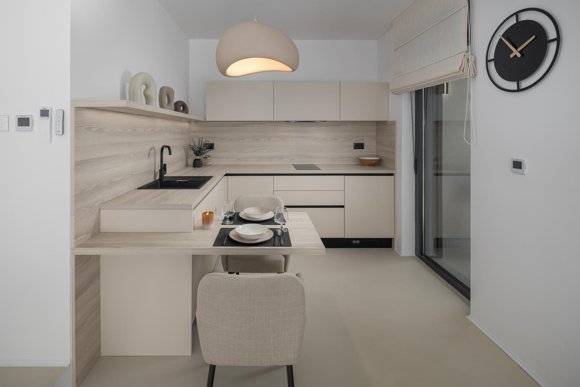 Kuhinja, ormari, kupaonski elementi, krevet i drvene obloge izrađeni su posebno za ovaj prostor