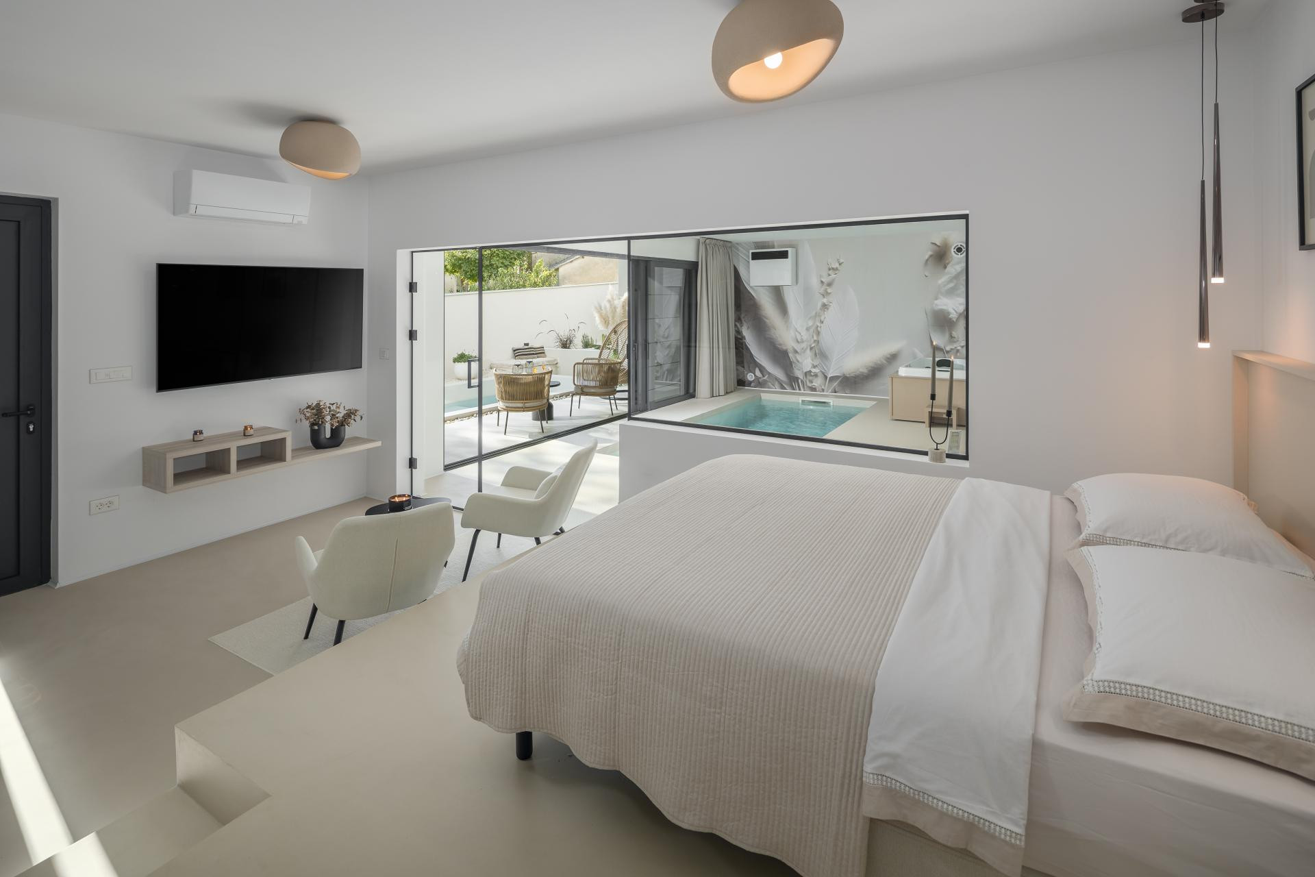 Spavaća je zona ciljano povišena tako da se iz kreveta pruža pogled na bazen