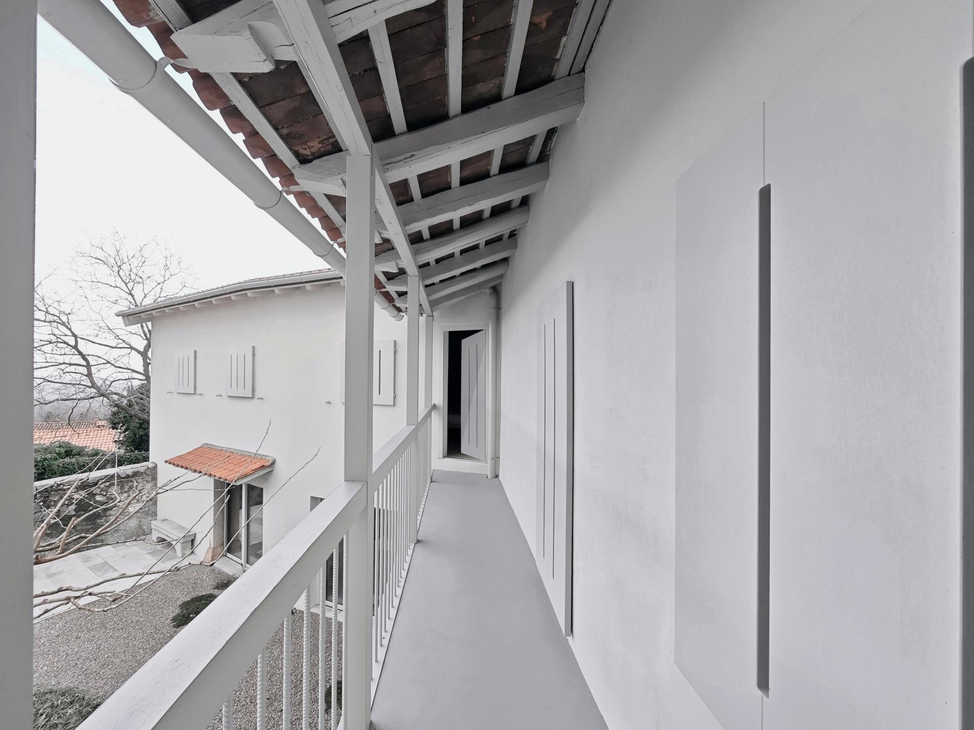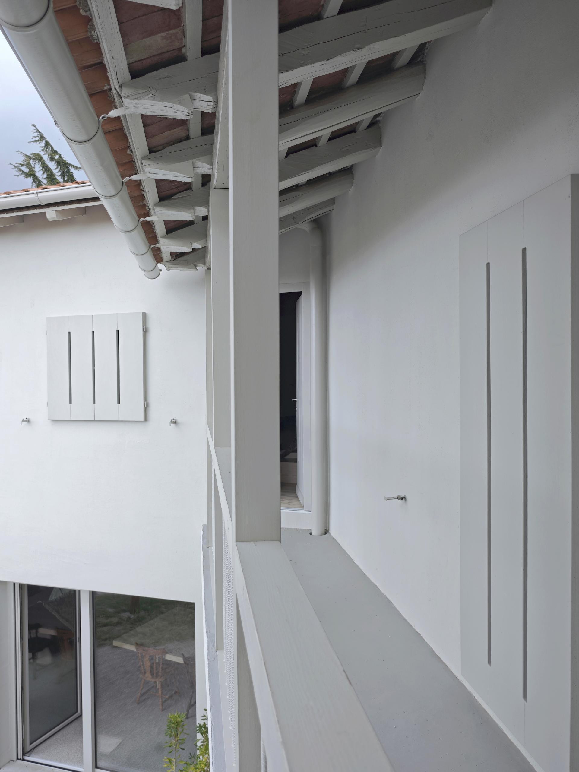 Na prvom katu, spavaće sobe gledaju na vanjsko dvorište s tradicionalnog natkrivenog drvenog balkona, ili ganka, a prozori su zaštićeni restauriranim kapcima. Svi su obojeni u bijelo da bi se stopili s vanjskom žbukom.