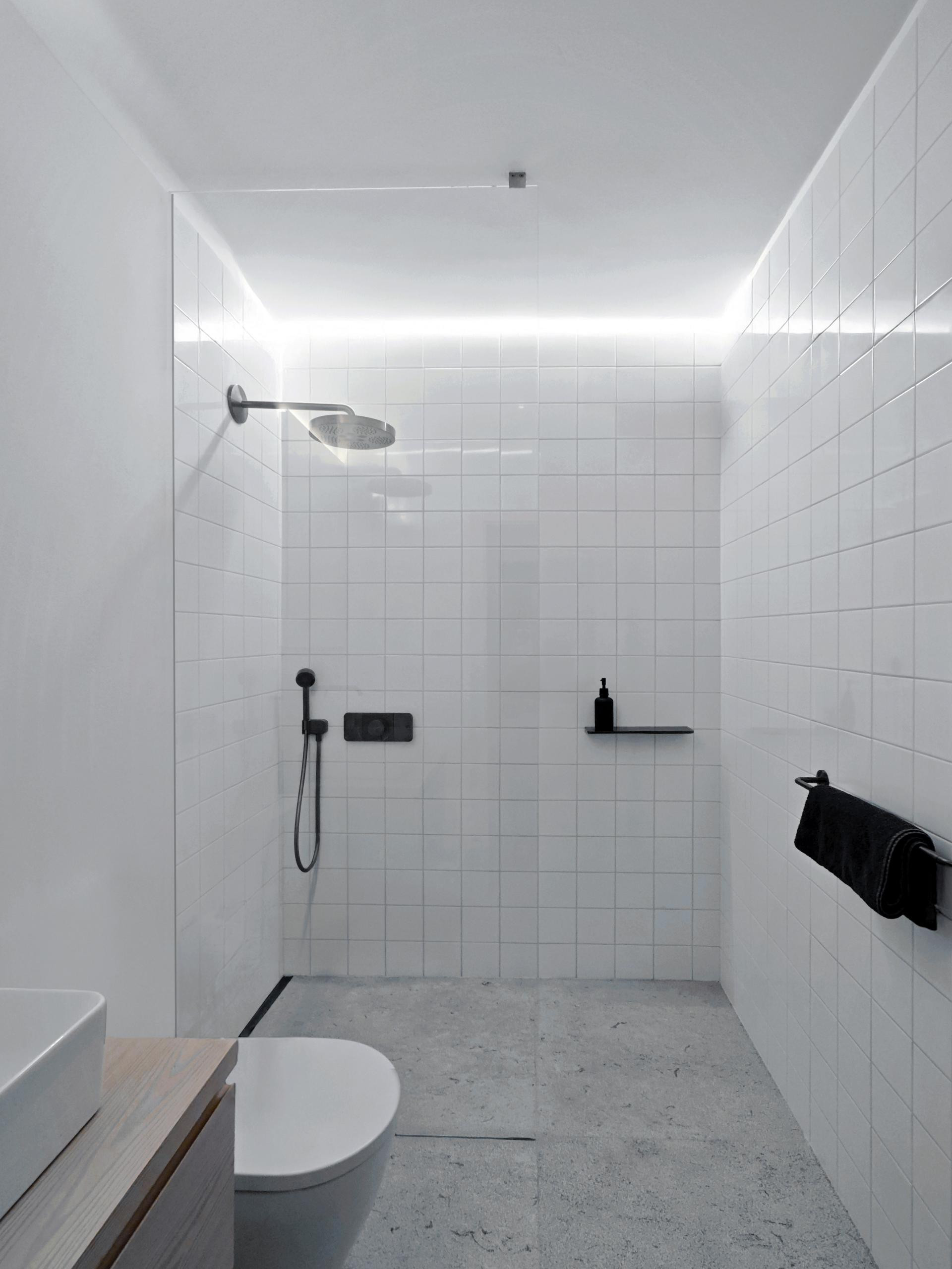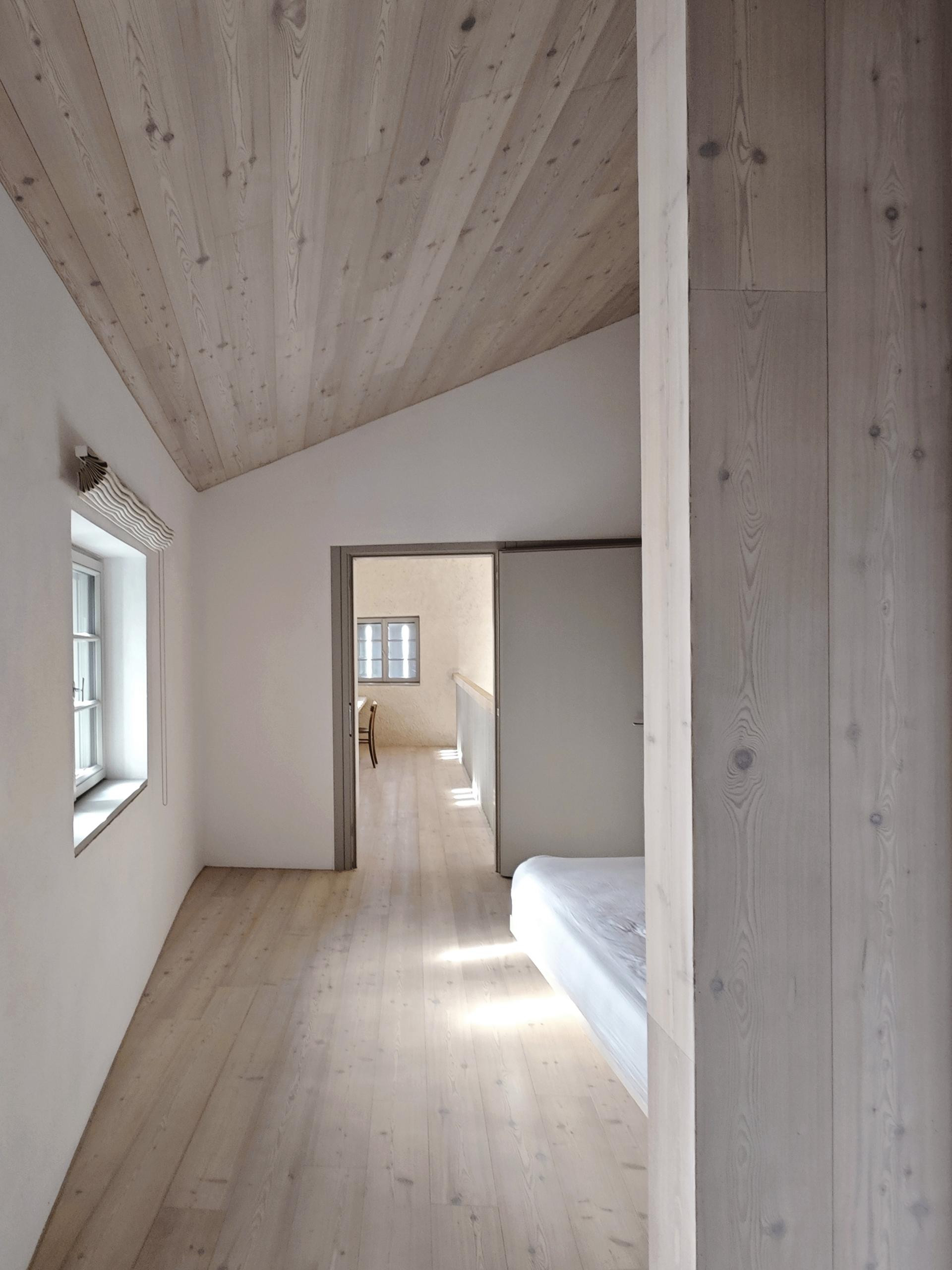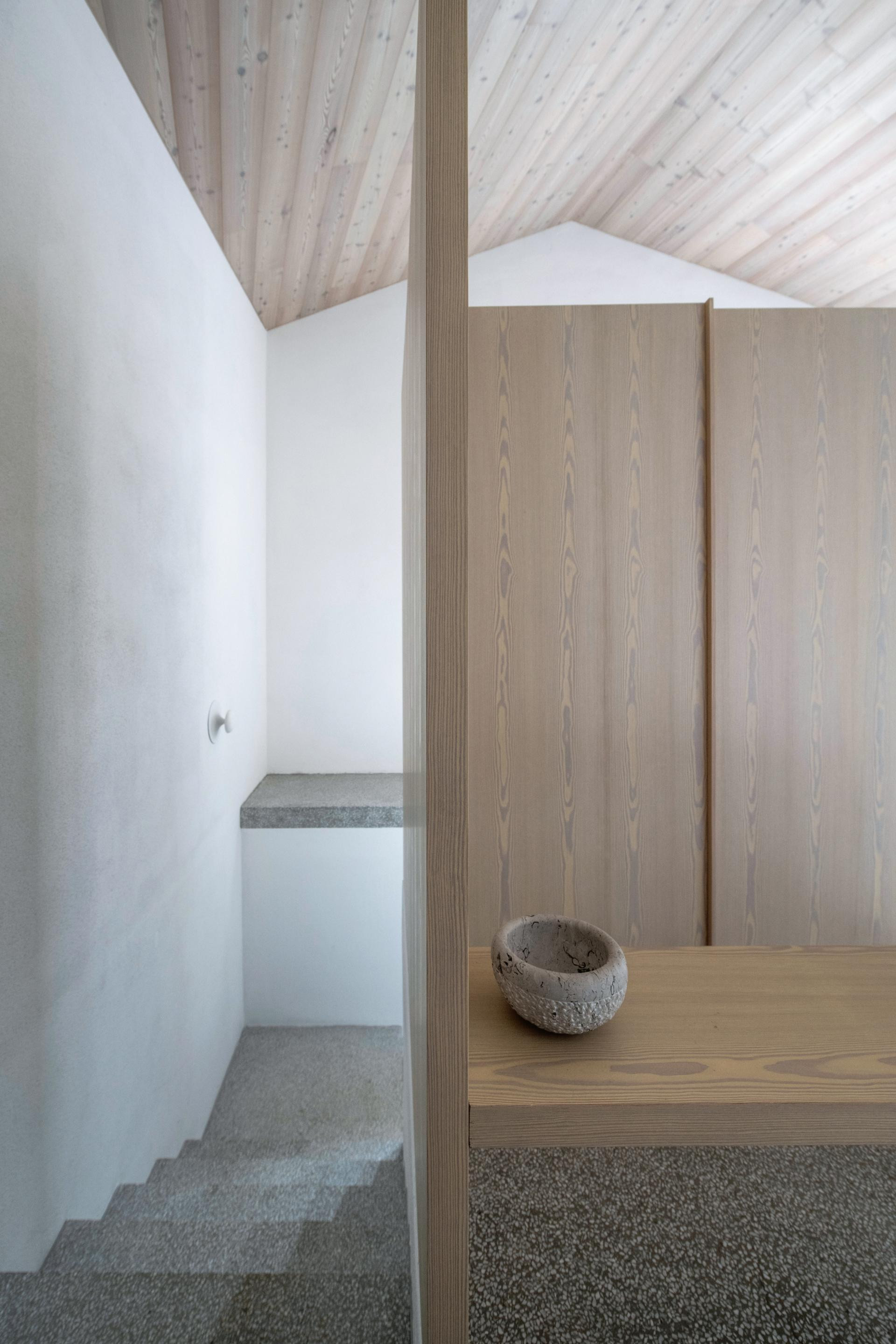 Dok su zajednički prostori Kuće Avber obrađeni grubljim površinama, poput postojećih kamenih zidova i sivo-pjegave žbuke, gornje etaže imaju topliji osjećaj s velikim površinama svijetlog drva, uključujući stropne obloge.