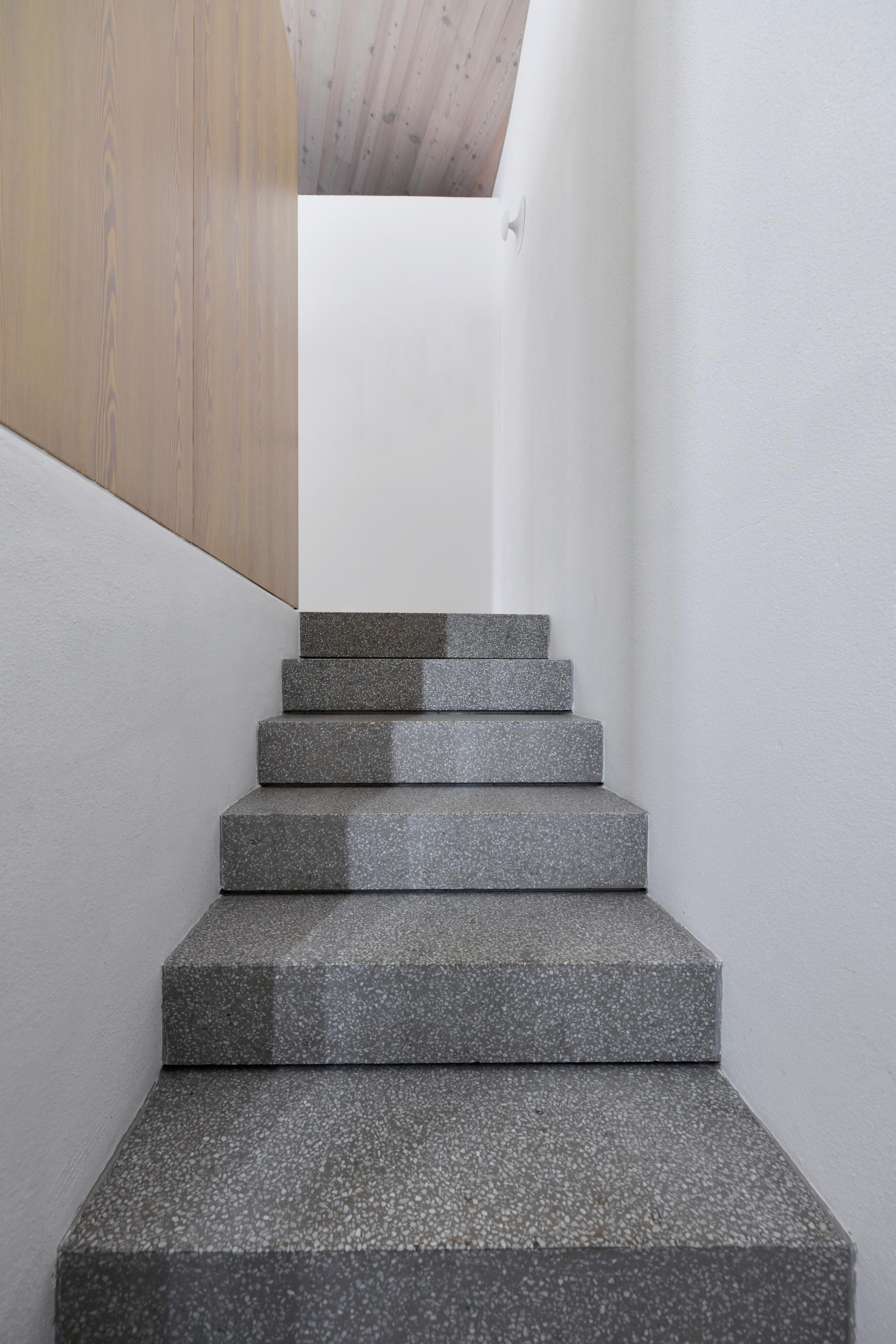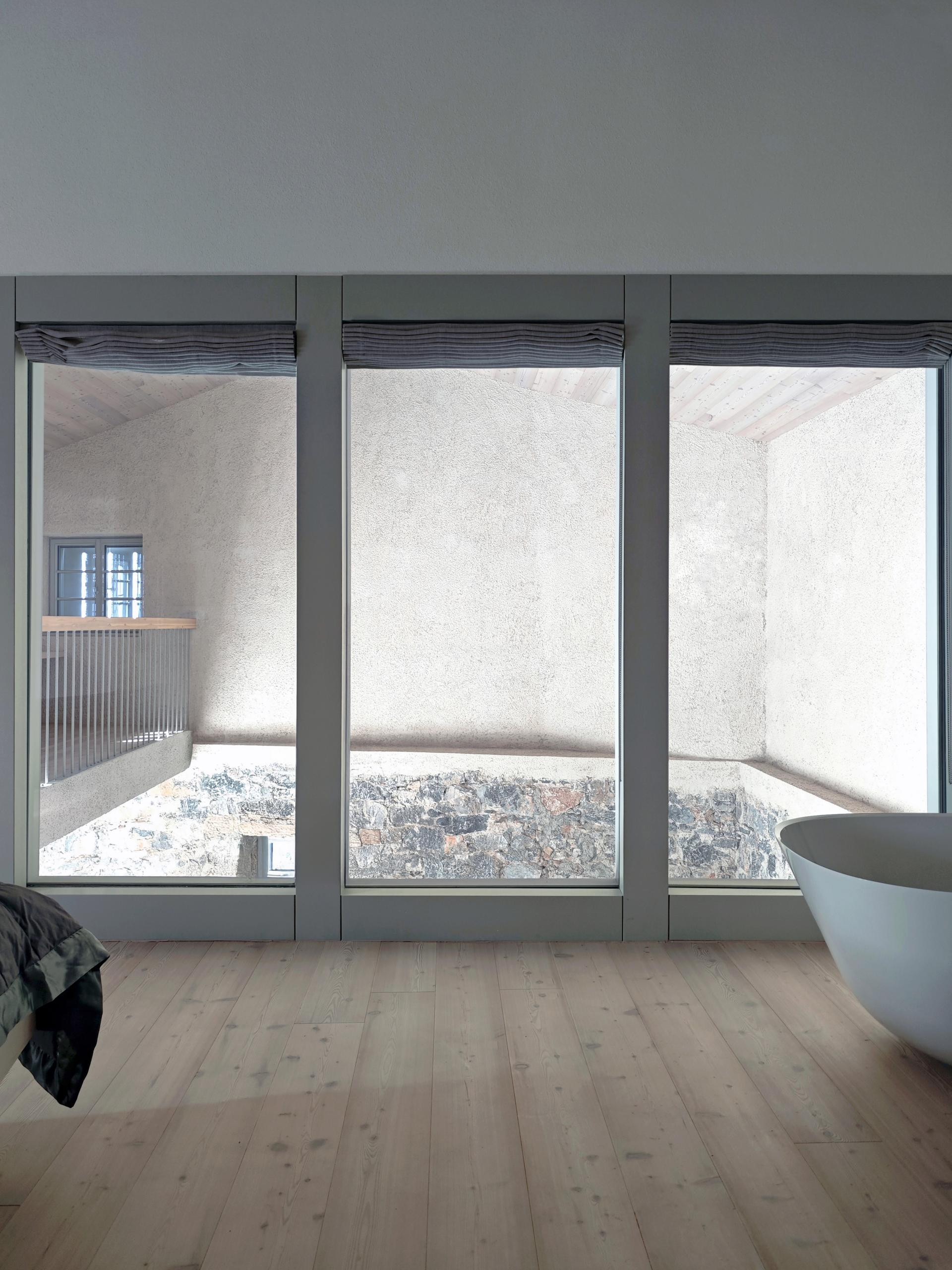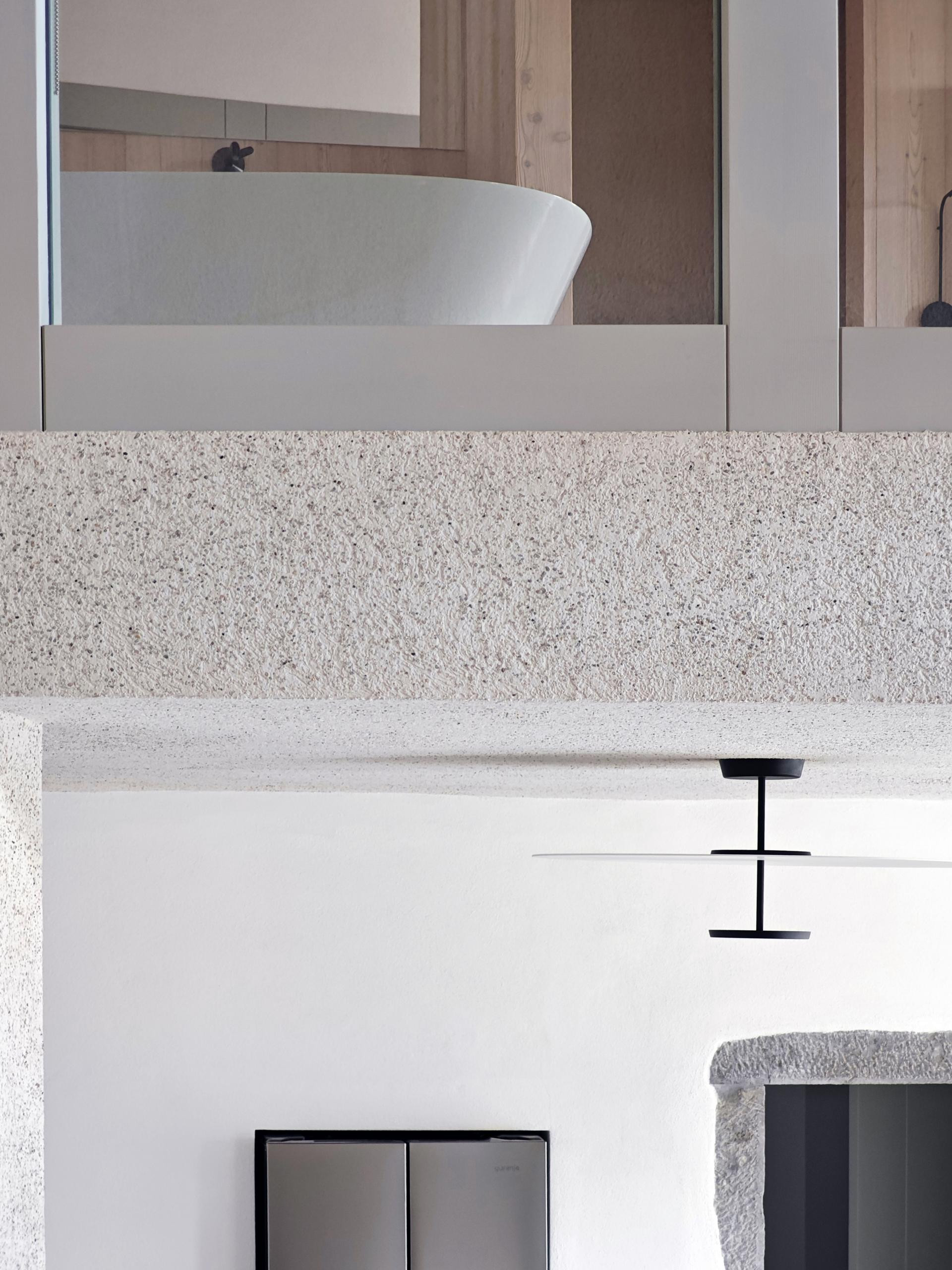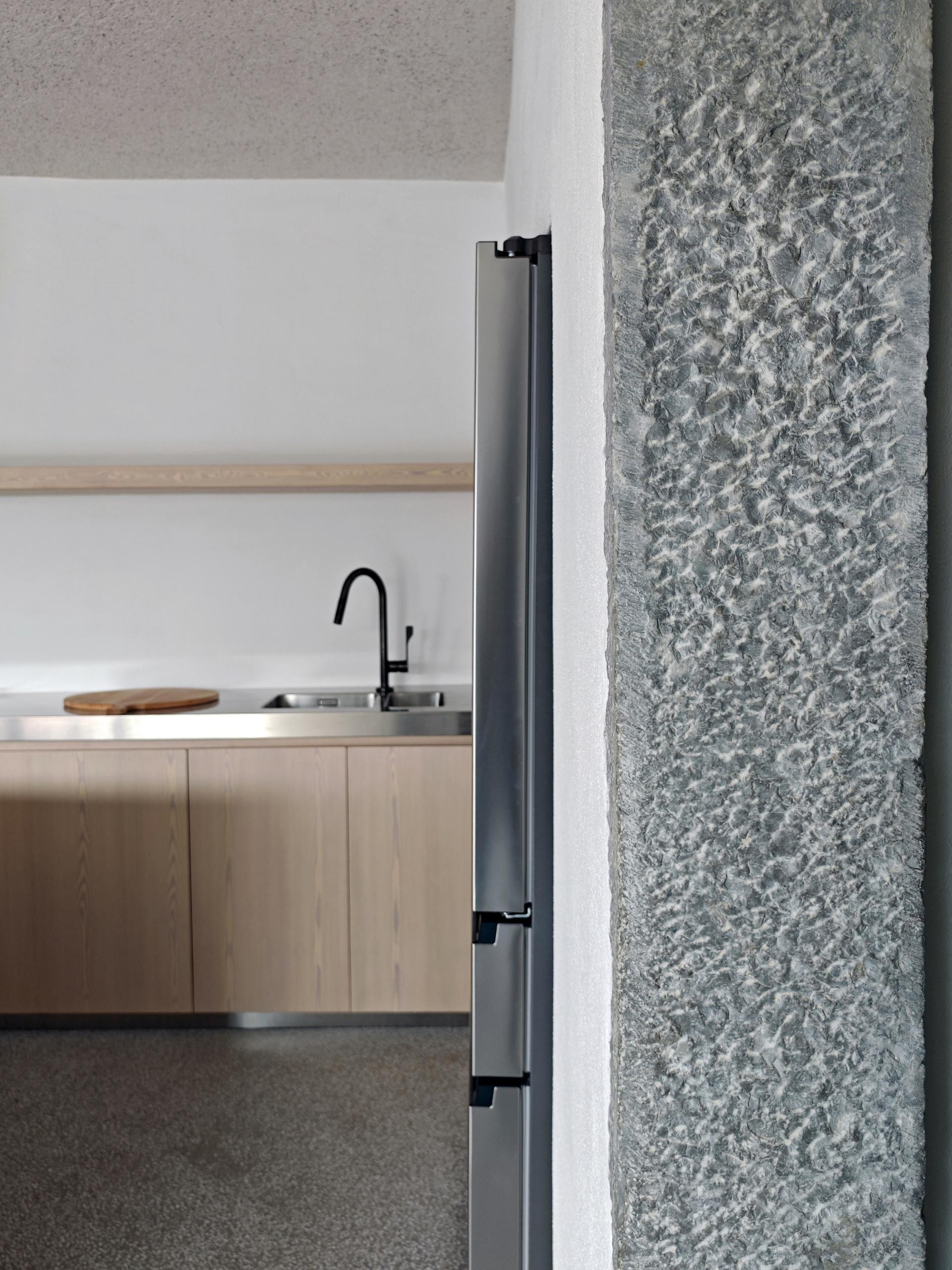 Nekadašnji poljoprivredni elementi dobivaju nove uloge: korito za krave transformira se u sustav niskih polica, a niše u gospodarskim dijelovima pretvaraju se u funkcionalne prostore za pohranu. Dnevni prostori smješteni u prizemlju blisko su povezani s dvorištem, s dvostruko visokim prostorom za sjedenje okruženim izloženim kamenim zidovima sa starim utorima u podnožju koji služe kao niske police.