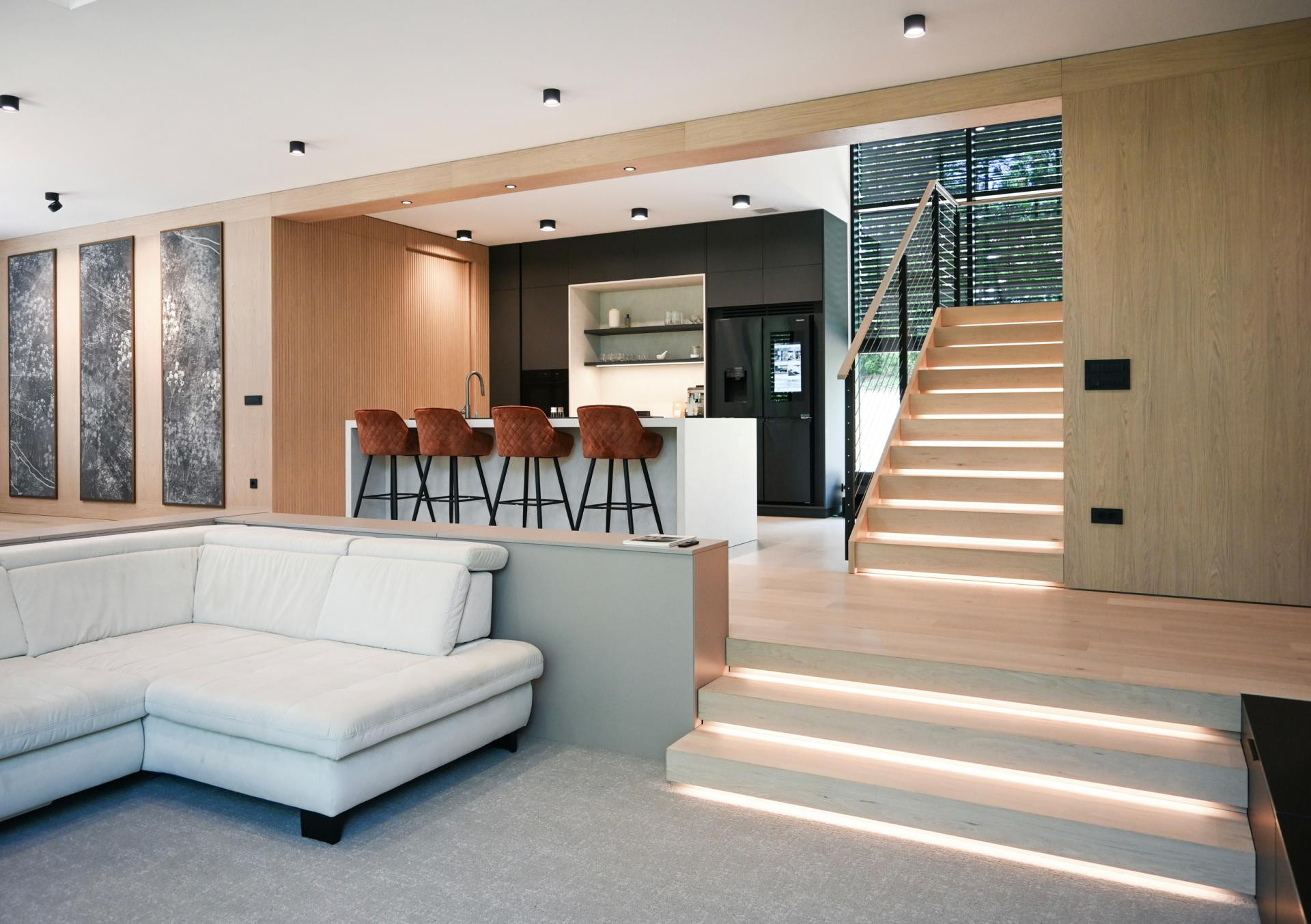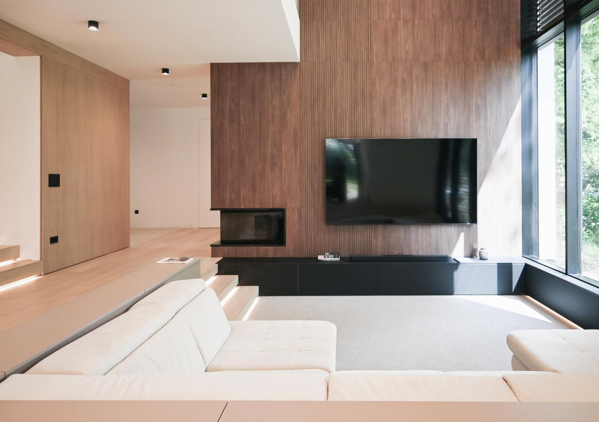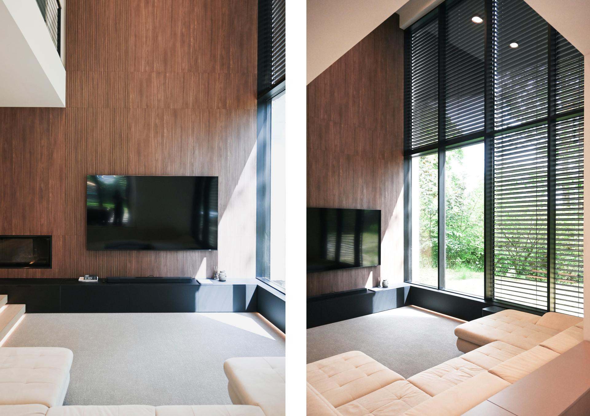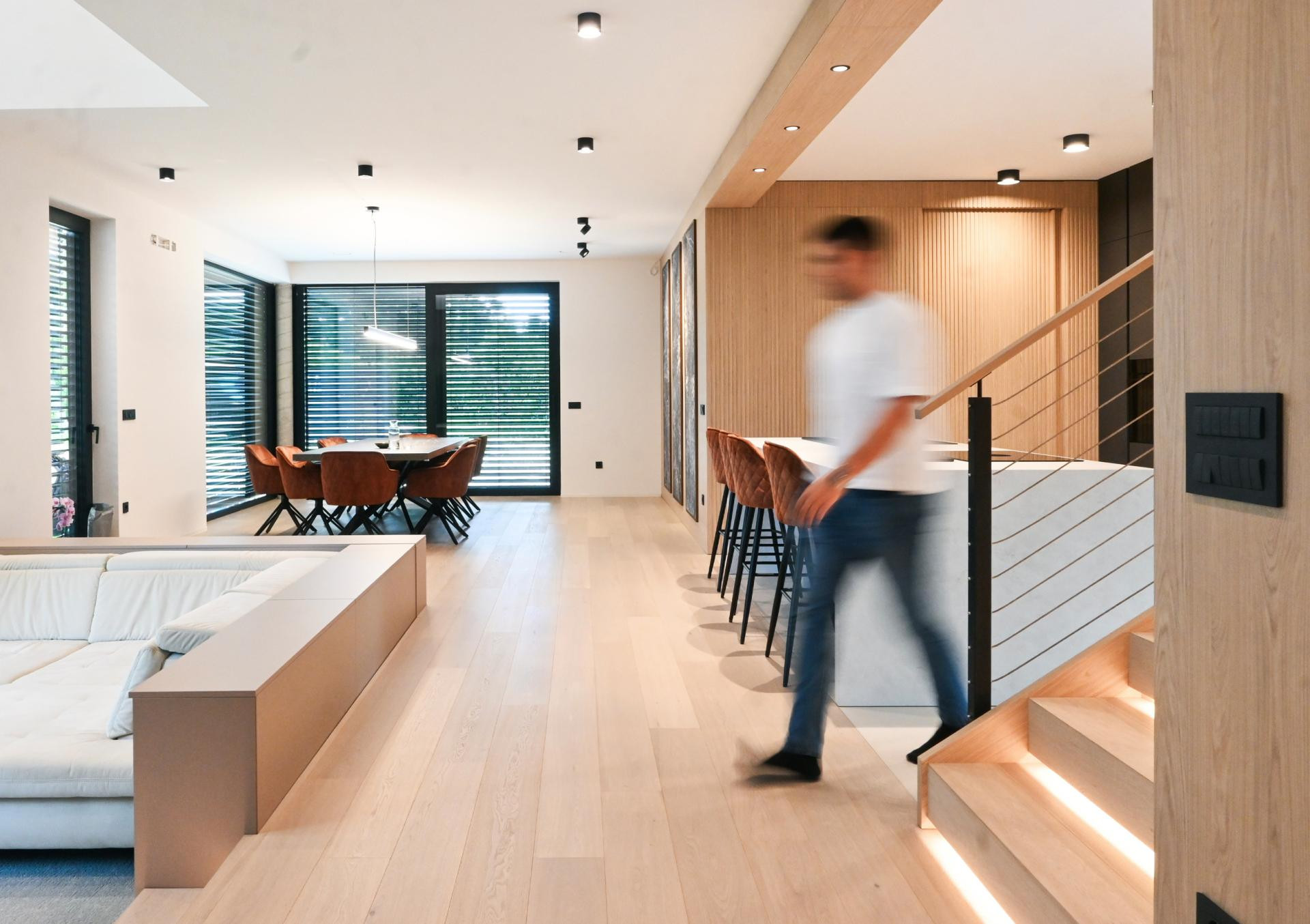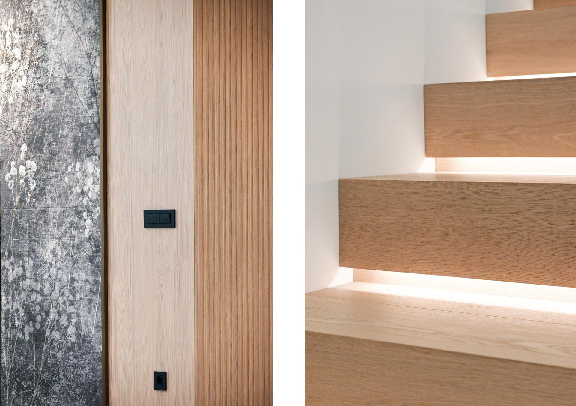 Interijerom dominiraju pločasti materijali u dekoru svijetlog hrasta, koji prostoru daju toplinu i prirodan izgled. U bloku spavaćih soba i na zidu gdje je televizor korištena je tamnija varijanta - dimljeni hrast, kako bi se postigla intimnija atmosfera. Od podnih obloga tu je svijetli parket, od kojeg je izrađeno i stubište, kao i keramika svijetlih tonova u velikim formatima. Na prvom katu, u spavaćim sobama, na zahtjev klijenata, pod je obložen itisonom, za dodatnu udobnost i toplinu.
