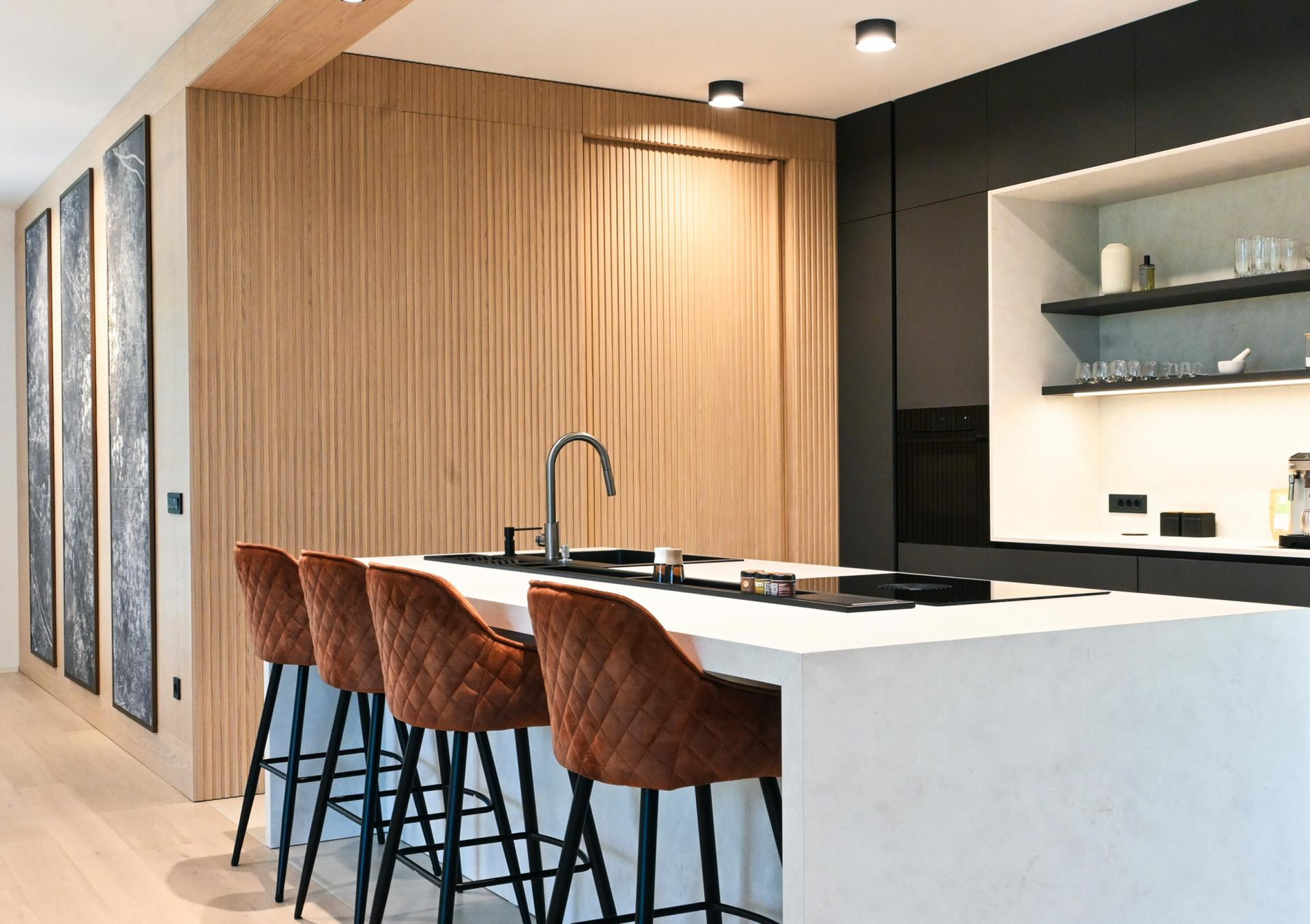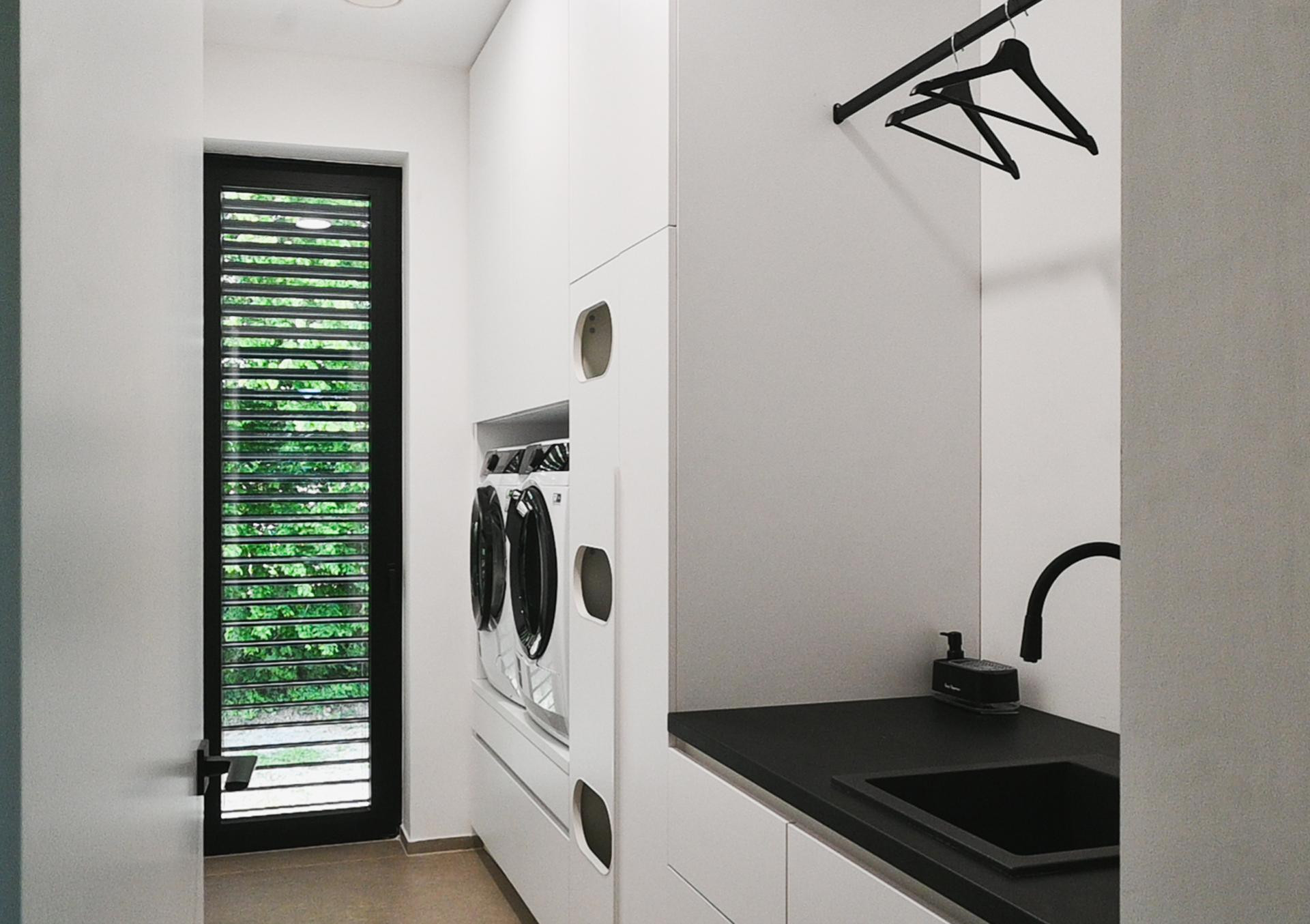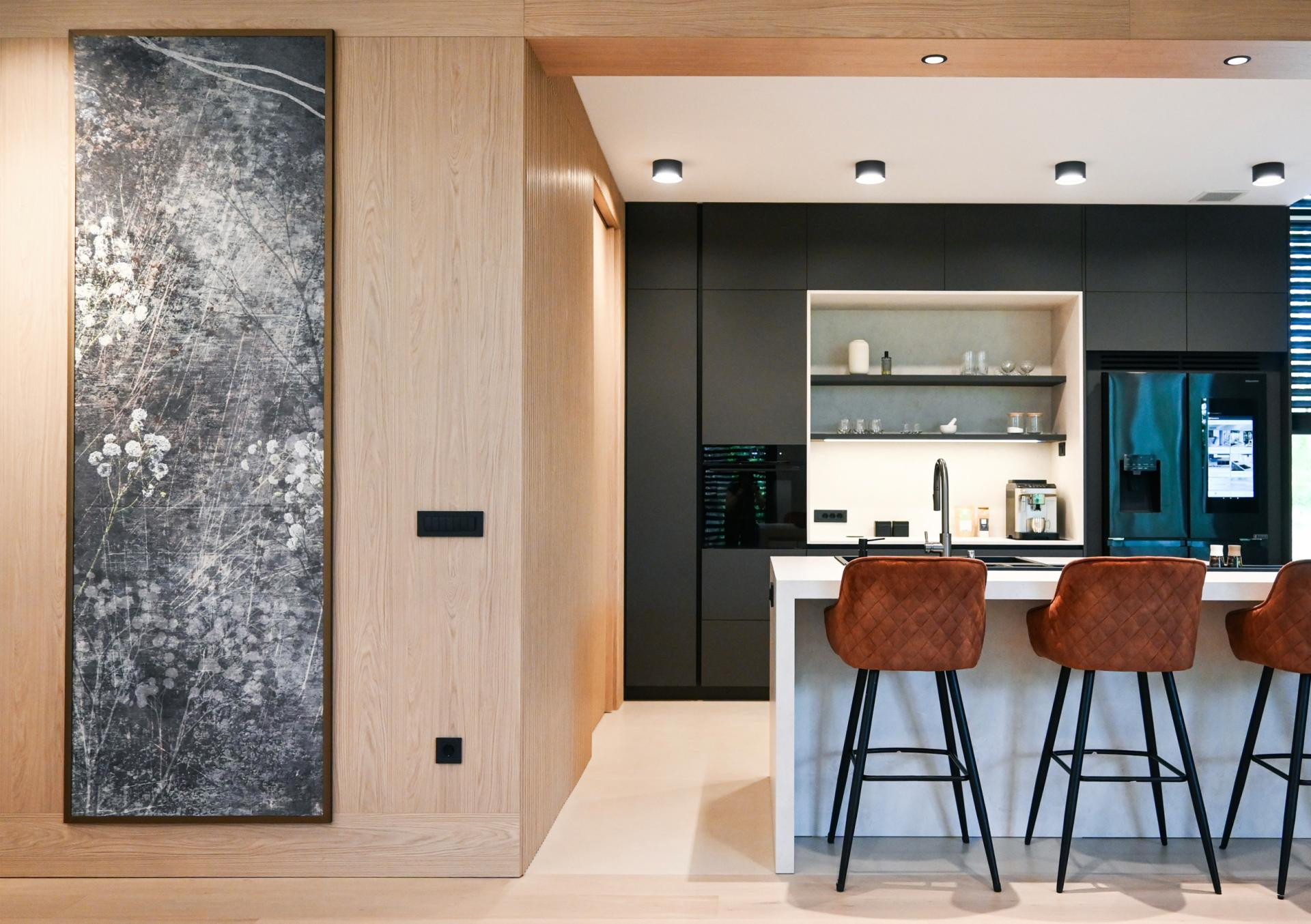 - Ulaz je prvi dojam koji vaš dom ostavlja, trebao bi biti atraktivan, ali prije svega funkcionalan. Ljepota ovog prostora u ovom primjeru ogleda se u njegovoj prostranosti i besprijekornoj povezanosti s dnevnim boravkom, što ga čini savršenim uvodom u ostatak doma. U ulaznom prostoru stvoren je zidni element koji kombinira nekoliko funkcija - konzolni ormarić, ogledalo, klupu s prostorom za odlaganje cipela, dio za vješanje jakni te skrivena vrata koja vode u spremište ispod stepenica. Ovaj višenamjenski element vizualno je povezan sa zidnom oblogom koja se nastavlja u dnevnom boravku, čime se postiže osjećaj kontinuiteta i prostorne ujednačenosti - opisuju arhitekti Isidora i Stefan te nastavljaju kako je kuhinja prvenstveno funkcionalna, s mnogo prostora za pohranu i velikim središnjim otokom. U njega je integriran poseban element - svojevrsni organizator koji uključuje praktične detalje poput prostora za sušenje nekoliko komada posuđa, držača za začine i ugrađene utičnice, što dodatno olakšava svakodnevnu upotrebu i održava radnu površinu urednom. Otok je izrađen u svjetlijim tonovima kako bi se stvorio kontrast u odnosu na visoke elemente kuhinje, čime se postiže ravnoteža u prostoru i dodatno naglašava središnji položaj otoka.