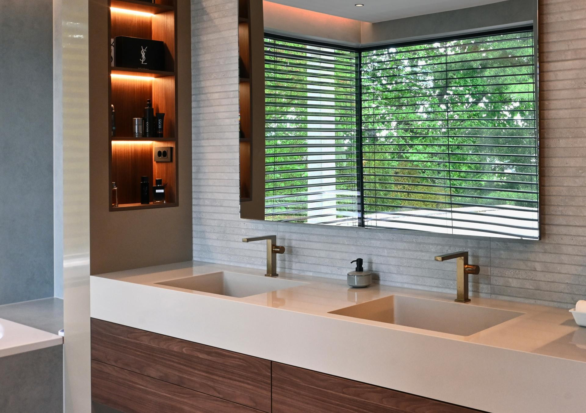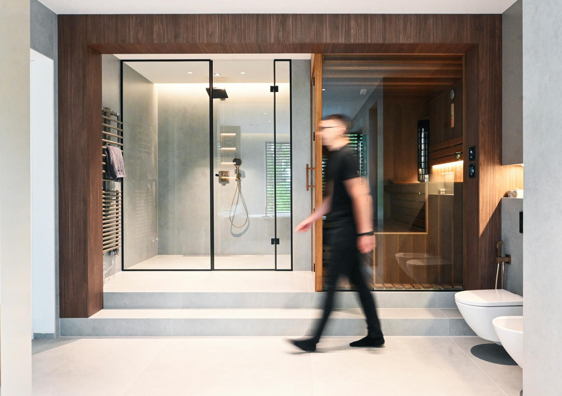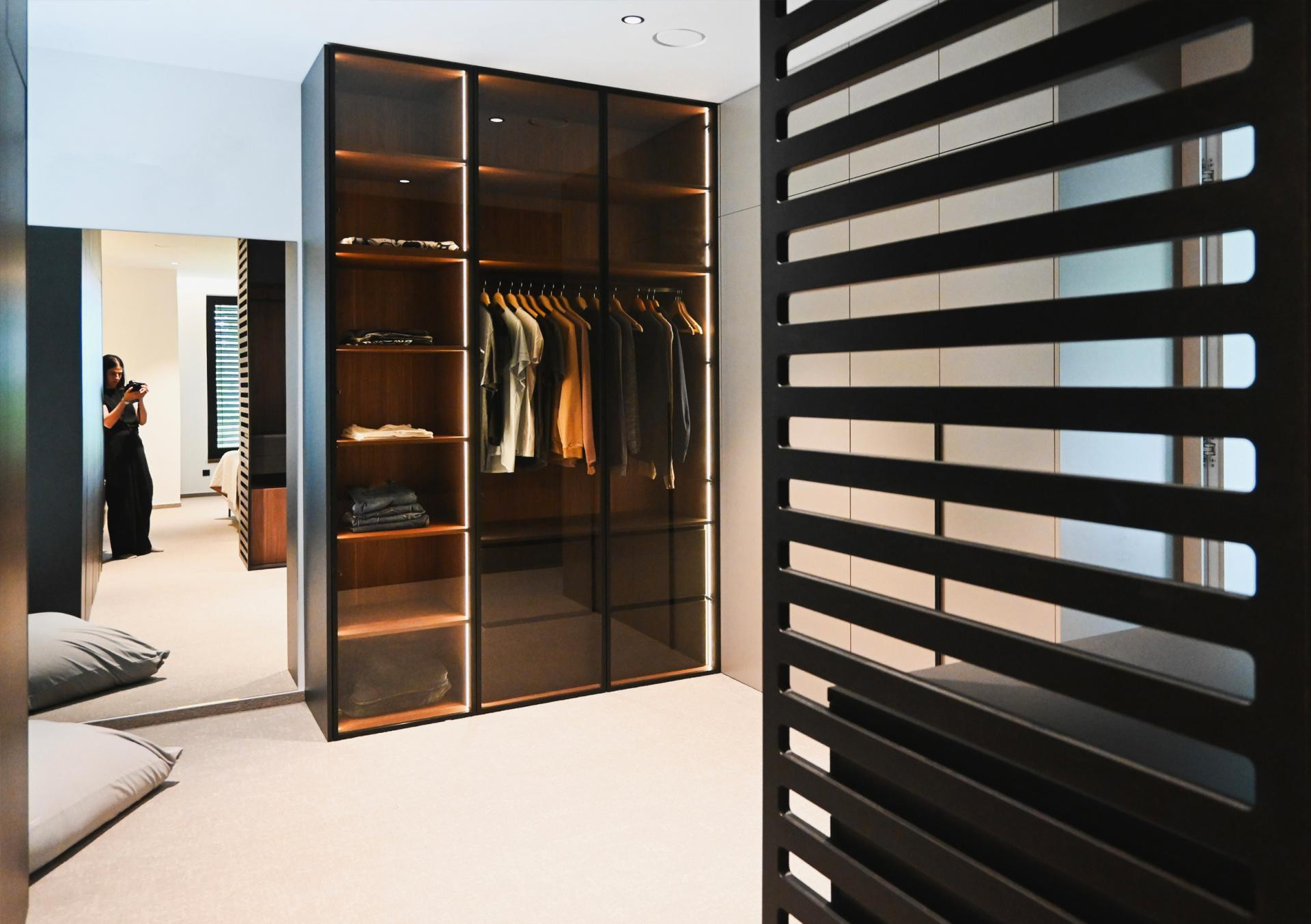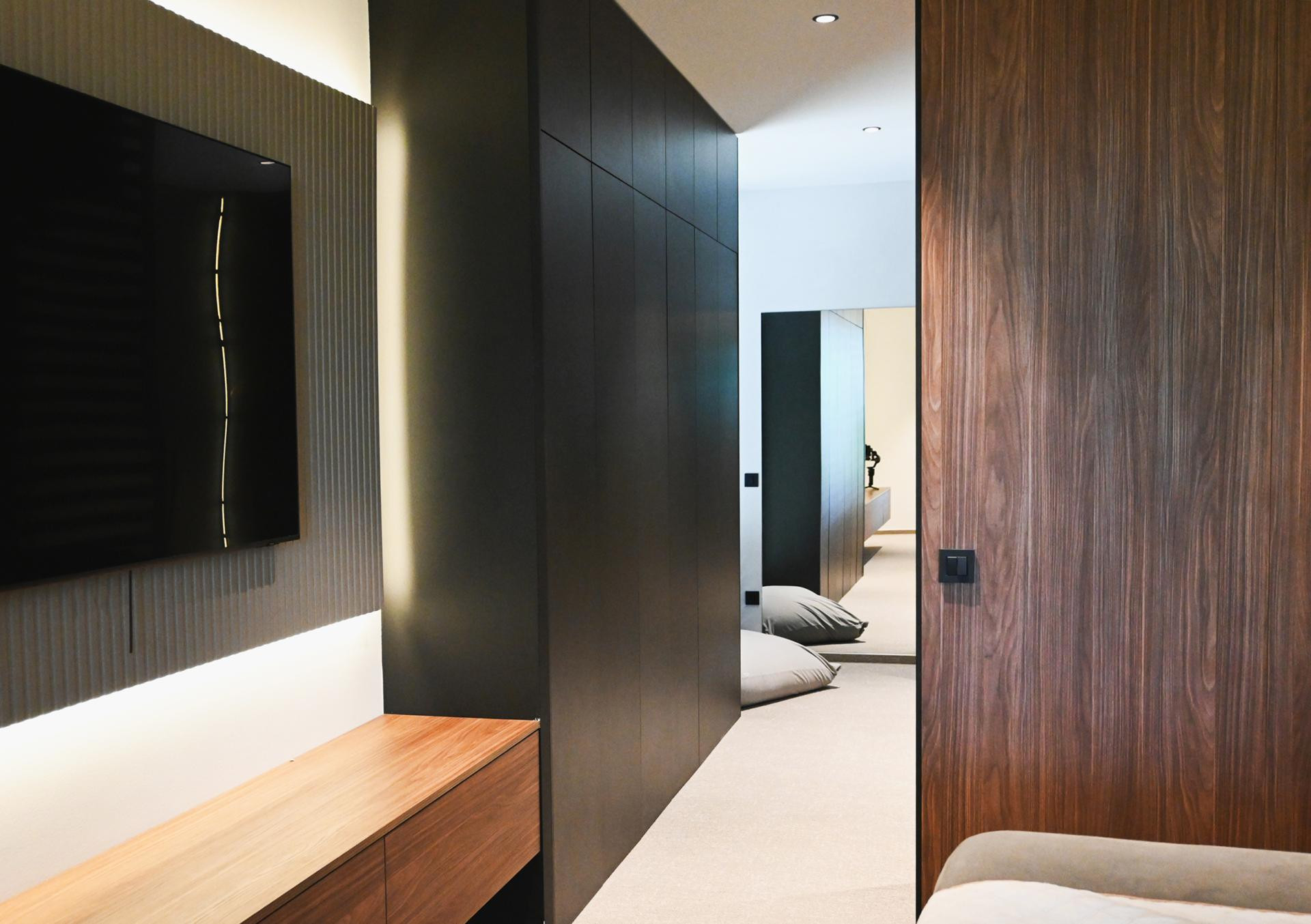 Na katu je glavna spavaća soba s garderobom i kupaonicom uređena u hotelskom stilu, korištenjem tamnijih materijala kako bi se stvorila intimnija atmosfera. Spavaća soba ima garderobu koja vodi do prostrane kupaonice. LED rasvjeta u spavaćem bloku pridonosi toploj i umirujućoj atmosferi.