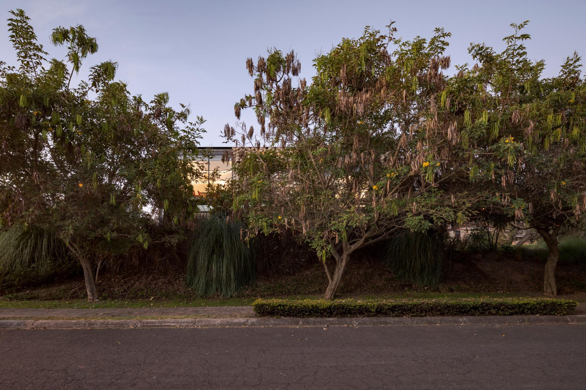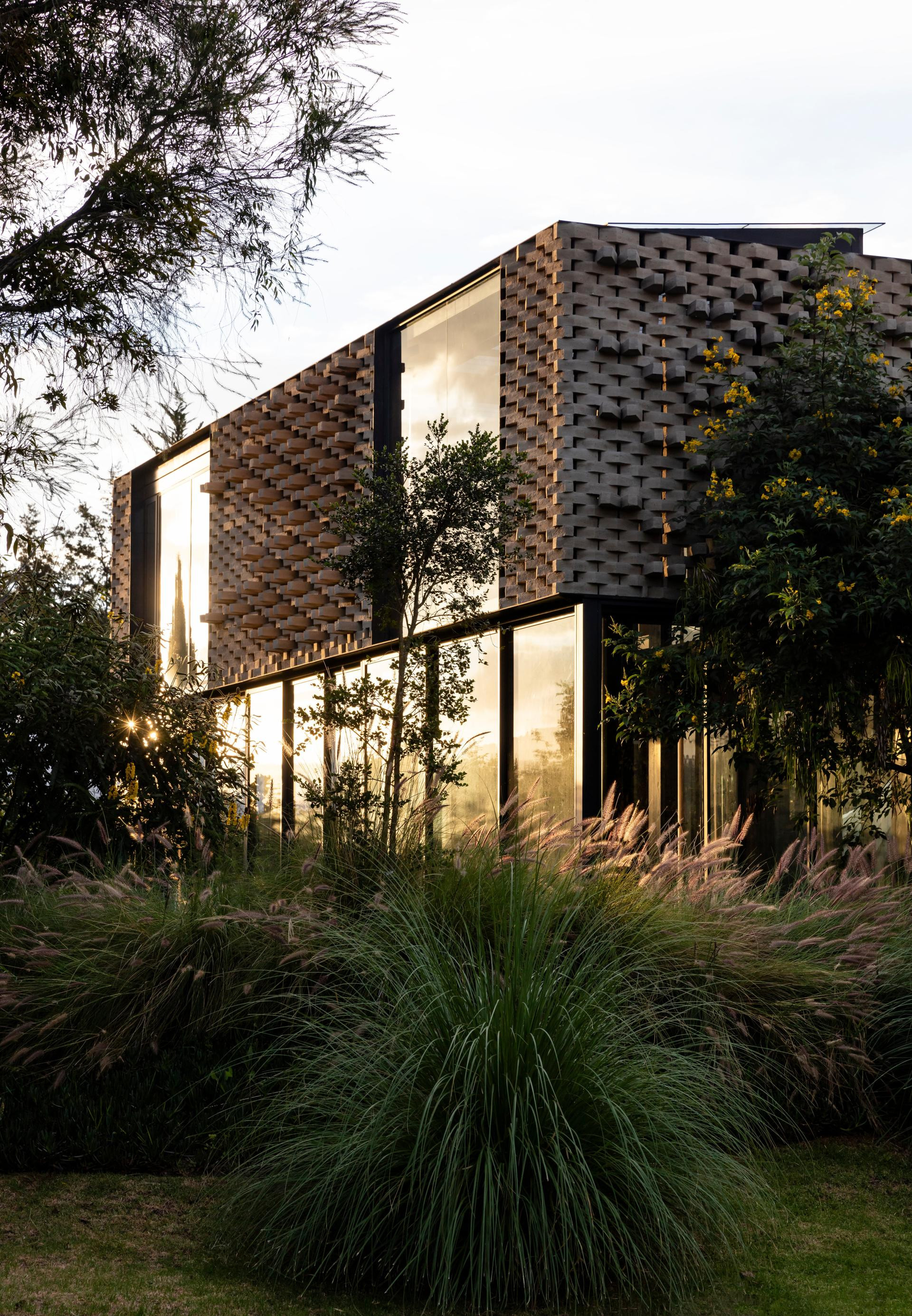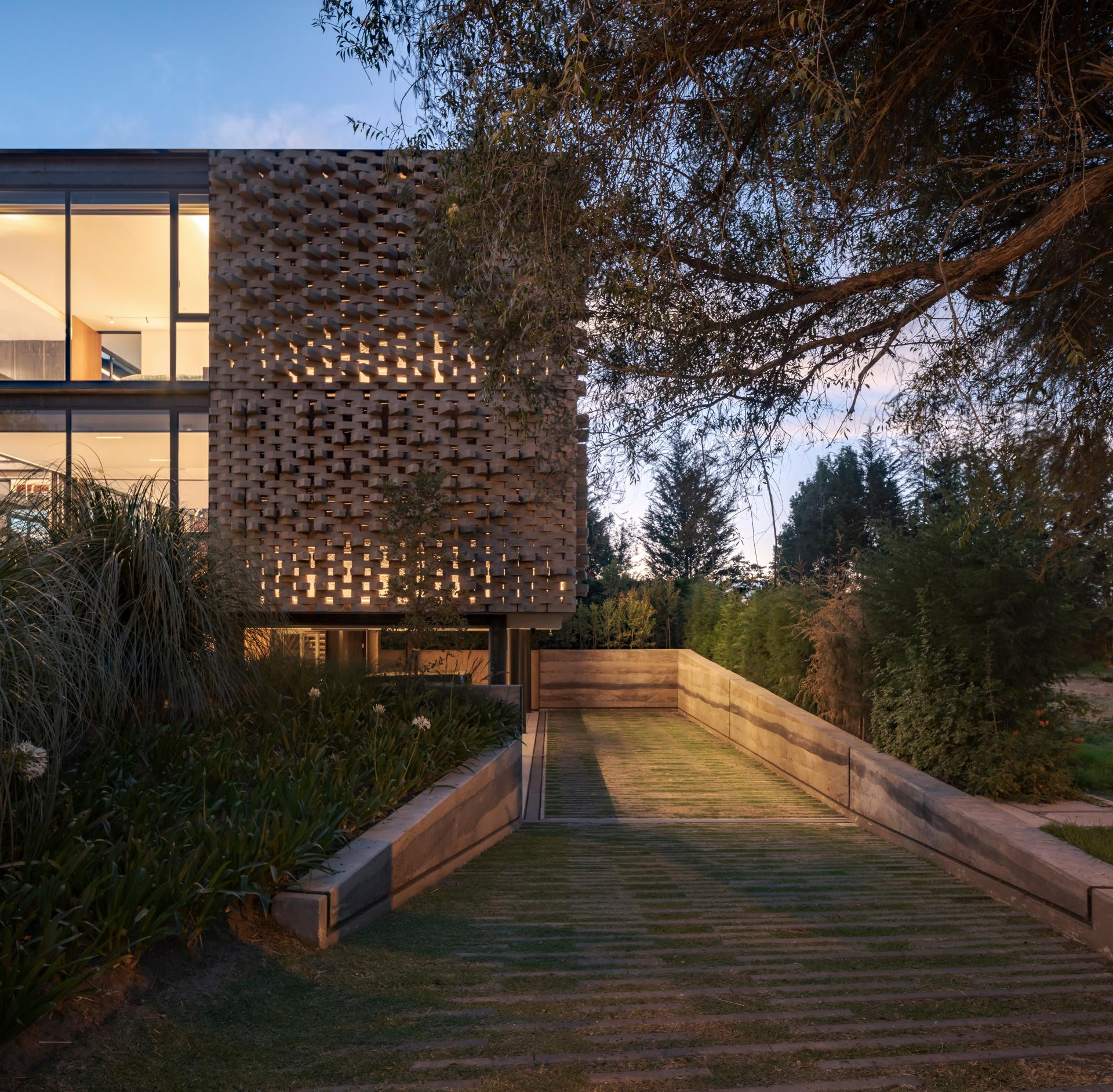 Oblikovno, kuća se doima kao kompaktna struktura – monolit koji izranja iz oblikovanog reljefa prekrivenog autohtonom vegetacijom. Pristup joj vodi kroz zemljane humke, urezane poput staza koje podsjećaju na povijesne andske puteve Chaquiñán, čime se ulazak u kuću pretvara u iskustvo postupnog uranjanja u prostor.