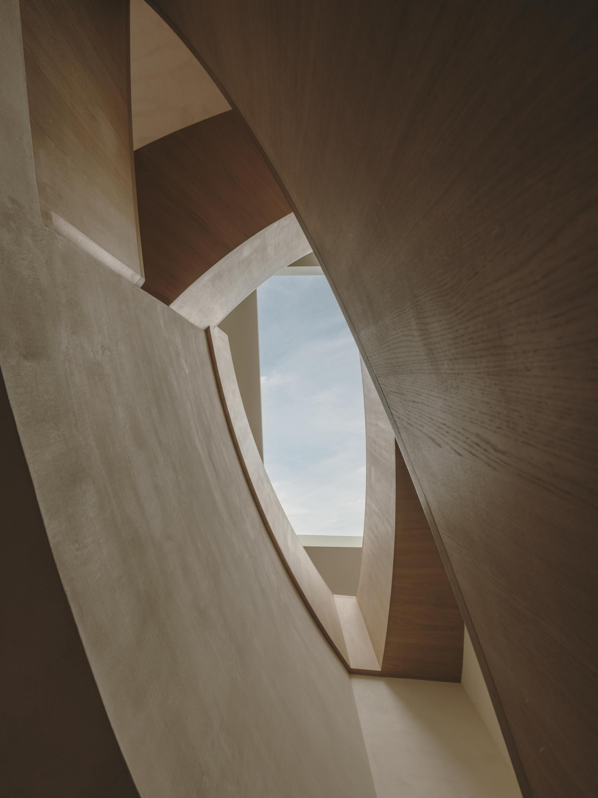 Stubište, izrađeno od toplog hrasta, valovite je forme i proteže se kroz sve razine kuće, od podruma do najvišeg kata. Ono nije samo funkcionalni element, već postaje središnji skulpturalni akcent doma. Svjetlost koja prodire kroz svjetlarnik pleše po površinama drva, stvara igru sjena i tonova te oblikuje atmosferu koja istovremeno inspirira i umiruje. Taj element stubišta odražava filozofiju studija, drvo nije samo materijal, ono je struktura, prostor i emocija. Svaki komad hrasta, svaka drvena ploča i obloga pažljivo su odabrani, izrađeni i integrirani u arhitekturu, dajući interijeru ne samo estetsku, već i taktilnu vrijednost.