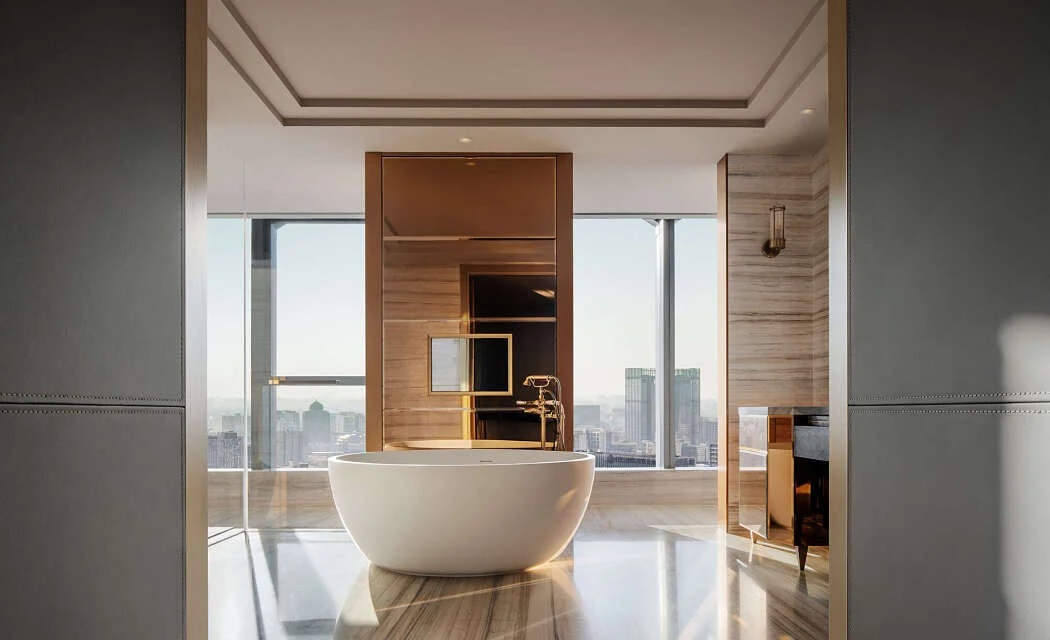 Kupaonice penthousea nisu ništa manje luksuzne, a ono po čemu su posebno zanimljive jest kombinacija drva i stakla. Drvo je prirodni materijal koji u prostor unosi dašak prirode među hladnije materijale te će uvijek 'ugrijati' svaki interijer, dajući mu pritom određenu dozu intime. S druge strane, stakleni prozori u svaku kupaonicu unose potrebnu količinu dnevne svjetlosti i usput omogućavaju predivan pogled na grad.
