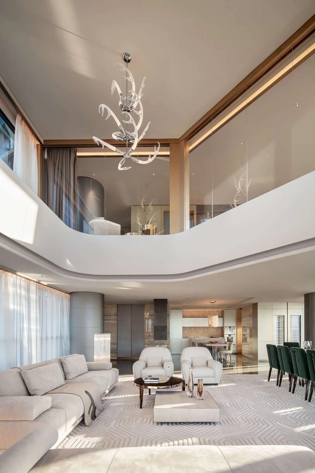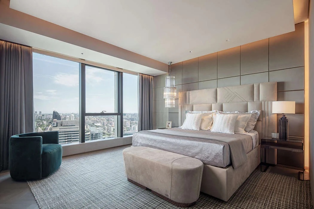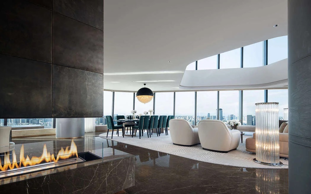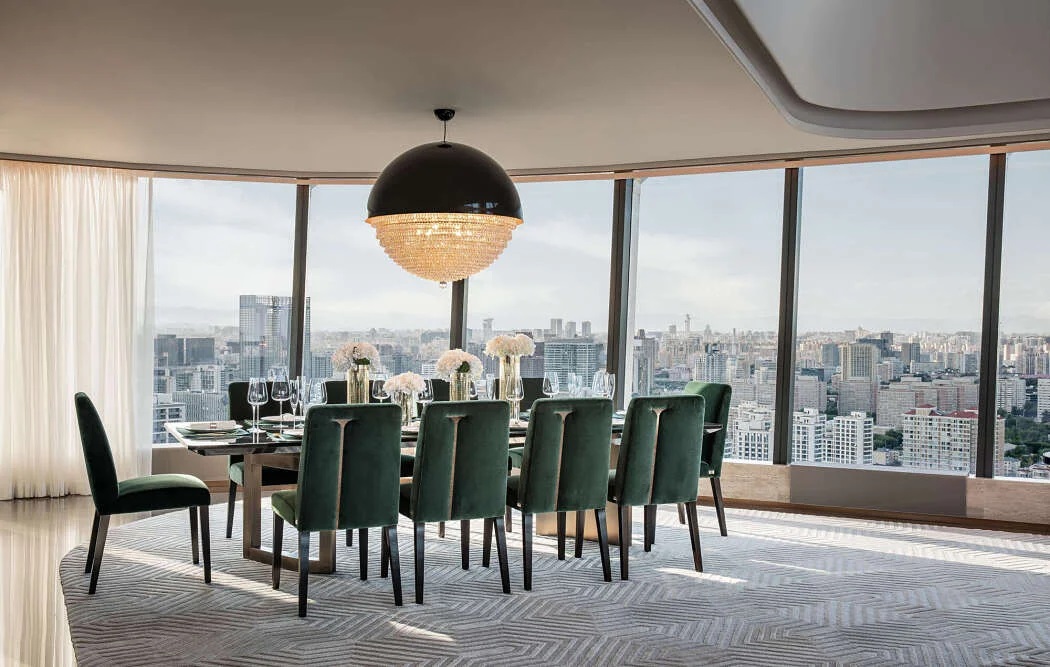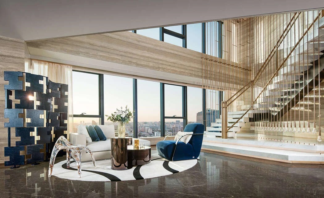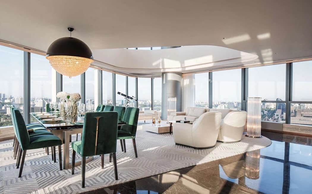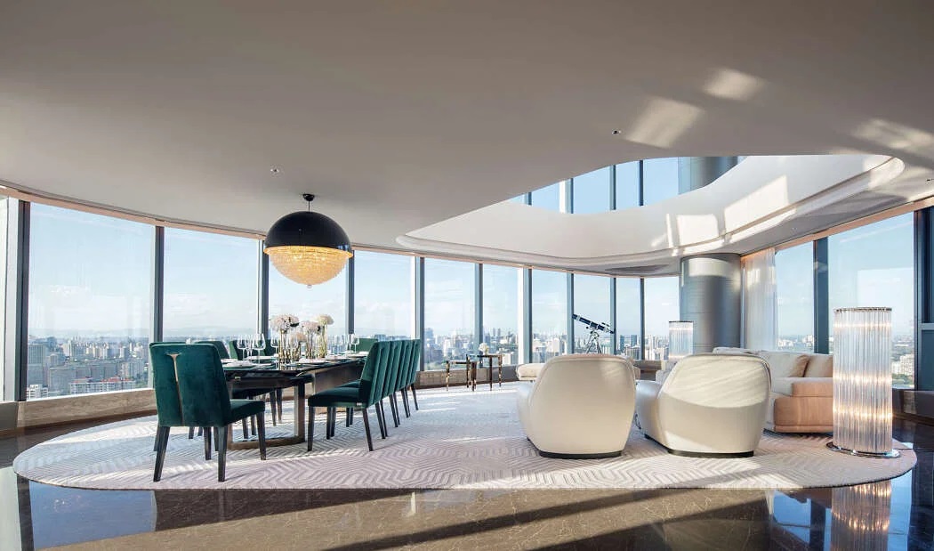 Već pri samom ulasku u stan, ne možemo ne primijetiti zapanjujući krajolik samog centra grada Pekinga. Naime, ogromni stakleni prozori koji se prostiru od poda do stropa pružaju osjećaj koji bi se mogao opisati doslovno kao 'život među oblacima'. Dizajneri su željeli stvoriti prostor koji odražava dozu elegancije koja neće biti zanemarena zbog spektakularnog pogleda koji bi mogao privući svu pažnju.