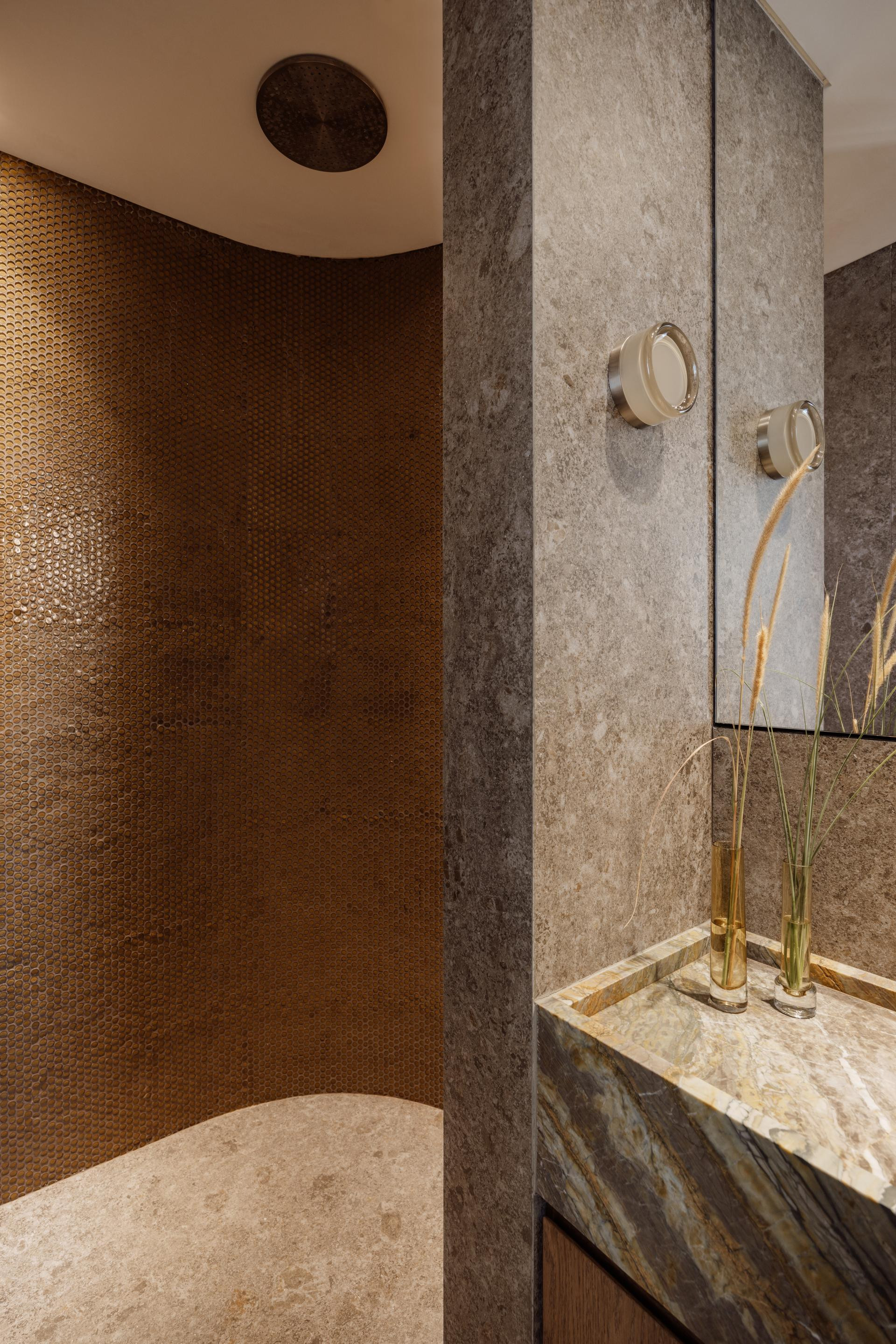 Wellness i biofilni pristup bili su središnji pokretači dizajna. Prirodni materijali, mramor, drvo, teksturirani žbukani premazi, travertino rosso, keramika i nauljeni drveni podovi, odabrani su zbog svoje taktilnosti, autentičnosti i sposobnosti da dostojanstveno stare. Dominacija prirodnih tonova i tekstura doprinosi atmosferi smirenosti i topline.